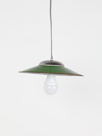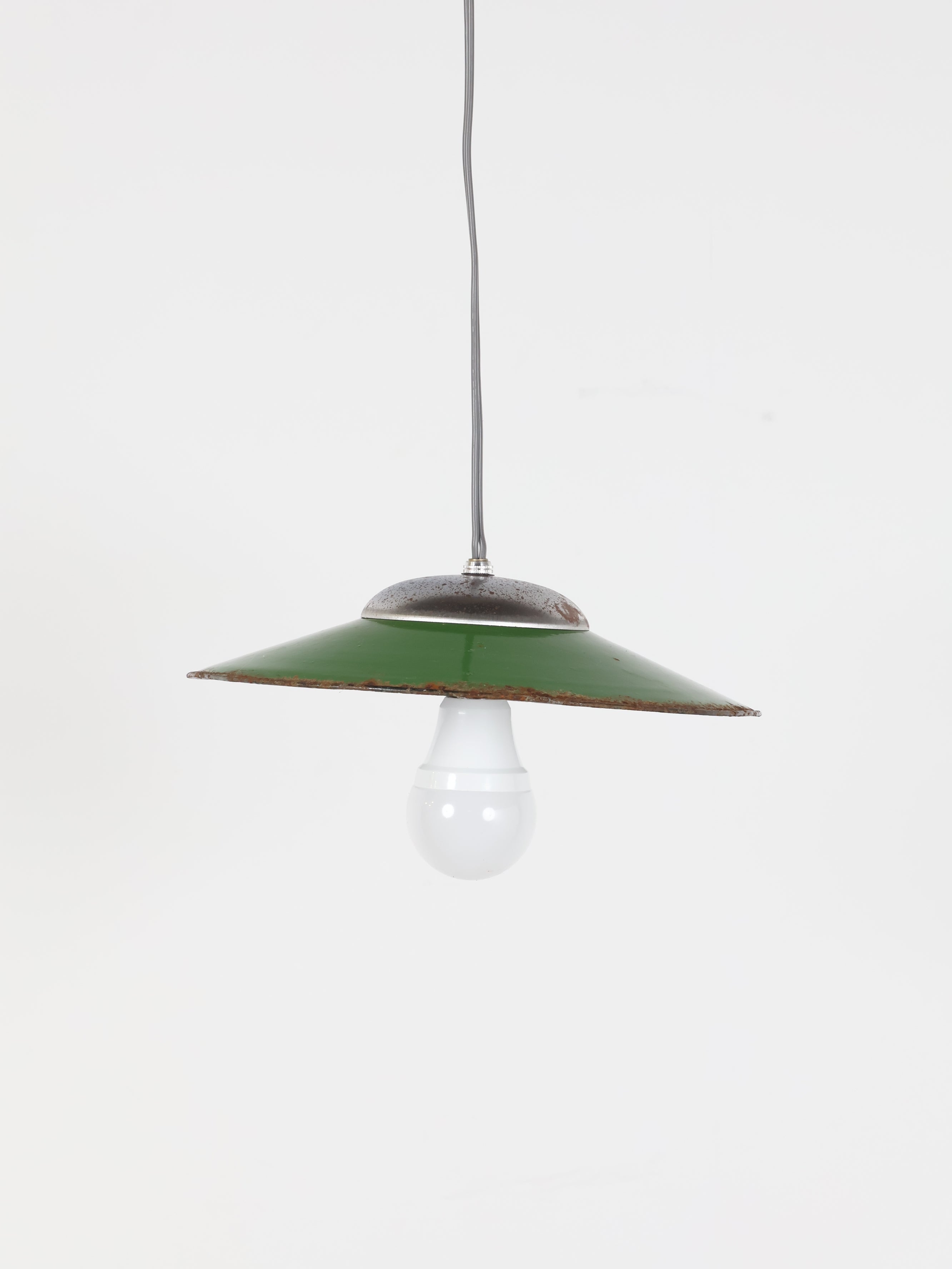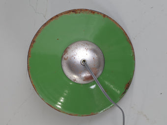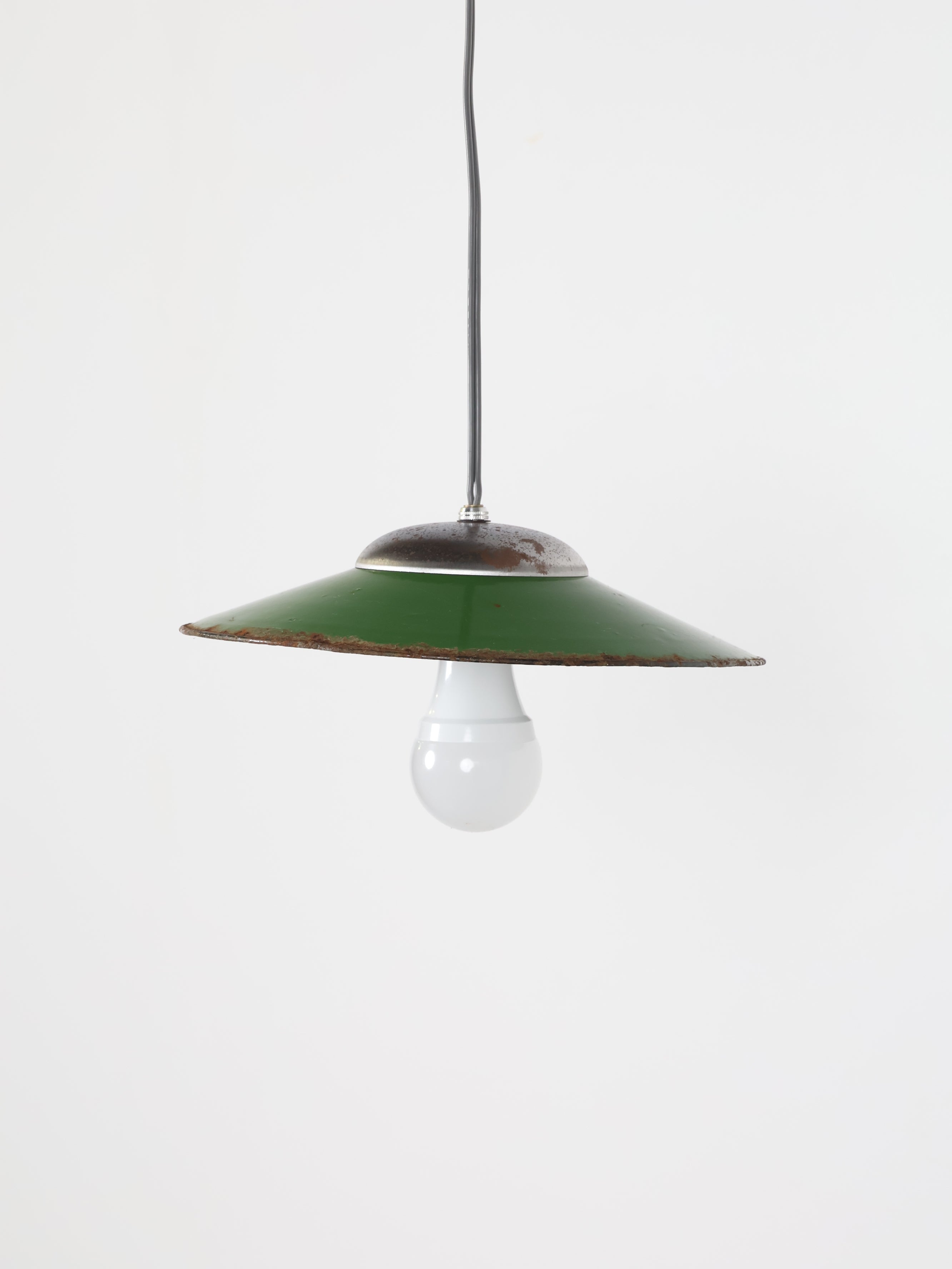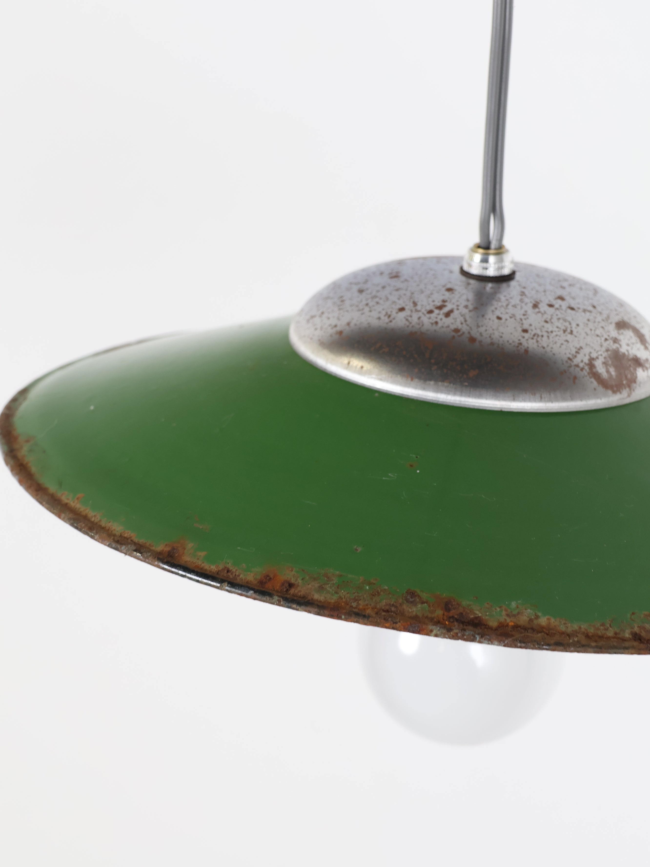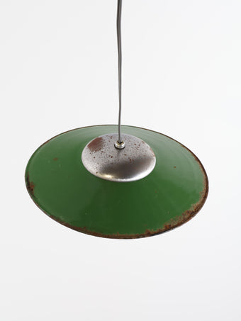 ヨーロッパより買い付けました1950年代-1960年代のインダストリアルグリーンポーセリンペンダントランプです。