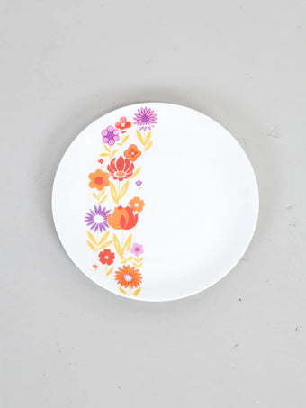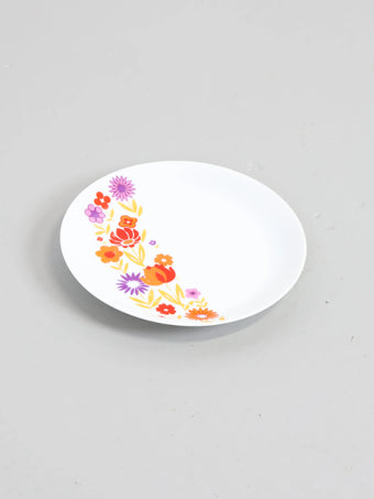 オレンジ・赤・紫と複数色のお花が真っ白なキャンパスにも見えてくるお皿に描かれ、どこか暖かさを感じることのできるデザイン。