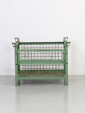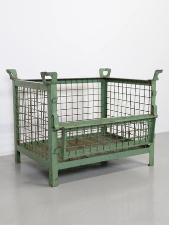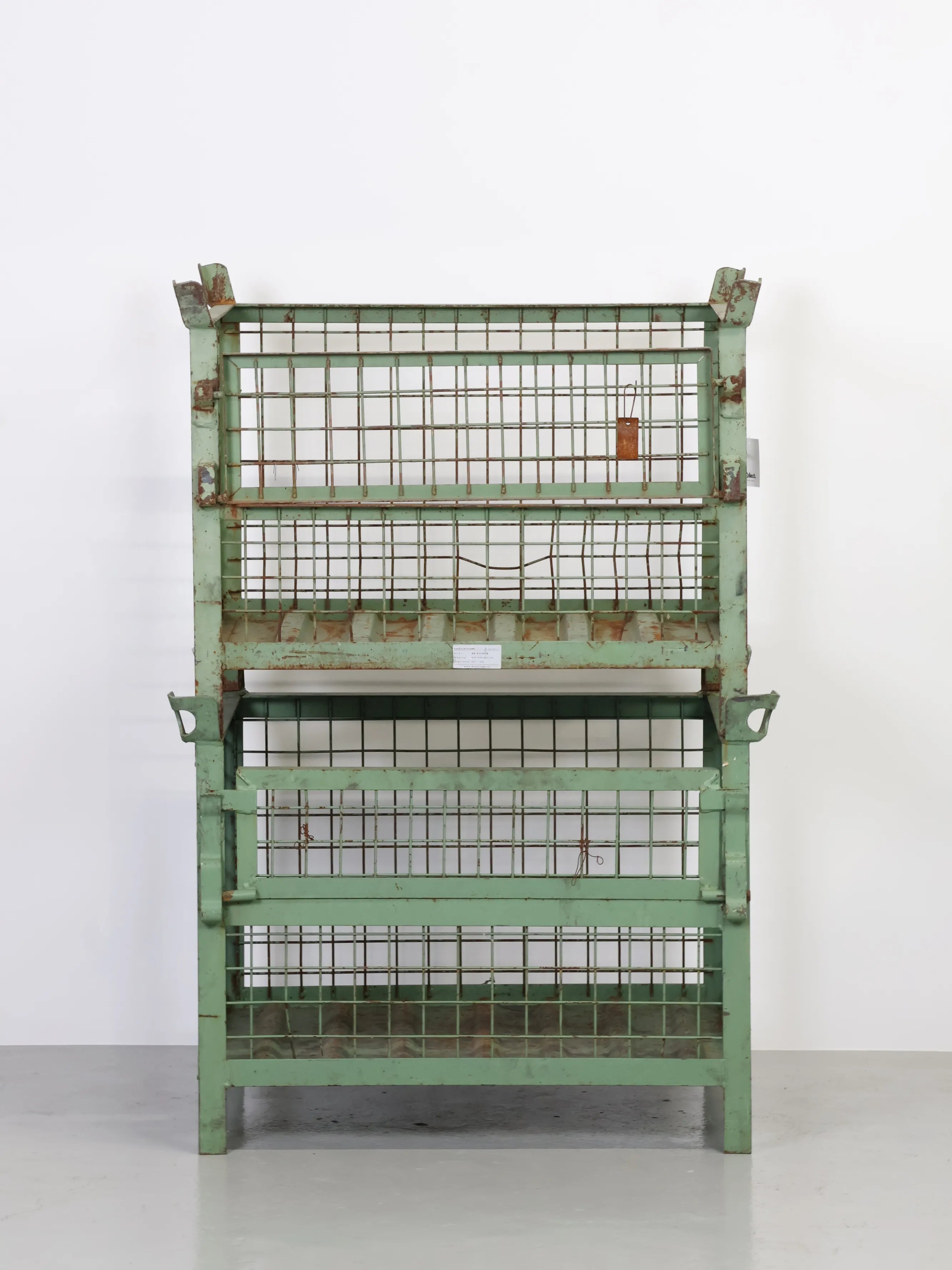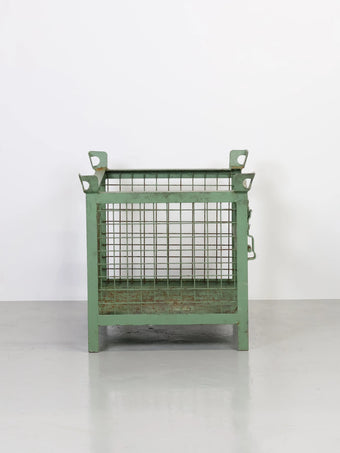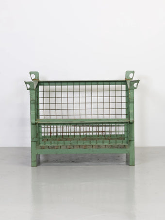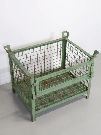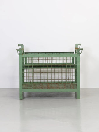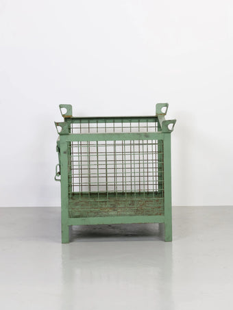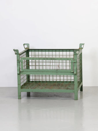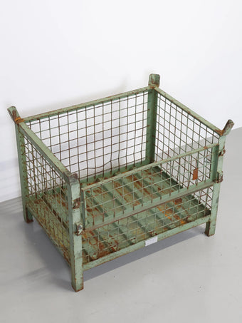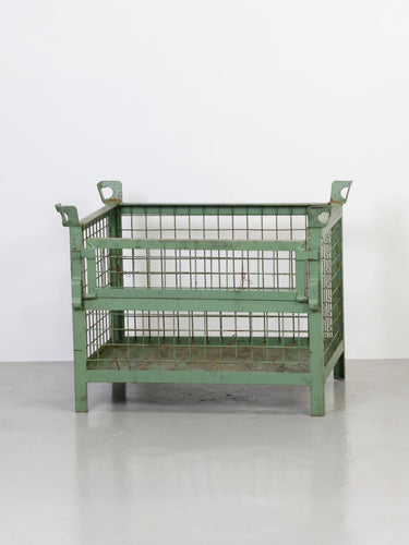 ヨーロッパより買い付けました1970年代-1980年代のライトグリーンメタルスタッキングインダストリアルワイヤーメッシュコンテナです。