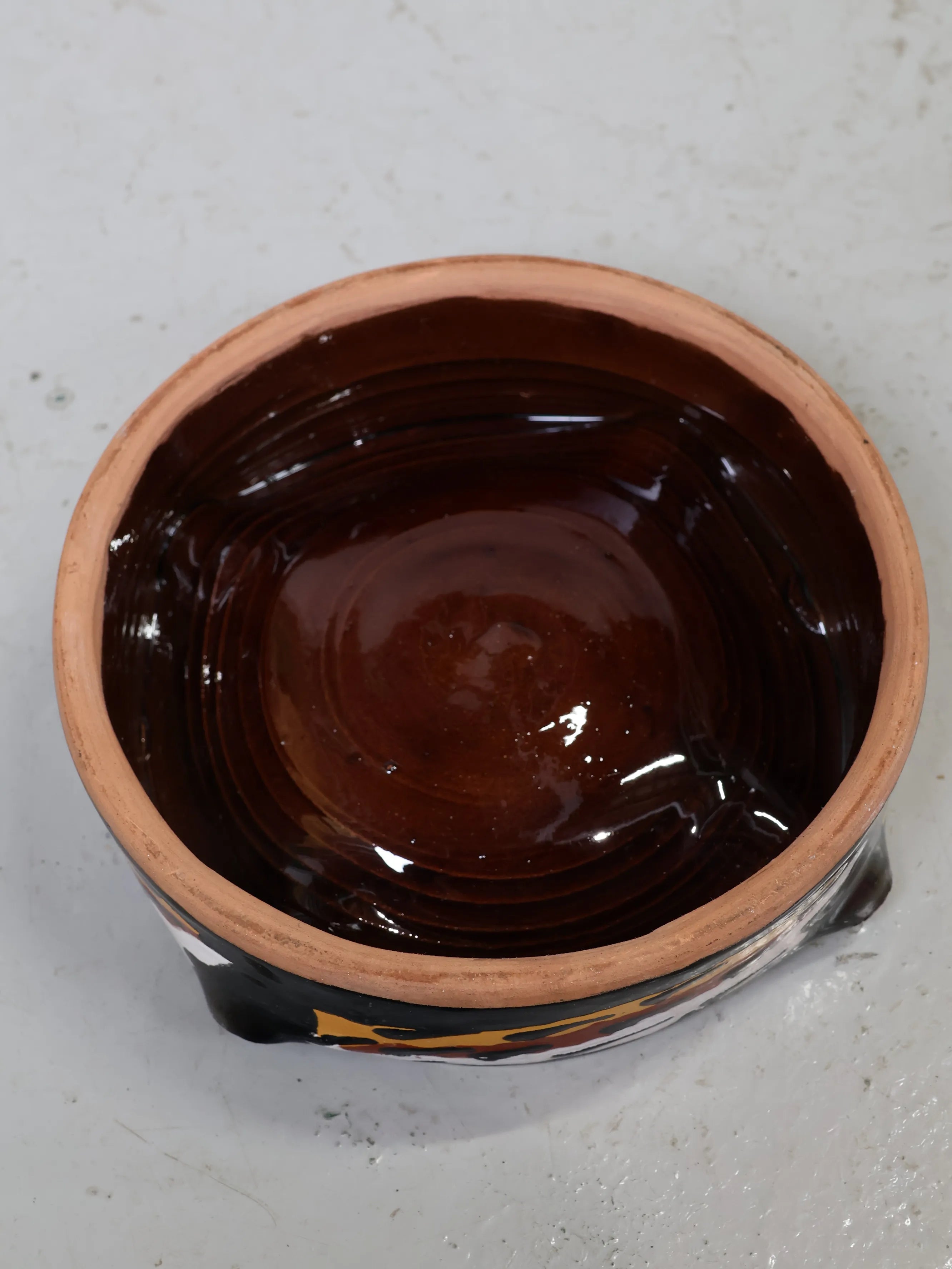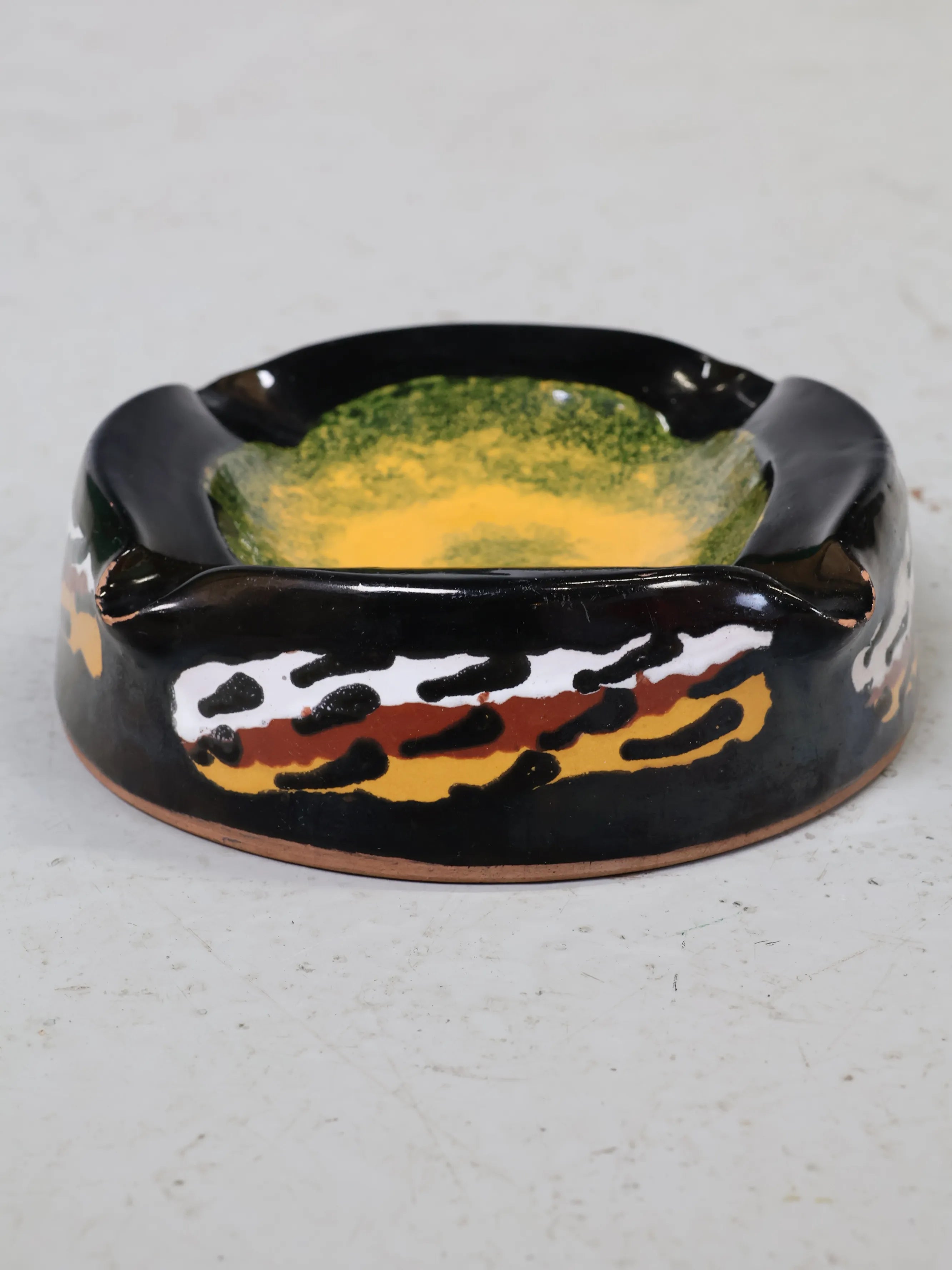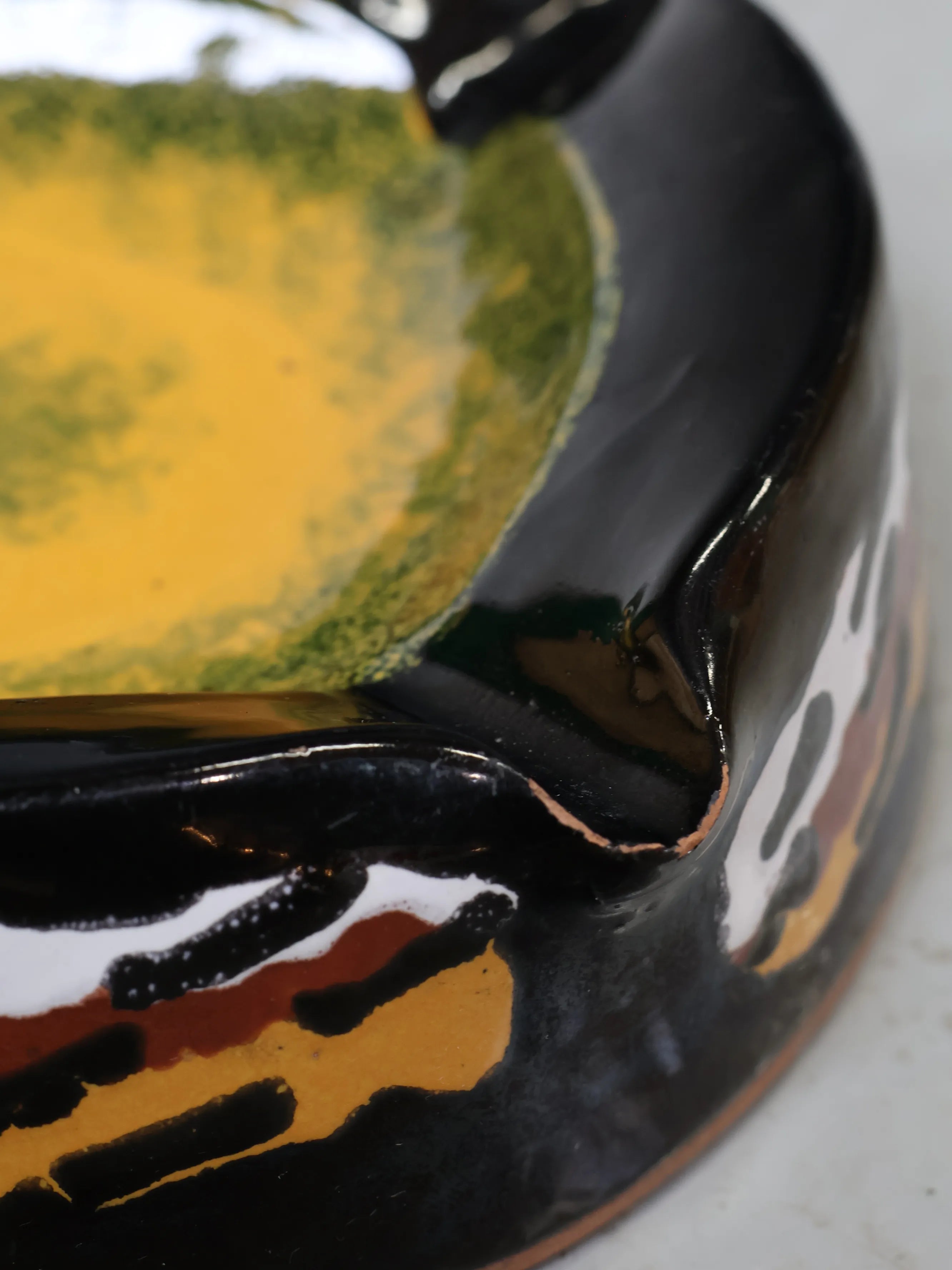 ブラックをベースに、イエローとグリーンが滲むように広がる釉薬表現が印象的で、当時らしい有機的なカラーリングが魅力の一点です。