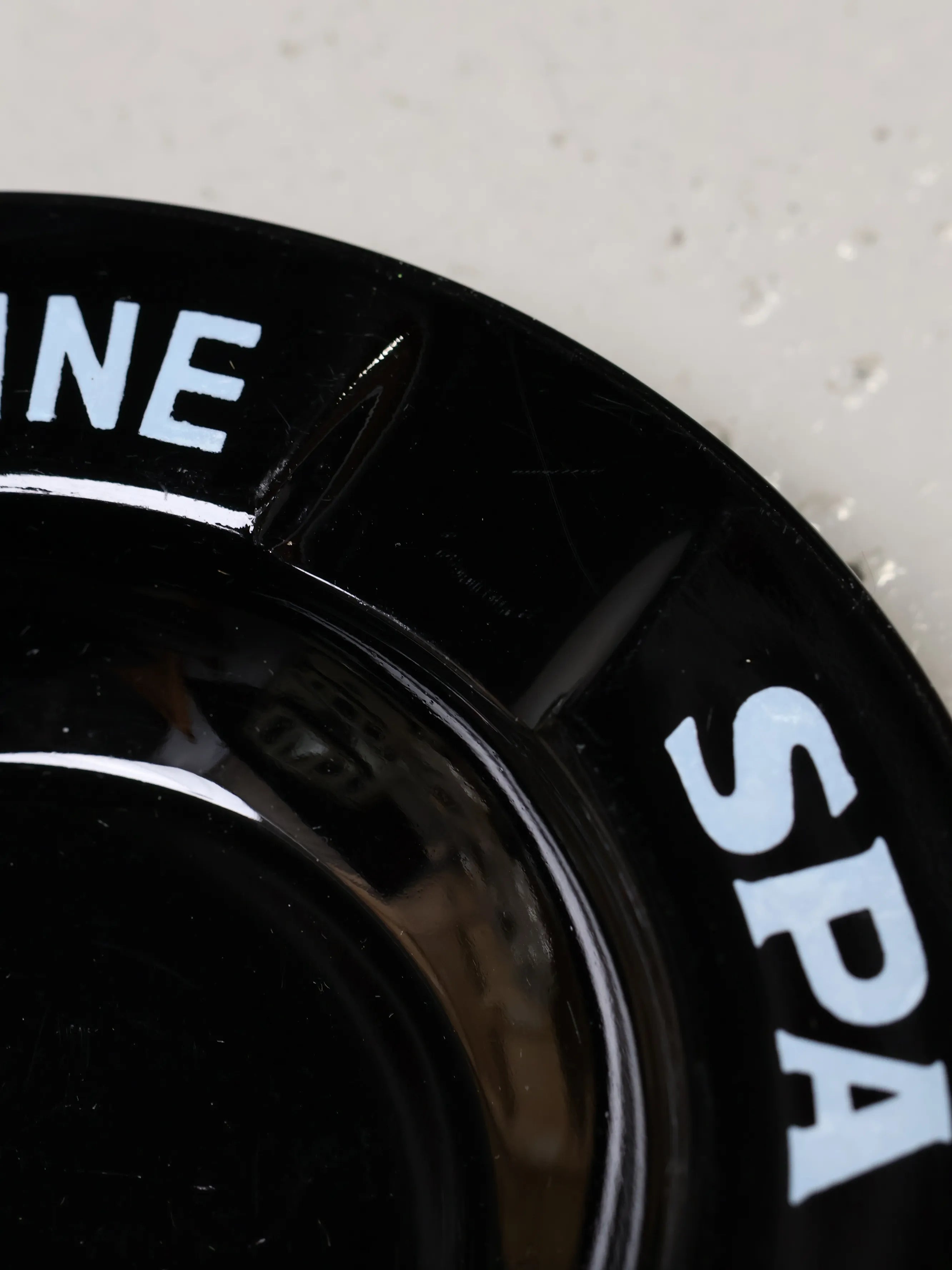 艶のあるブラックガラスに、淡いブルーのロゴがぐるりと配された印象的なデザイン。