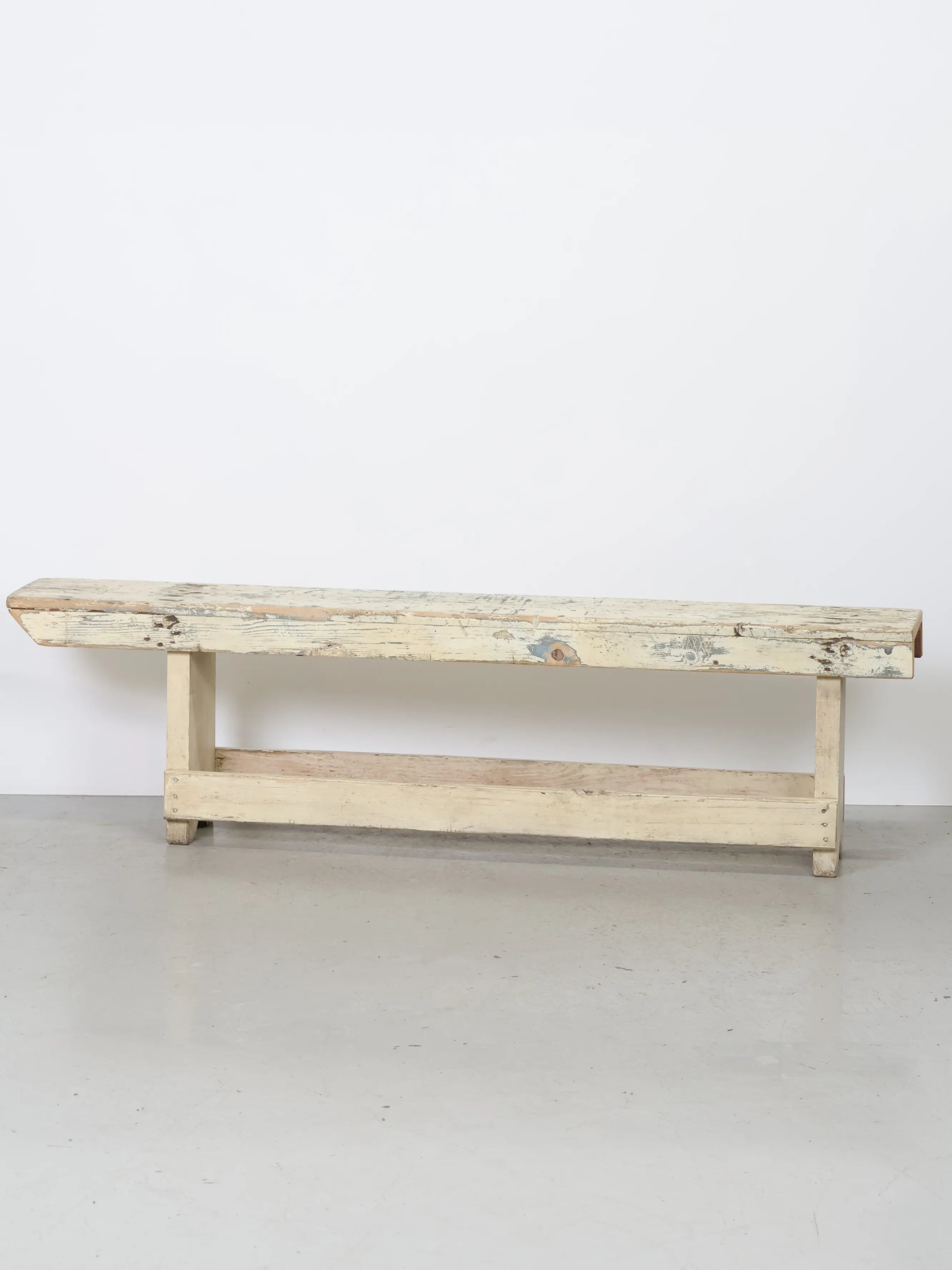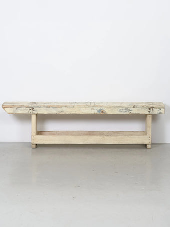長い年月を経て刻まれたペイントの剥がれや擦れ跡が美しい、ヴィンテージベンチ。