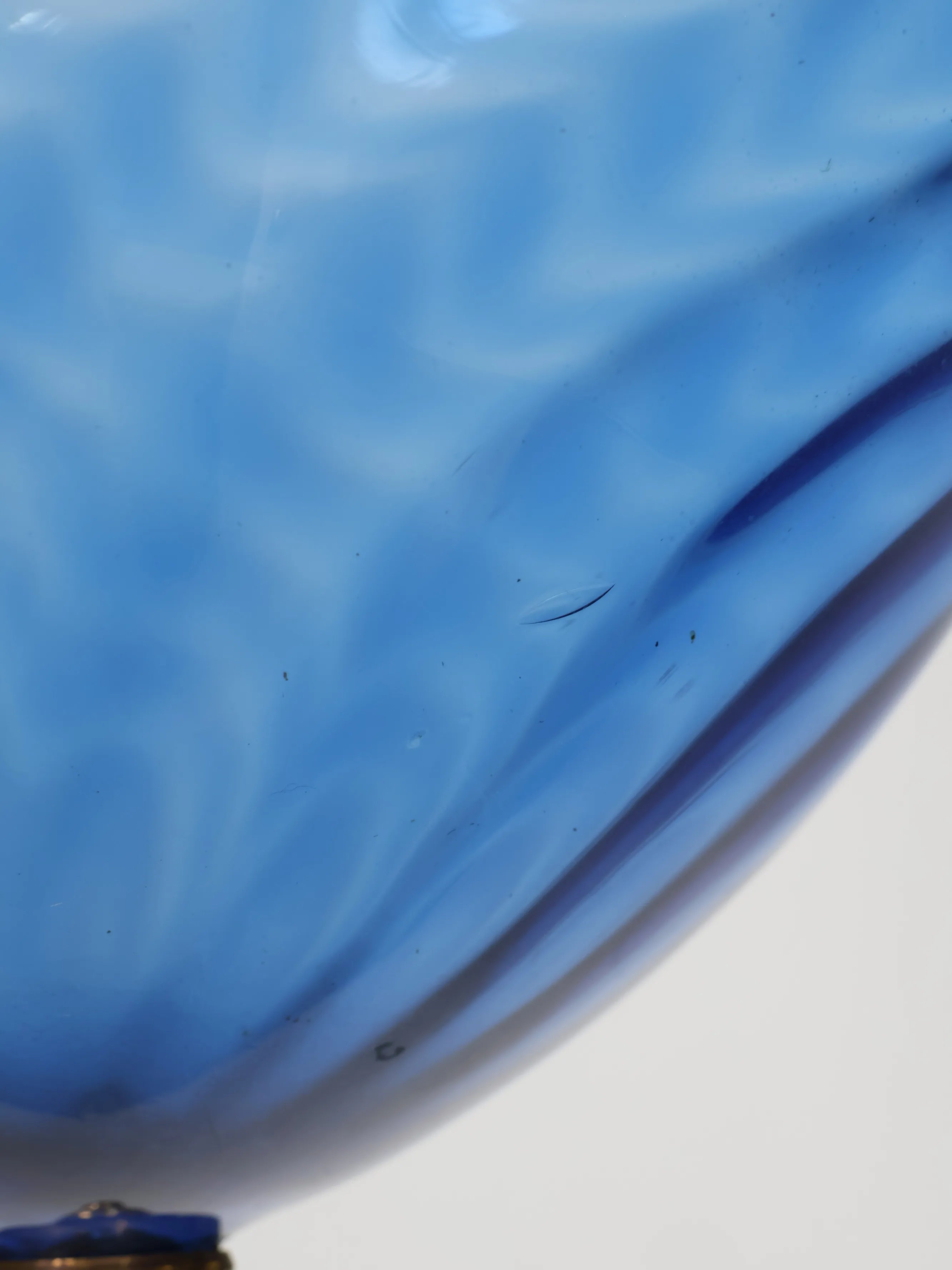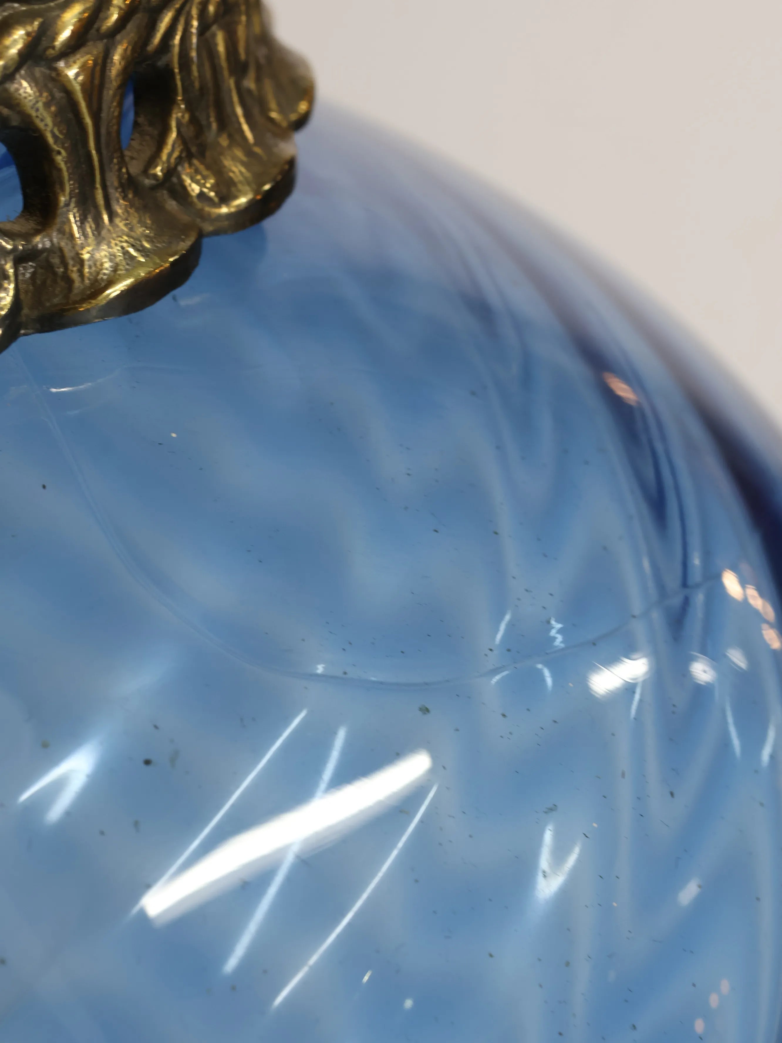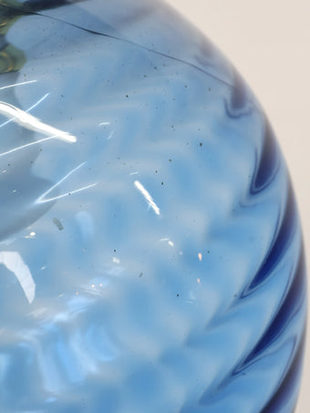 丸みのある半透明のブルーガラスに滑らかなウェーブ状の曲線がデザインされた美しく幻想的な逸品。