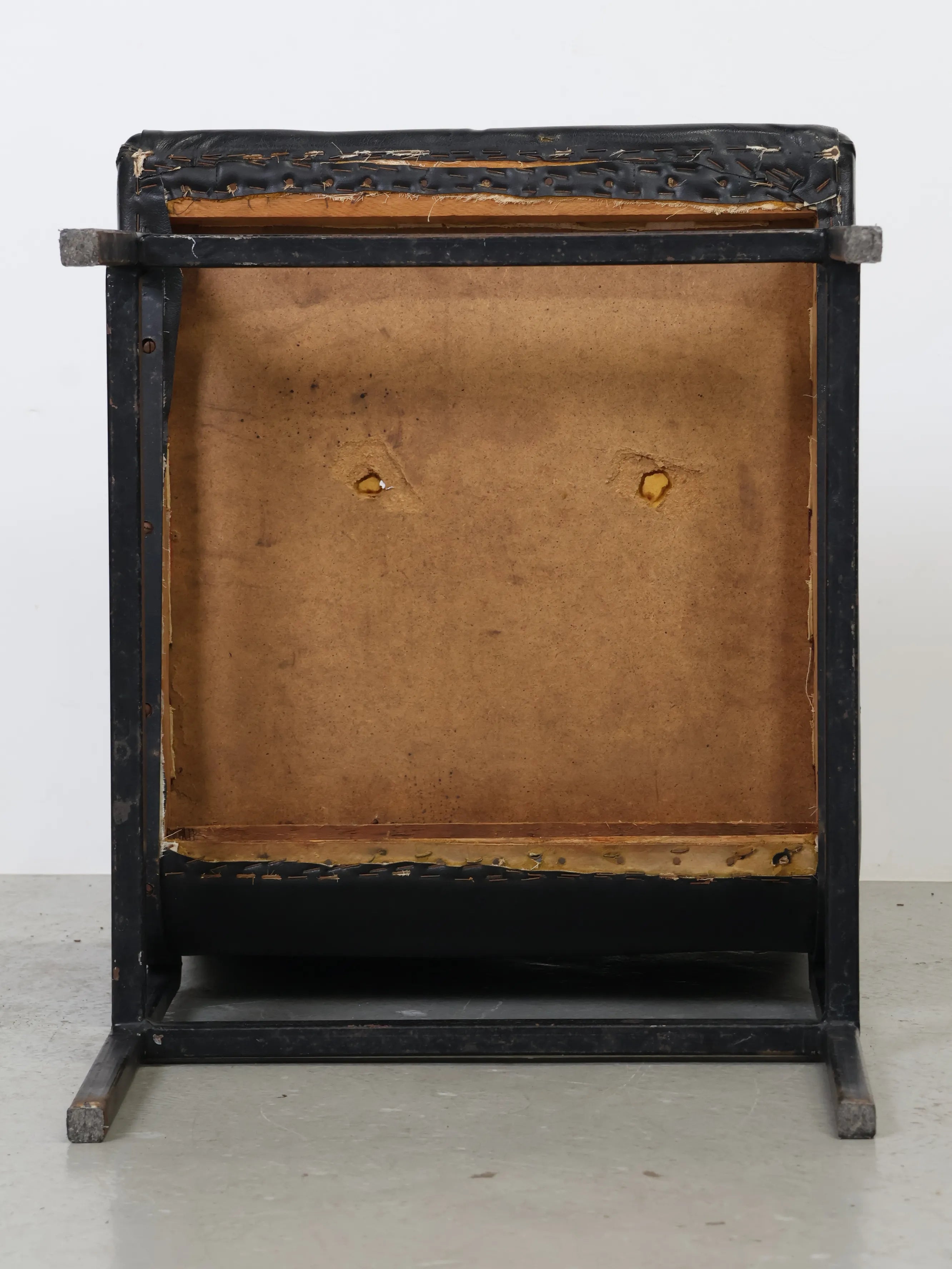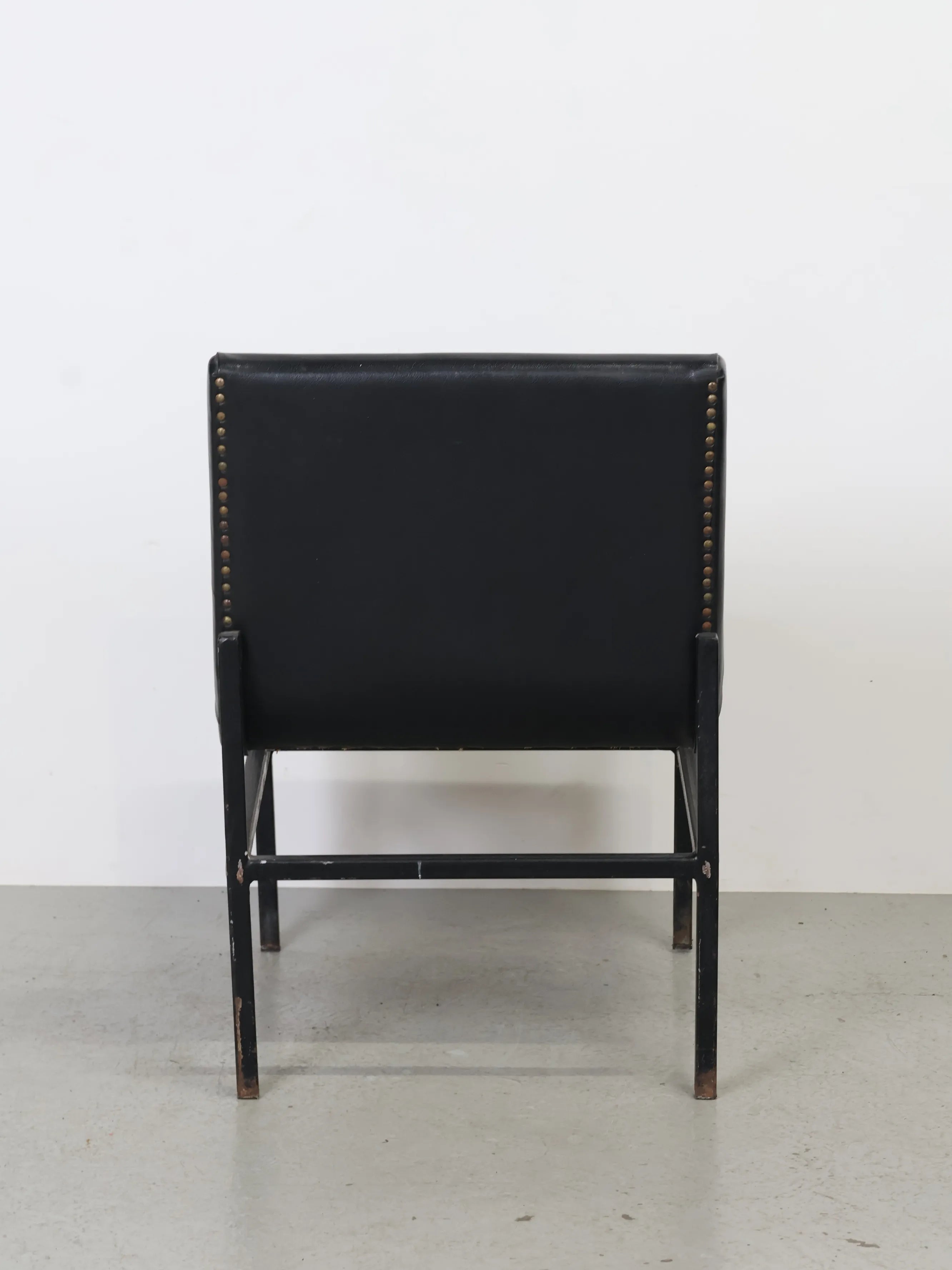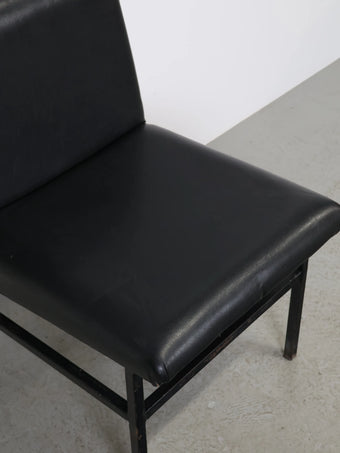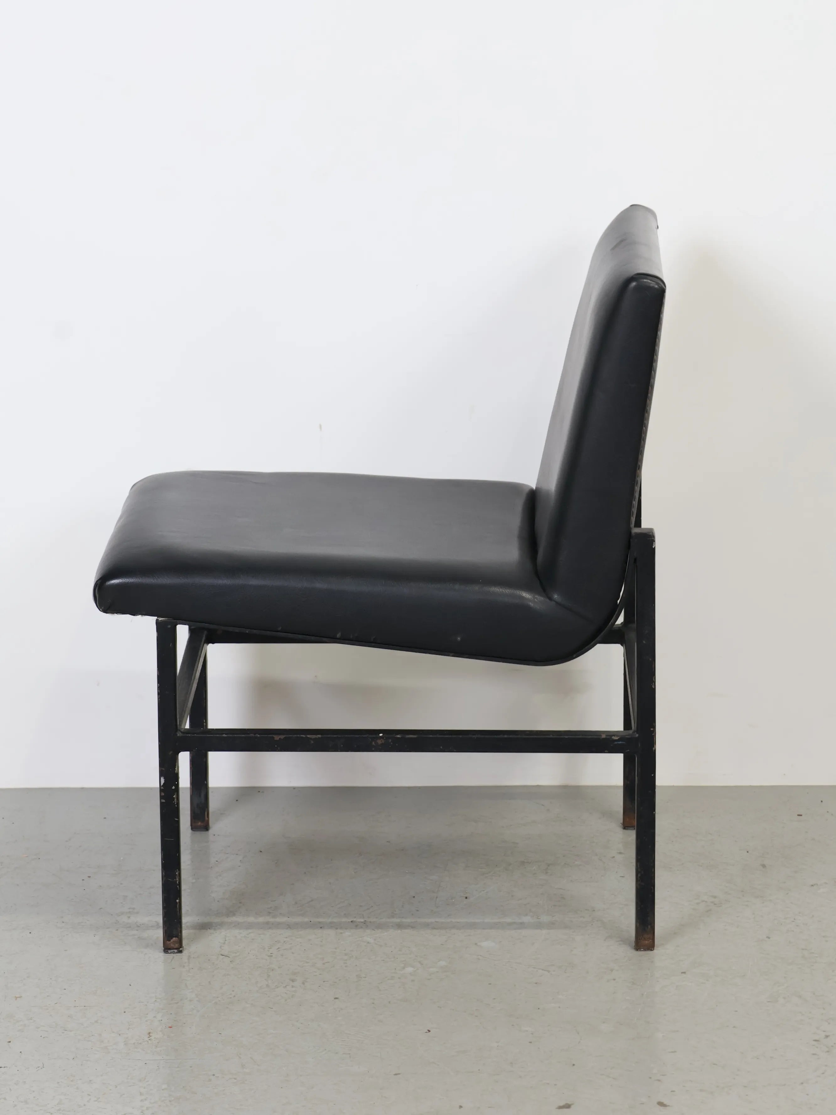 ハンガリーより買い付けたました、シンプルなフォルムに、ブラックのビニールレザーとアイアンフレームを組み合わせた、無骨な雰囲気が魅力の1960-70年代頃のヴィンテージラウンジチェア。