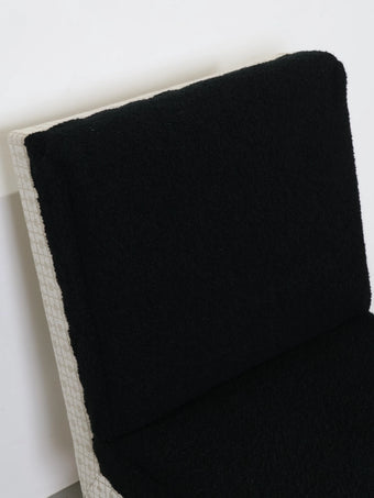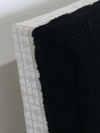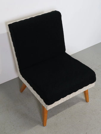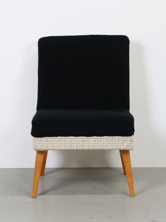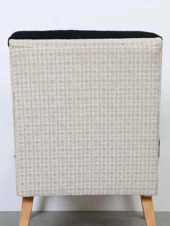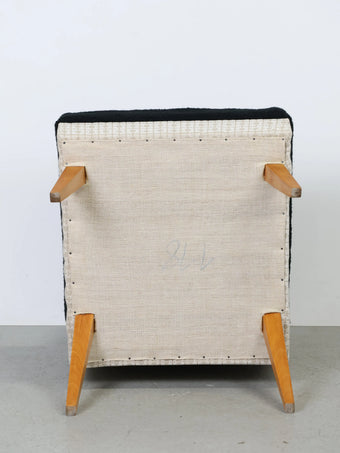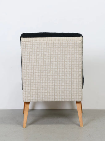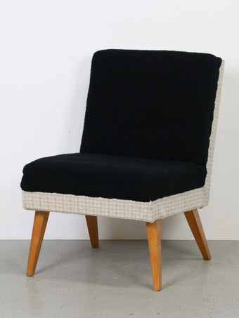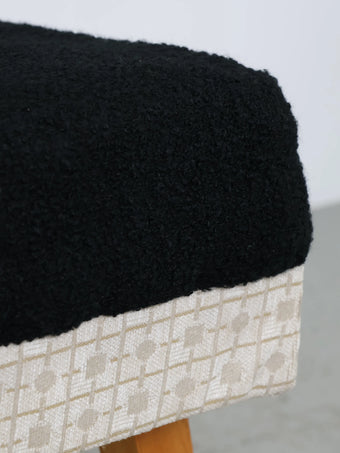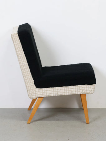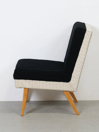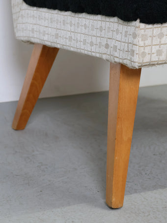ハンガリーより買い付けました、ブラックの起毛ファブリックと幾何学模様の張地を組み合わせたミッドセンチュリーデザインのラウンジチェアです。