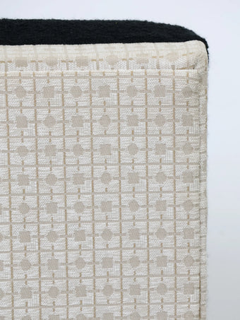背面にはベージュ系の幾何学柄ファブリックを使用し、前後で異なる表情を楽しめるデザイン。