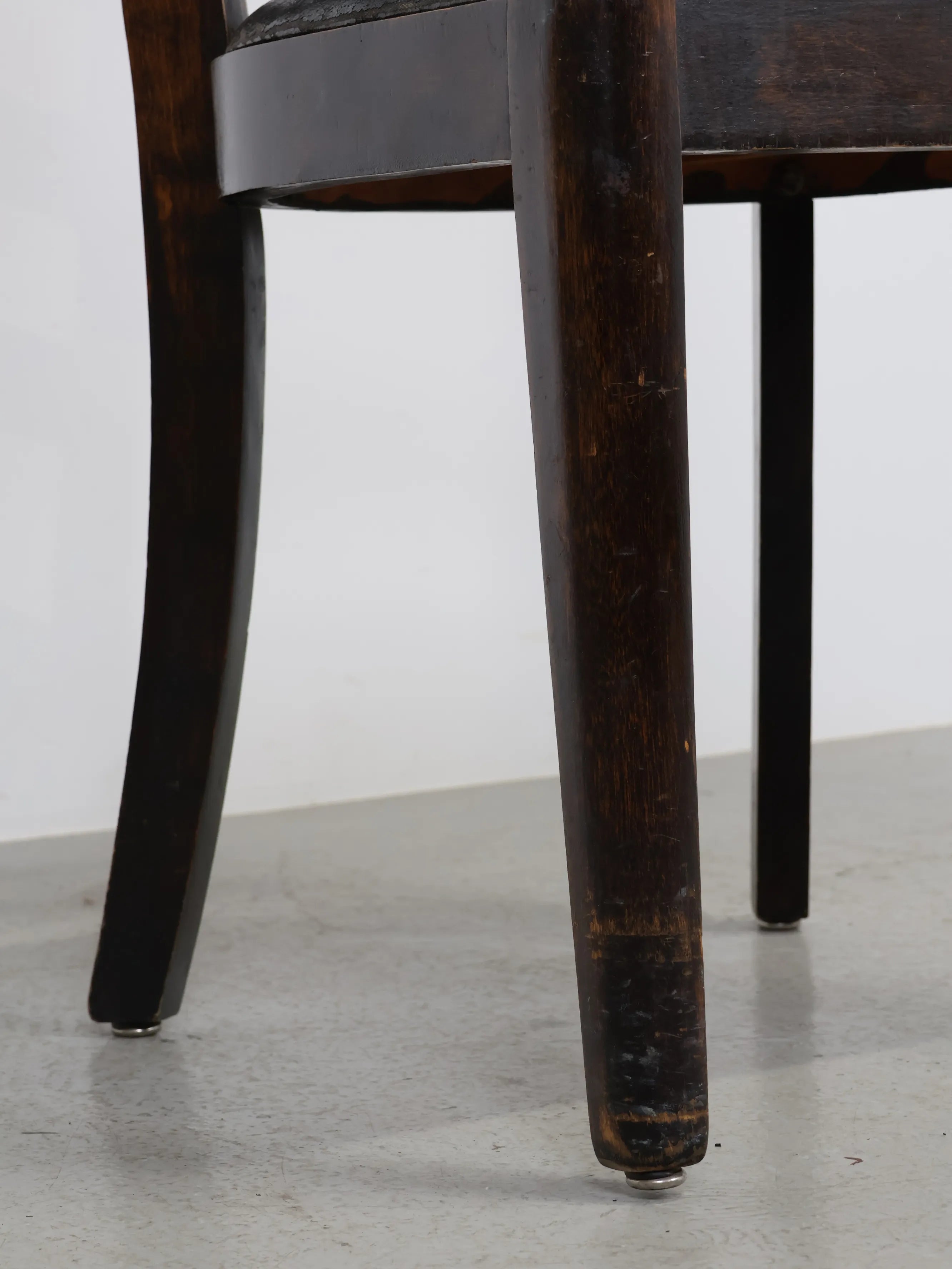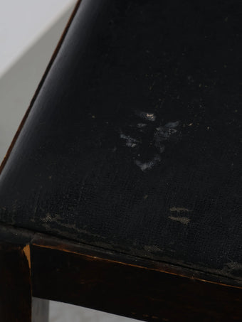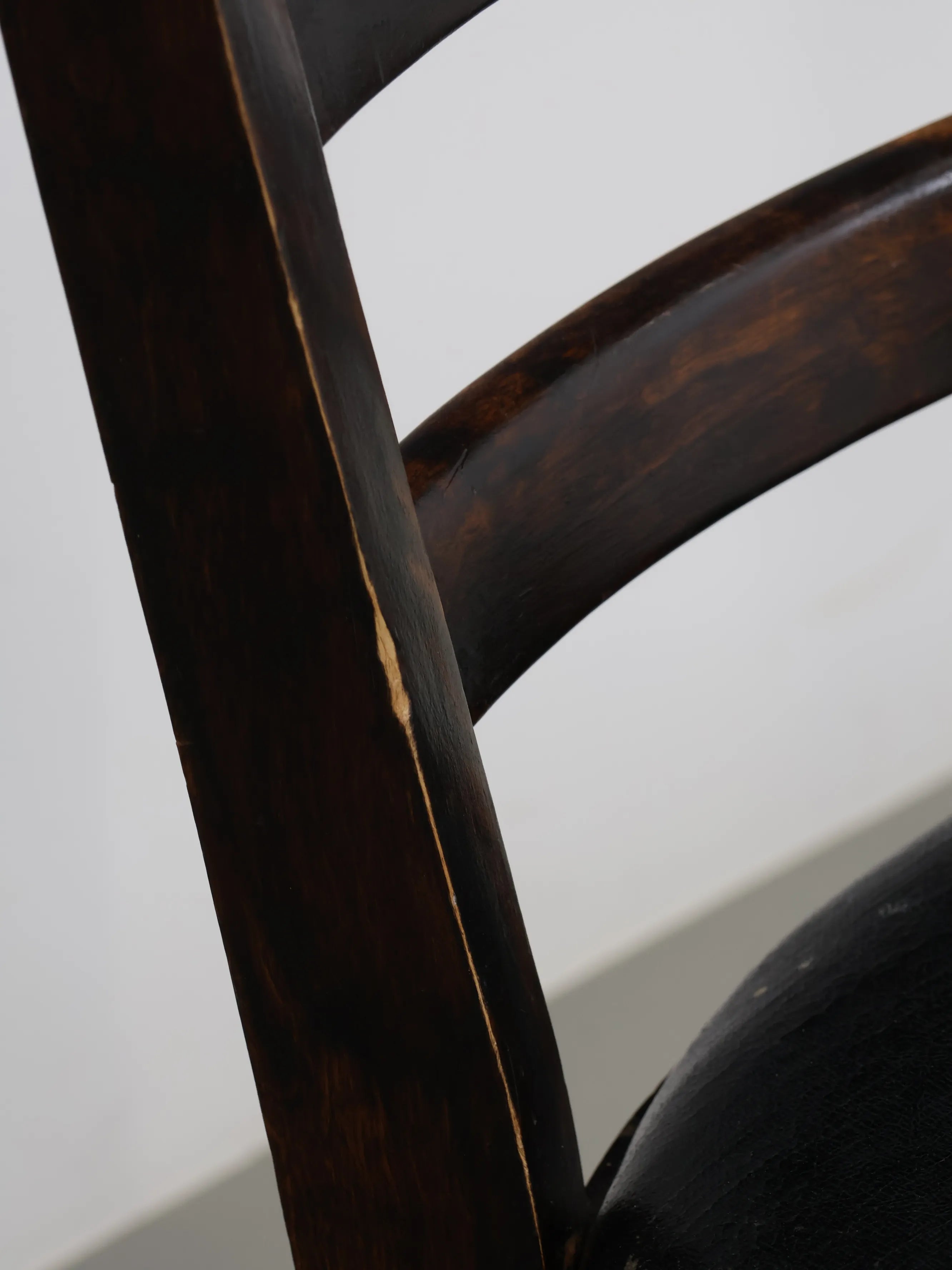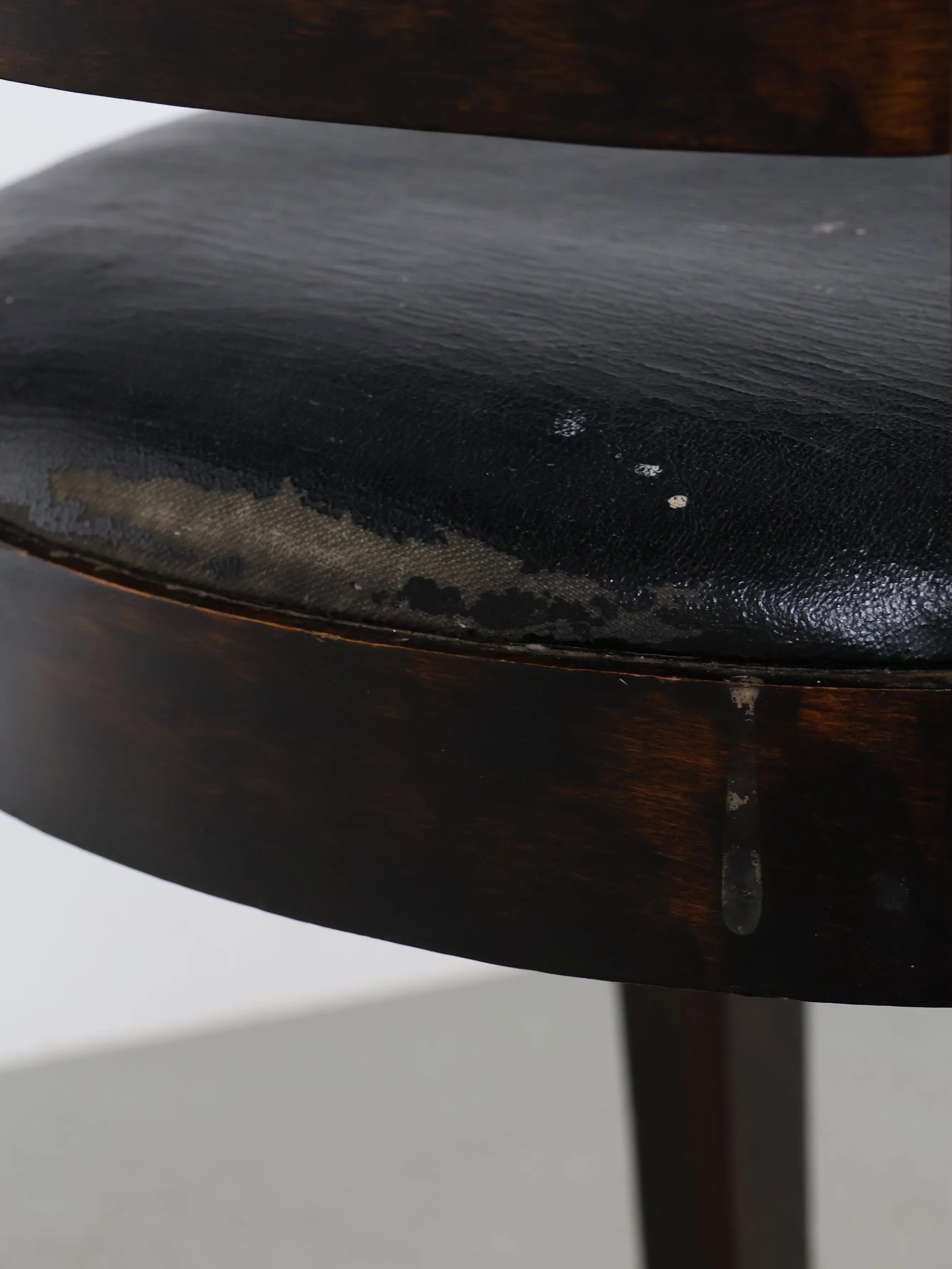 深い色合いのウッドがクラシックな雰囲気を演出し、座面に貼られたビニールレザーがモダンな印象を加えています。