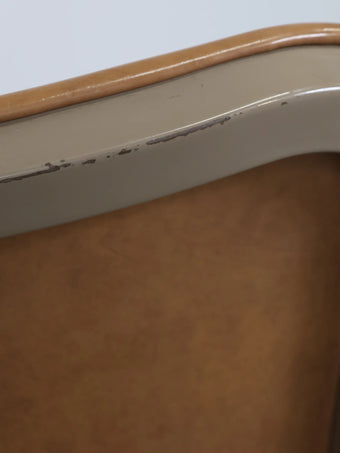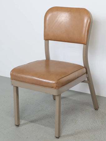 座面と背もたれには、経年変化が美しいキャメルカラーのビニールレザーを使用。