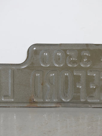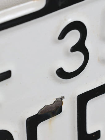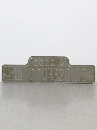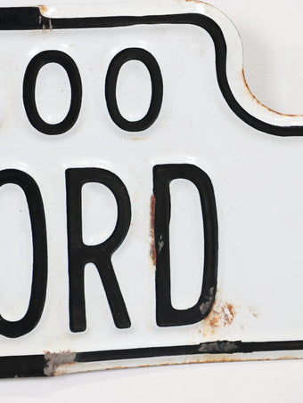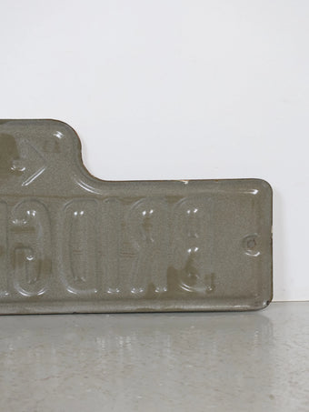 実際に道路標識として使用されていたストリートサインで、ブロックナンバーと矢印、シンプルなレタリングが組み合わさった無駄のない実用的なデザインが特徴の一枚。