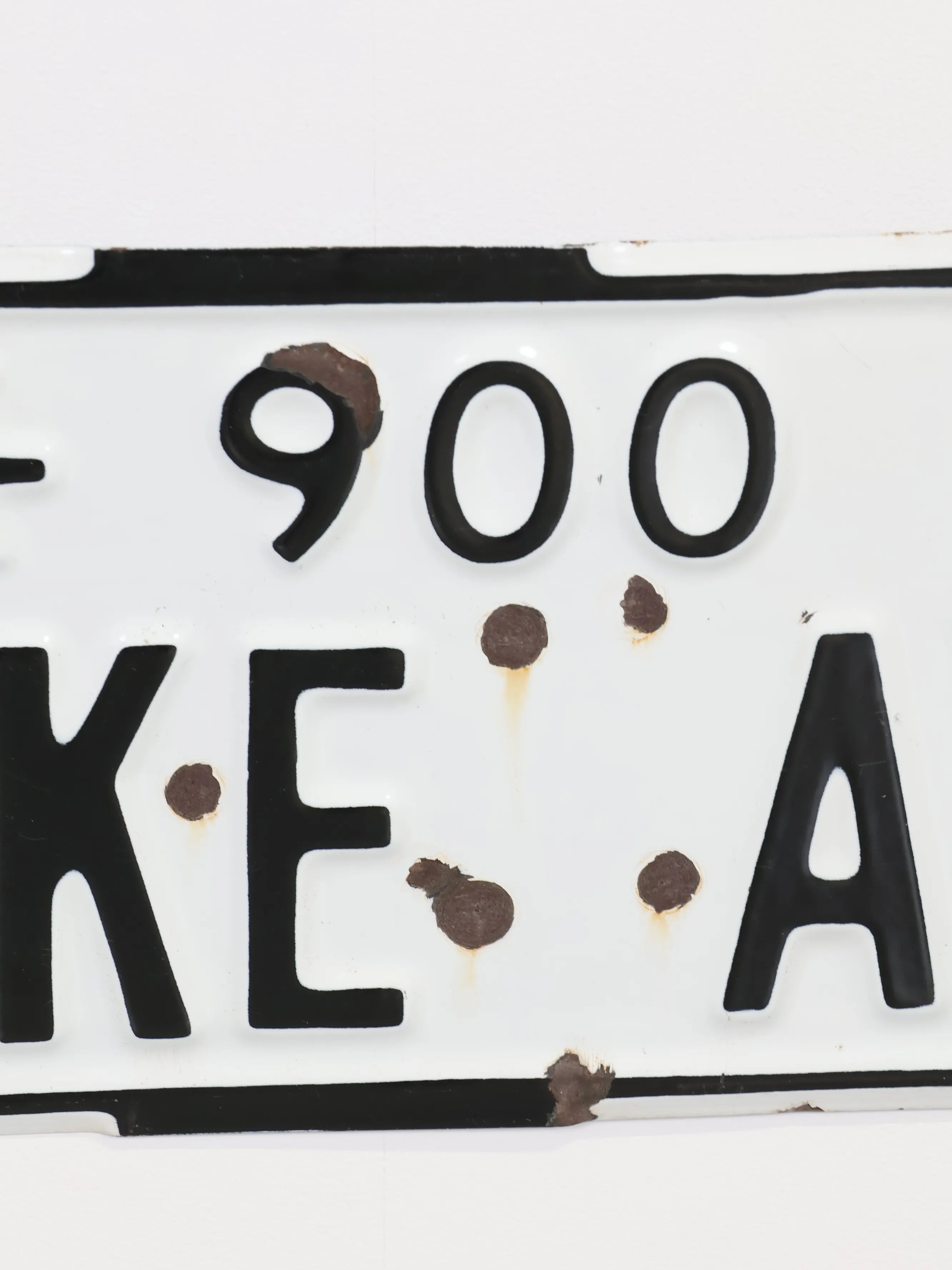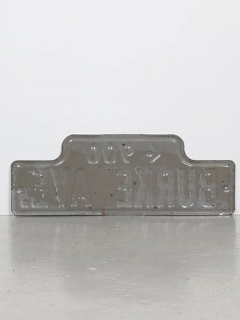 実際に道路標識として使用されていたストリートサインで、シンプルなレタリングと矢印、ブロックナンバーが組み合わさった、アメリカらしい実用的なデザインが魅力の一枚。