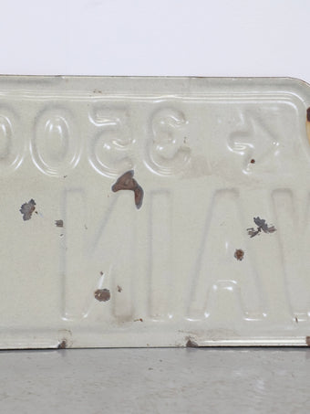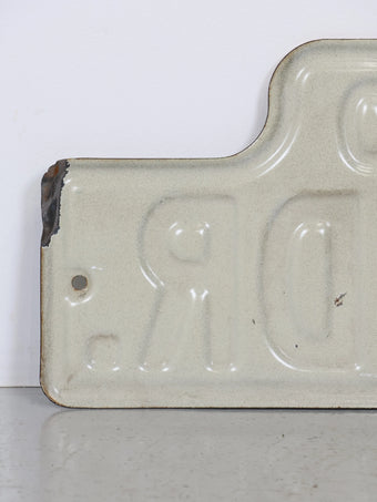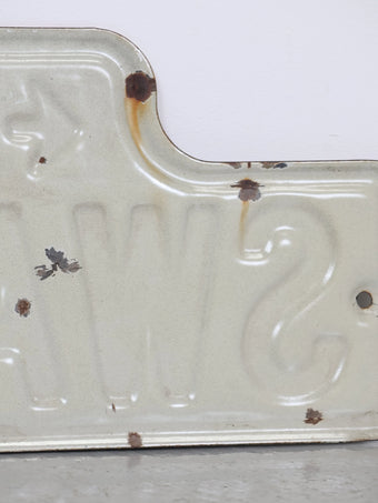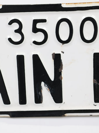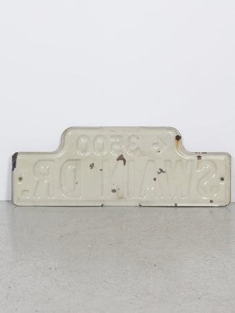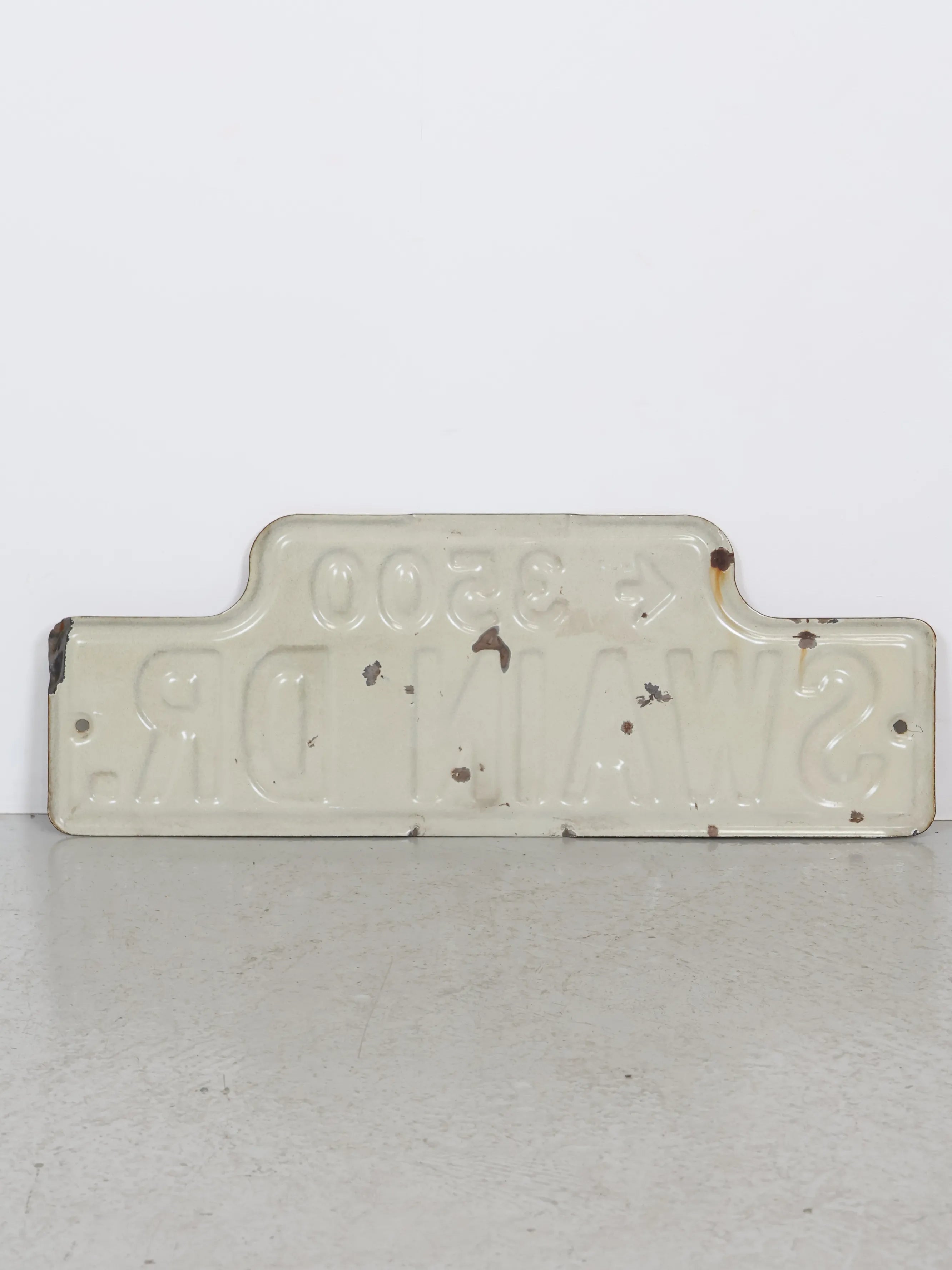 実際に道路標識として使用されていたストリートサインで、ブロックナンバーと矢印、シンプルなレタリングが組み合わさった実用的で無駄のないデザインが魅力の一枚。