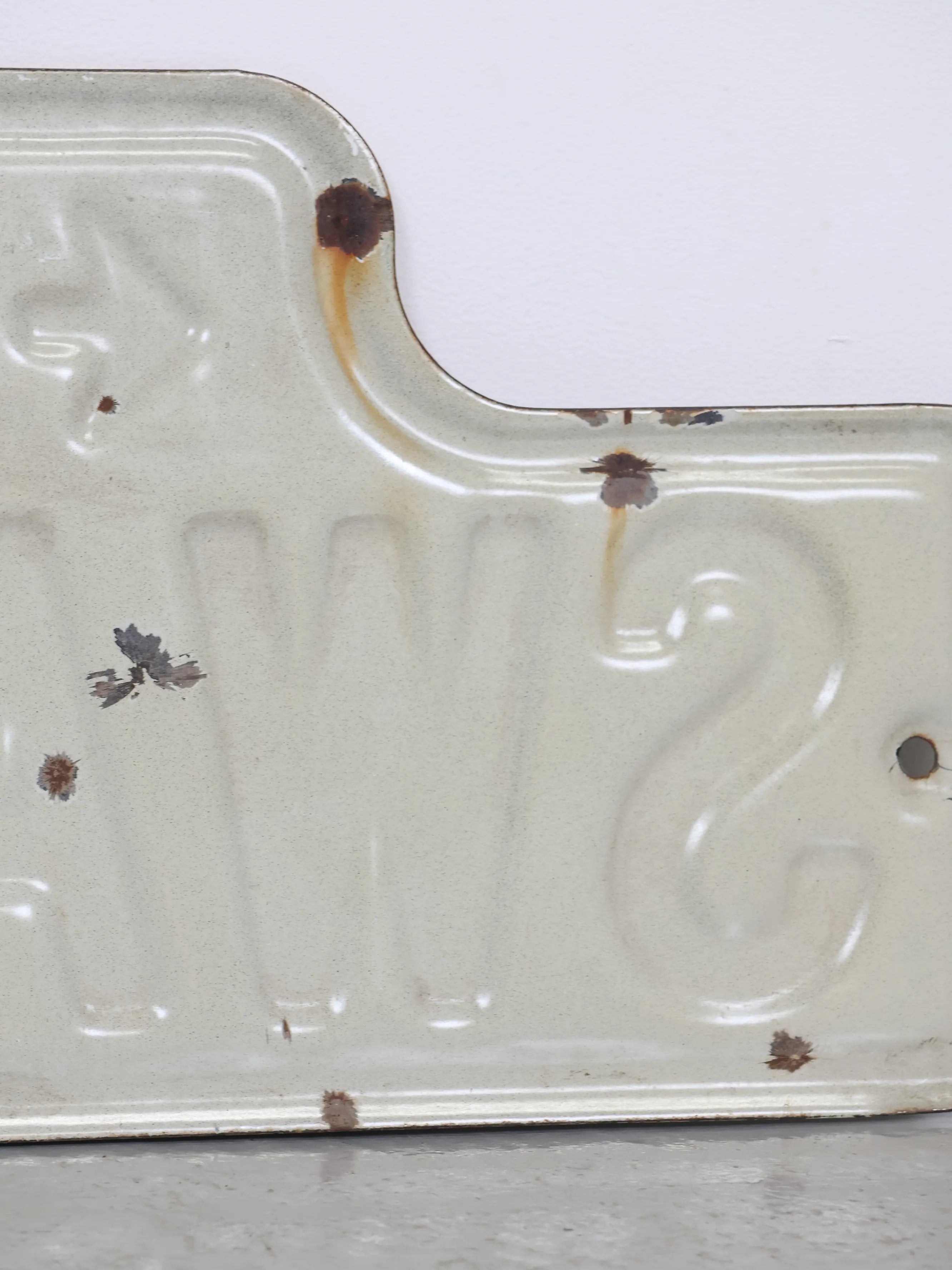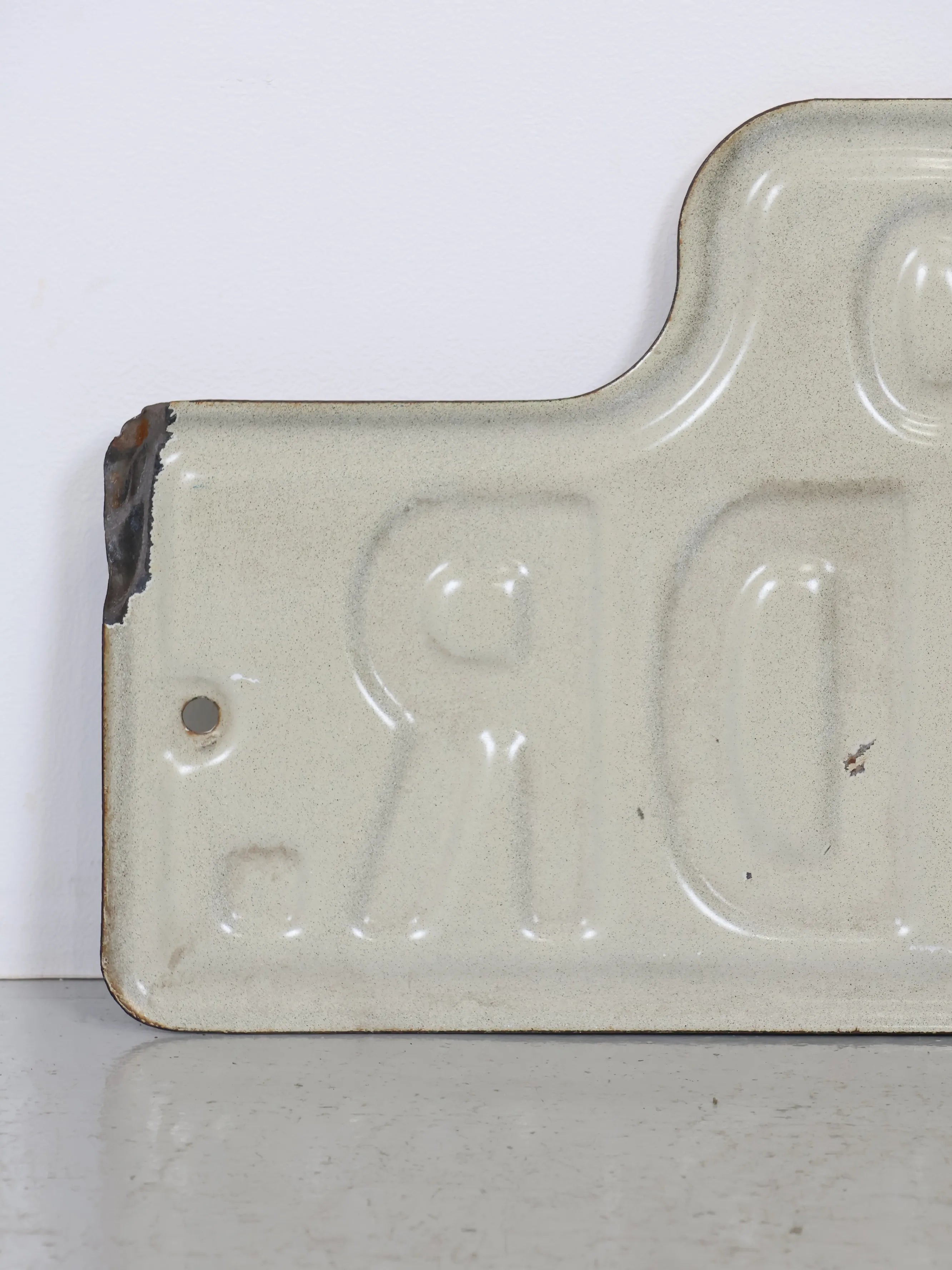 メタル素材ならではの質感に、キズやスレ、ペイントロス、縁部分の錆びなど、屋外で長年使用されてきたヴィンテージならではの経年変化が見られ、一点物としてのリアルな表情をお楽しみいただけます。