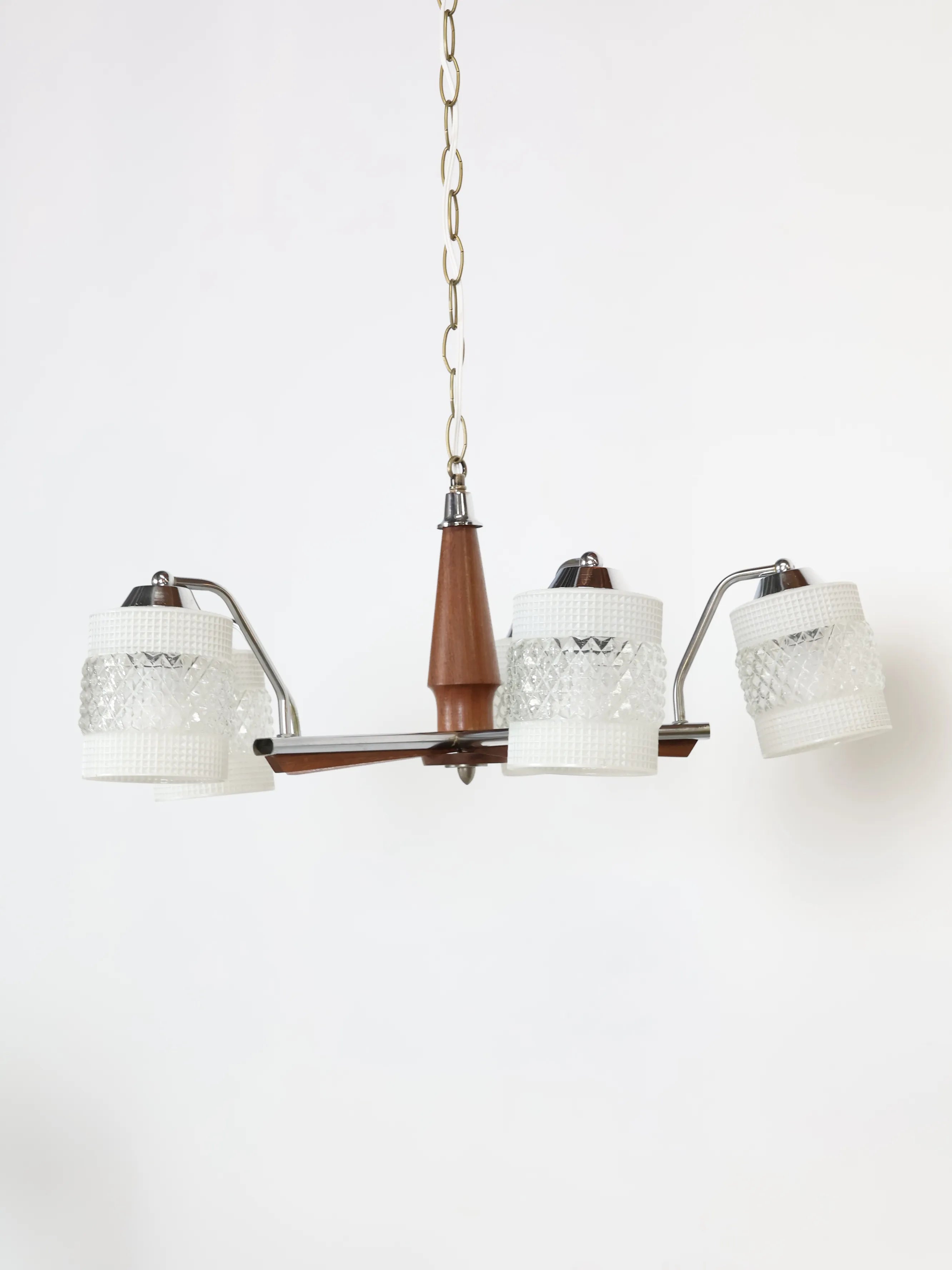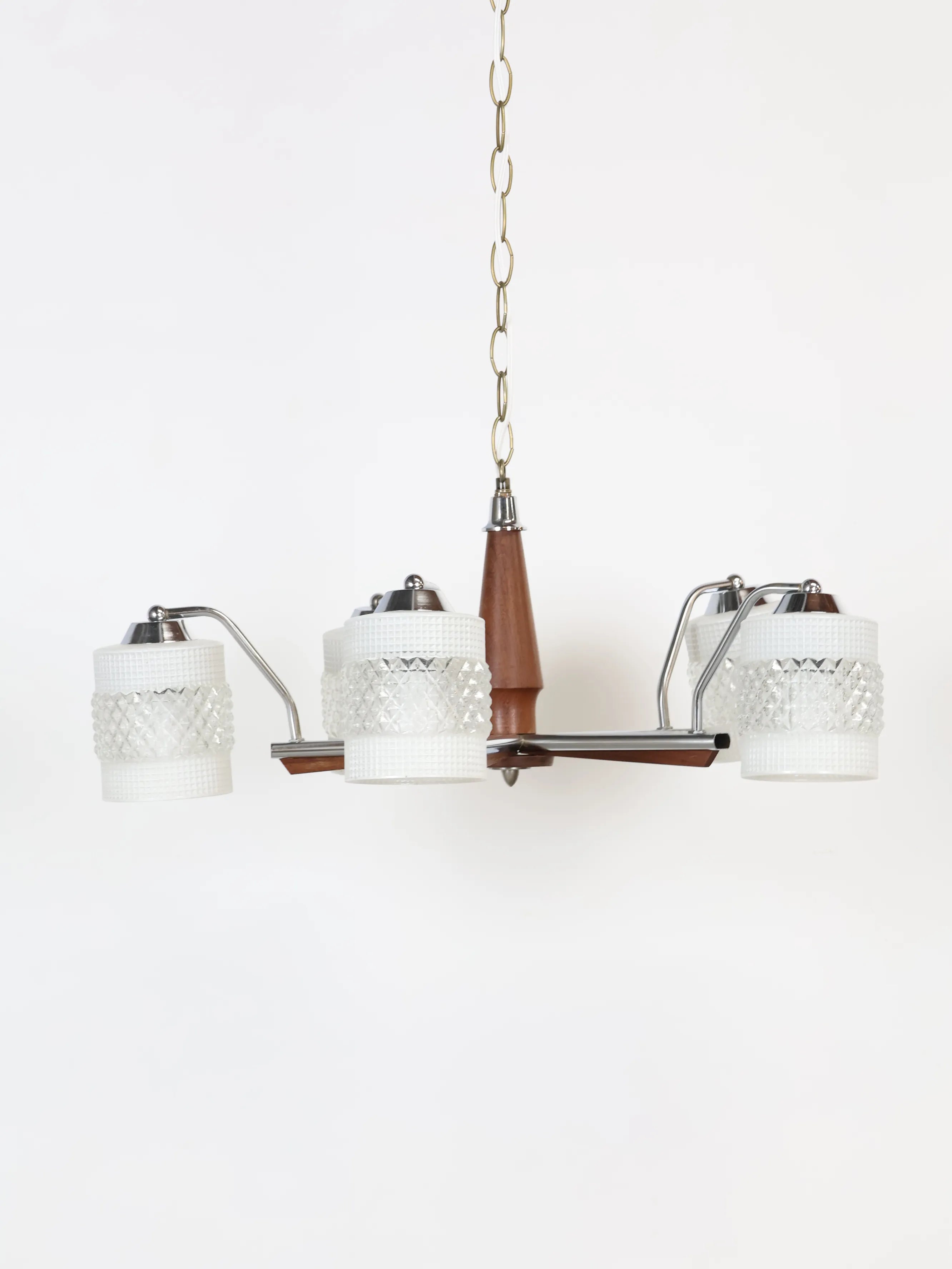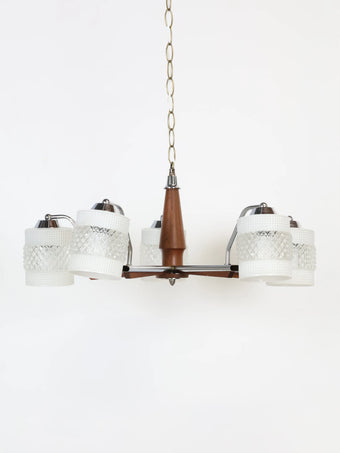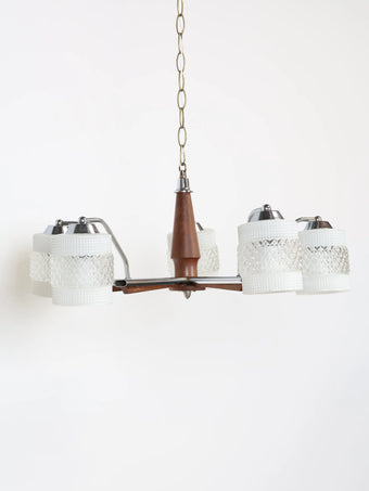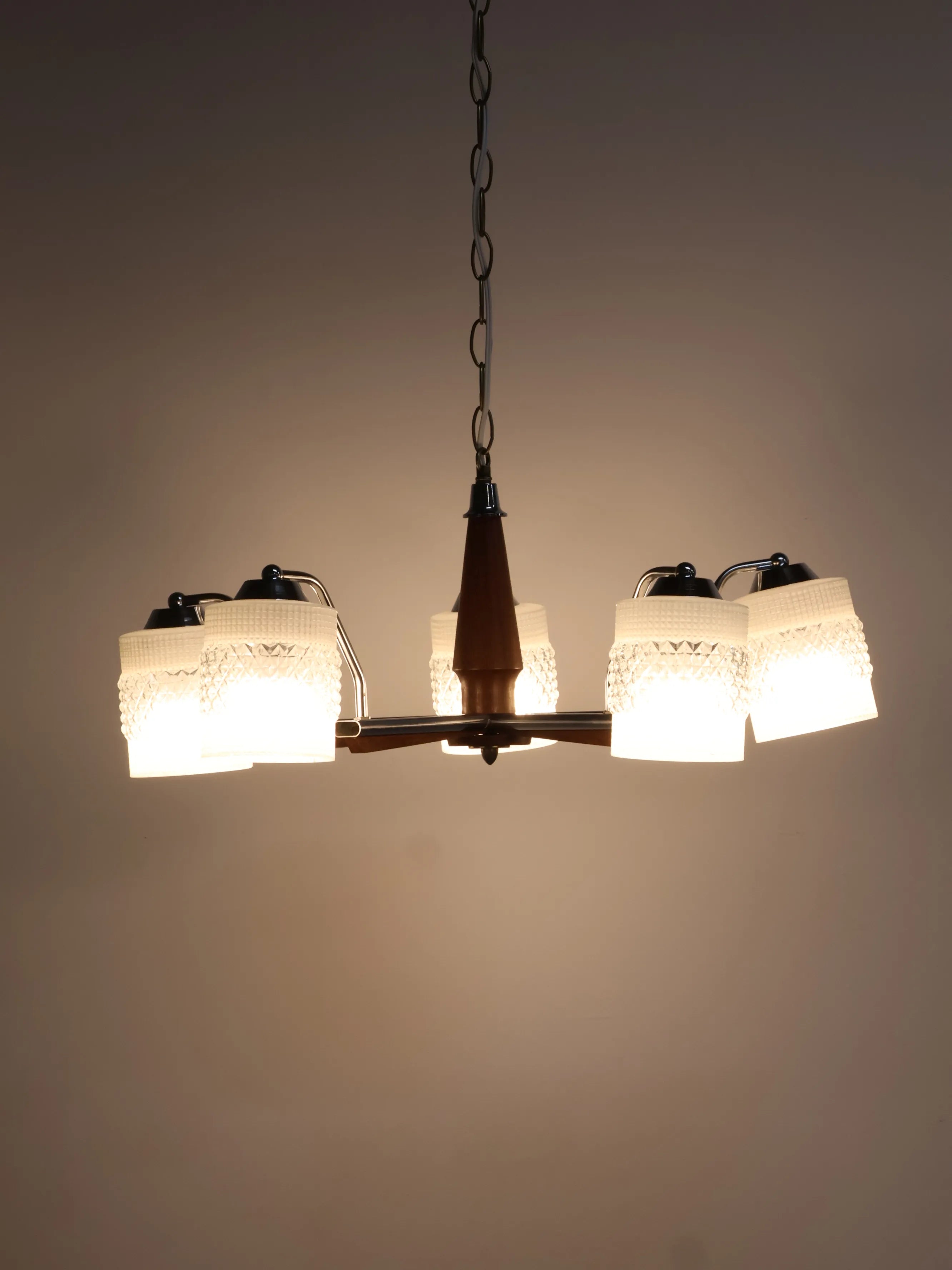 1950 - 60年代 ヴィンテージ ウッド & メタルベース ガラスシェード 5灯 シャンデリア