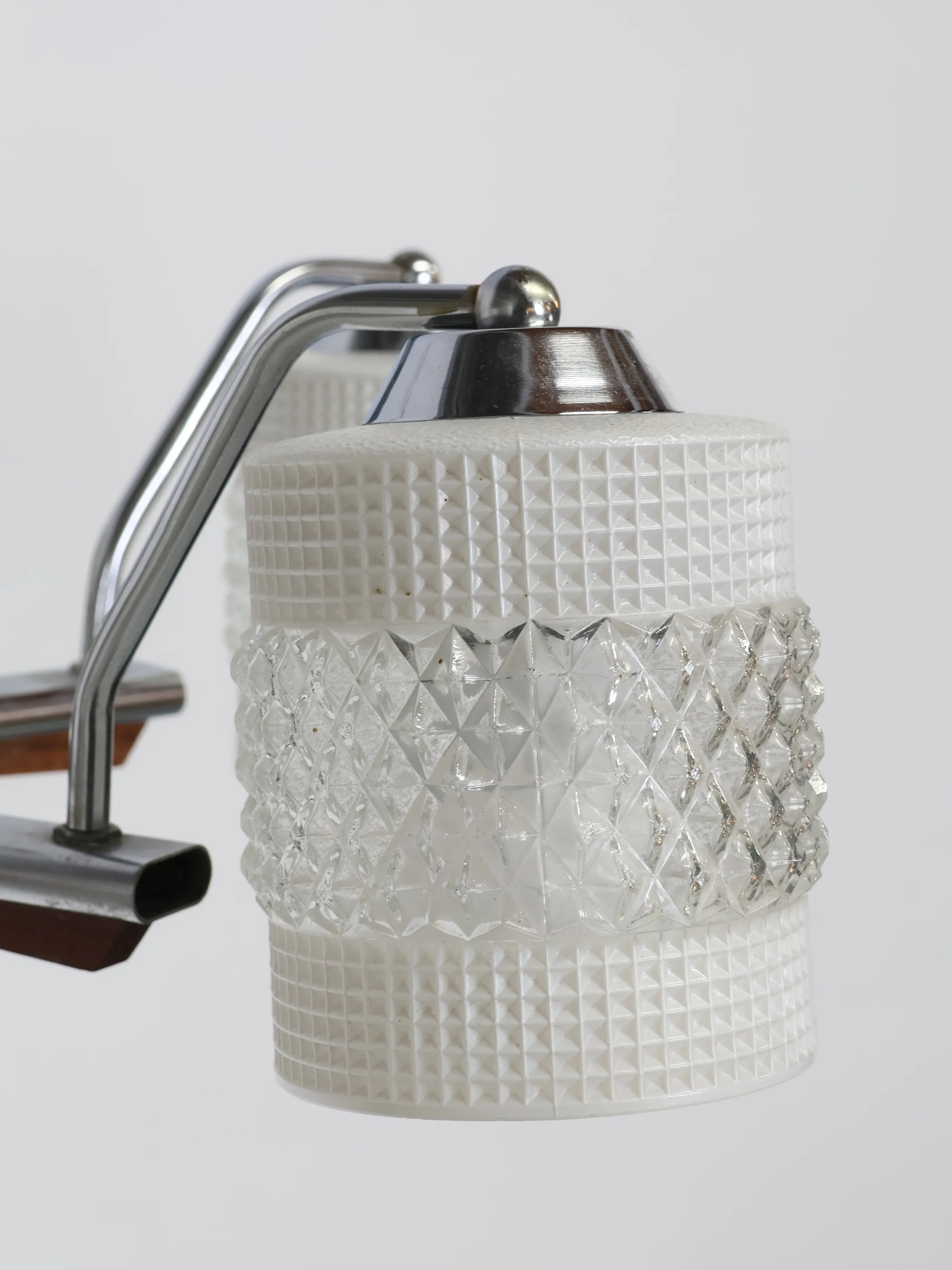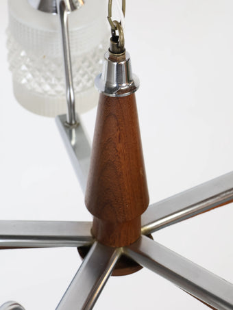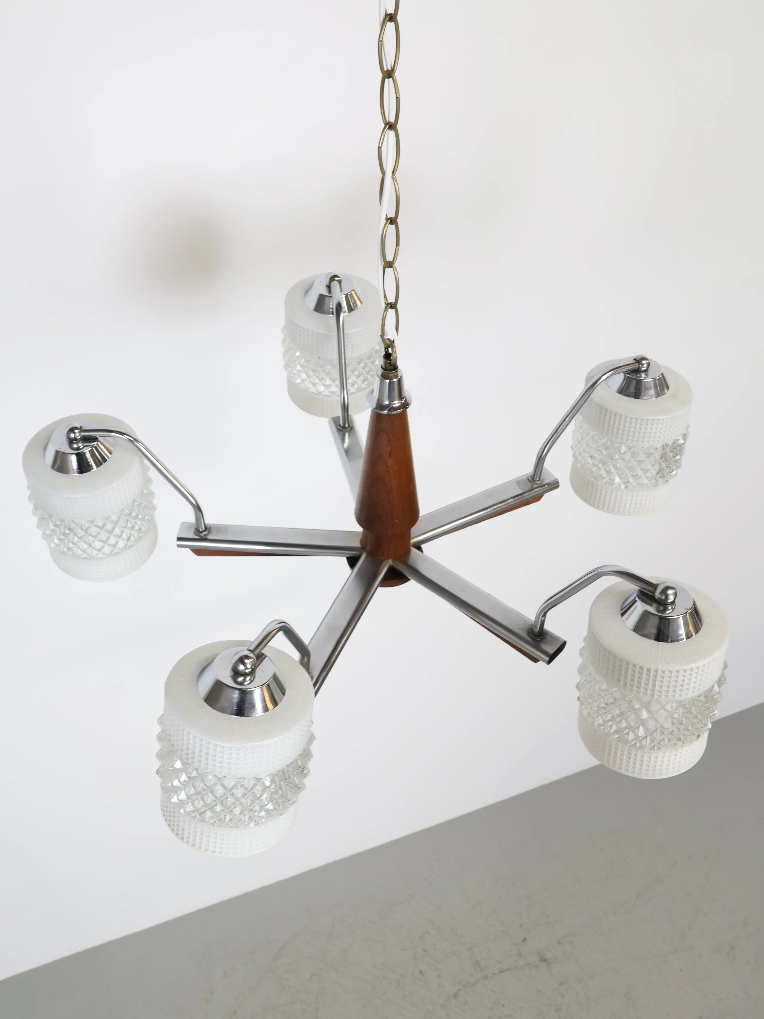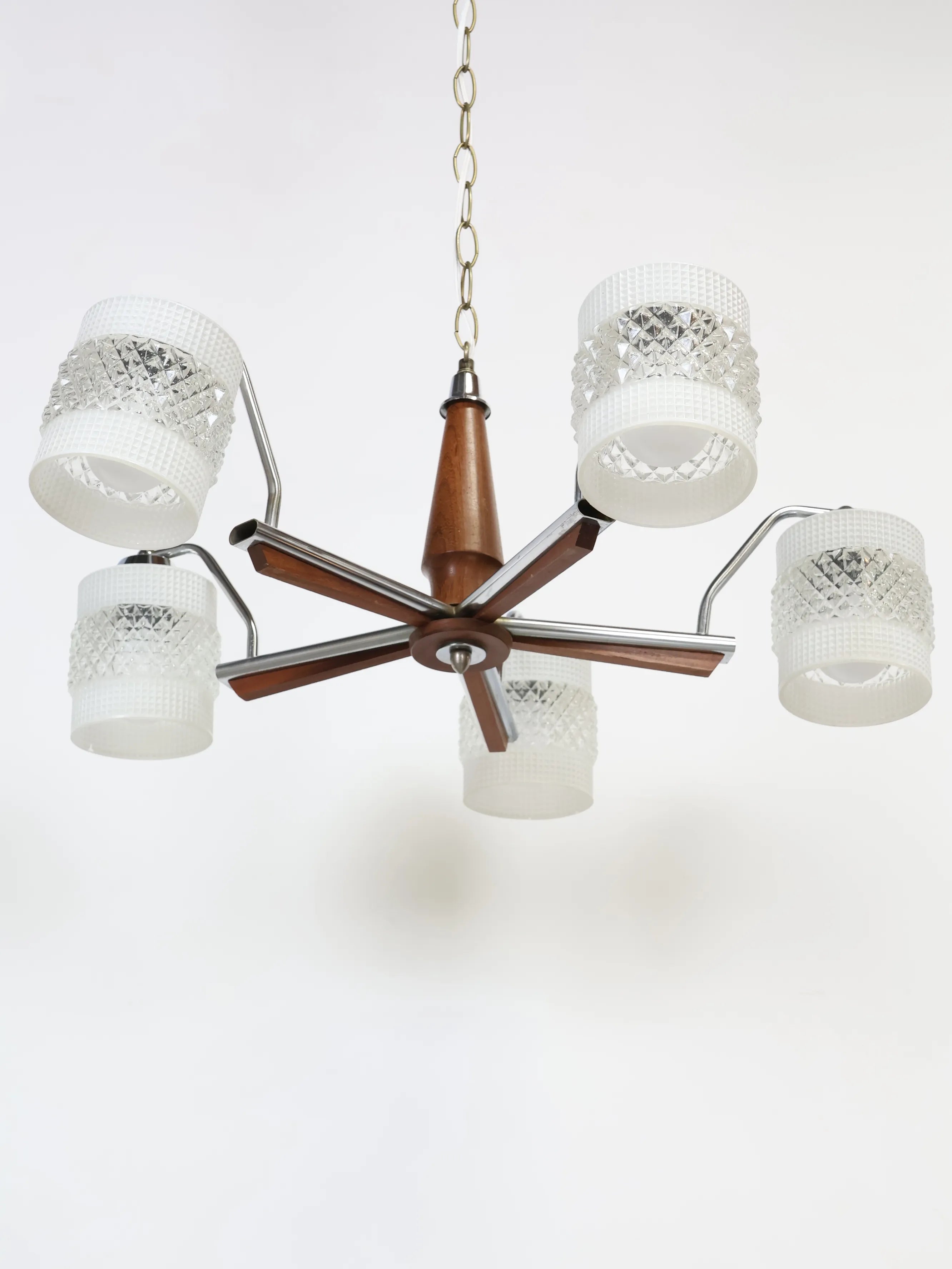 1950 - 60年代 ヴィンテージ ウッド & メタルベース ガラスシェード 5灯 シャンデリア