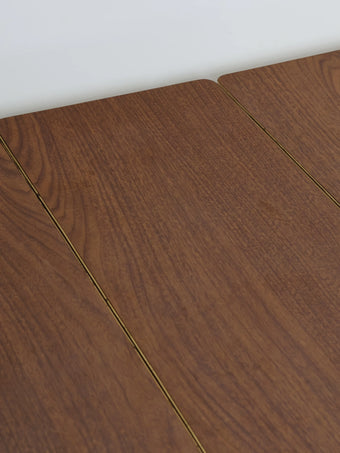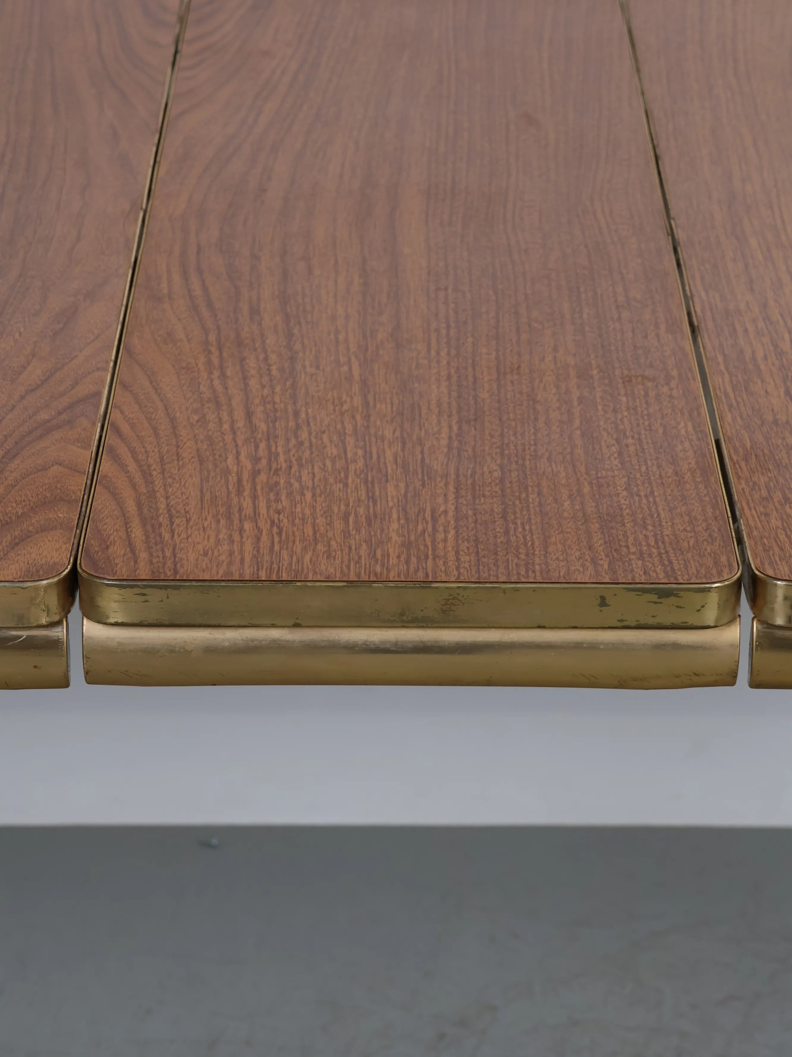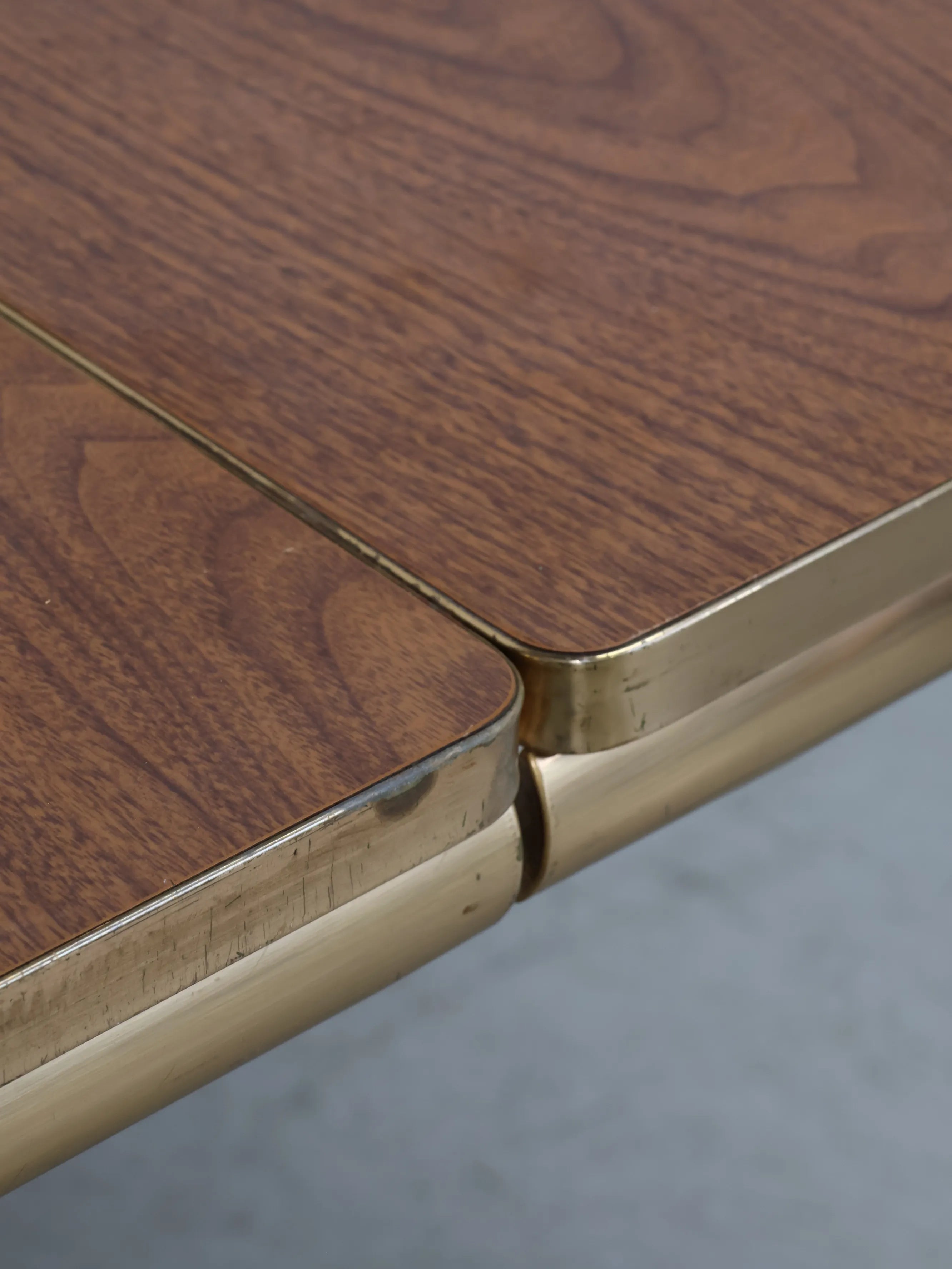 ウッド調のメラミン化粧板を使用したクラシックな天板に、サイドに施されたゴールドのメタルが高級感を漂わせます。