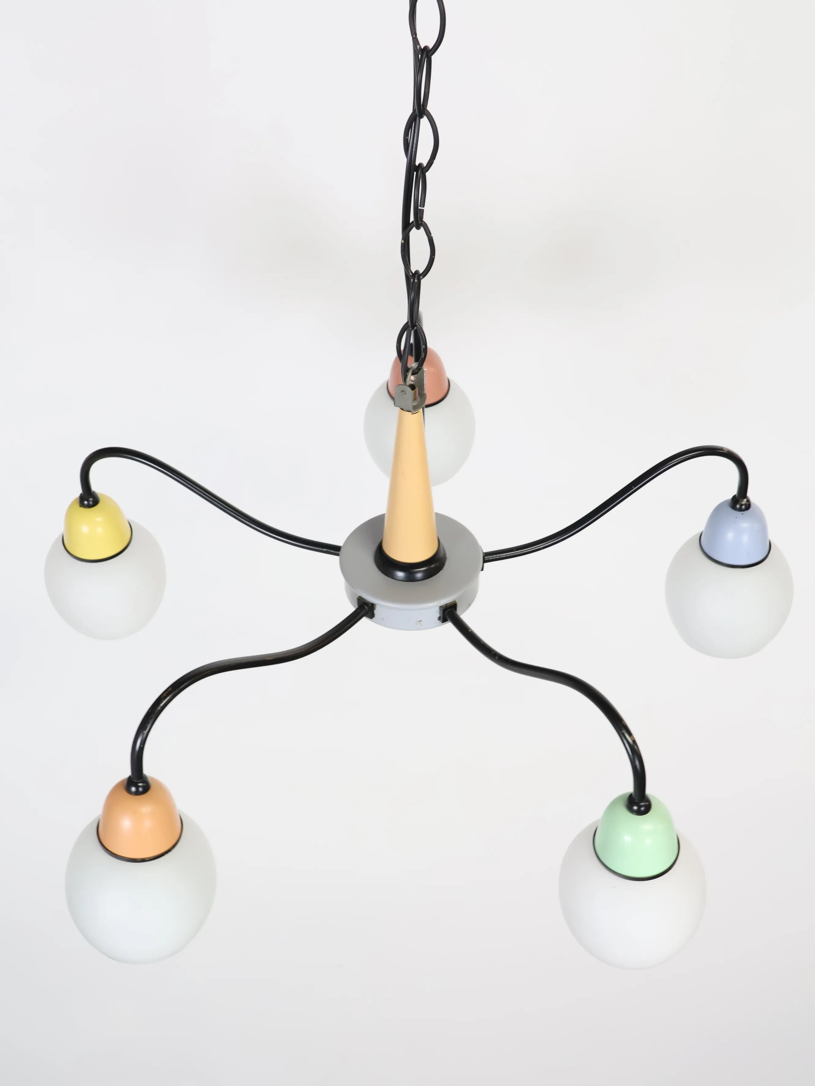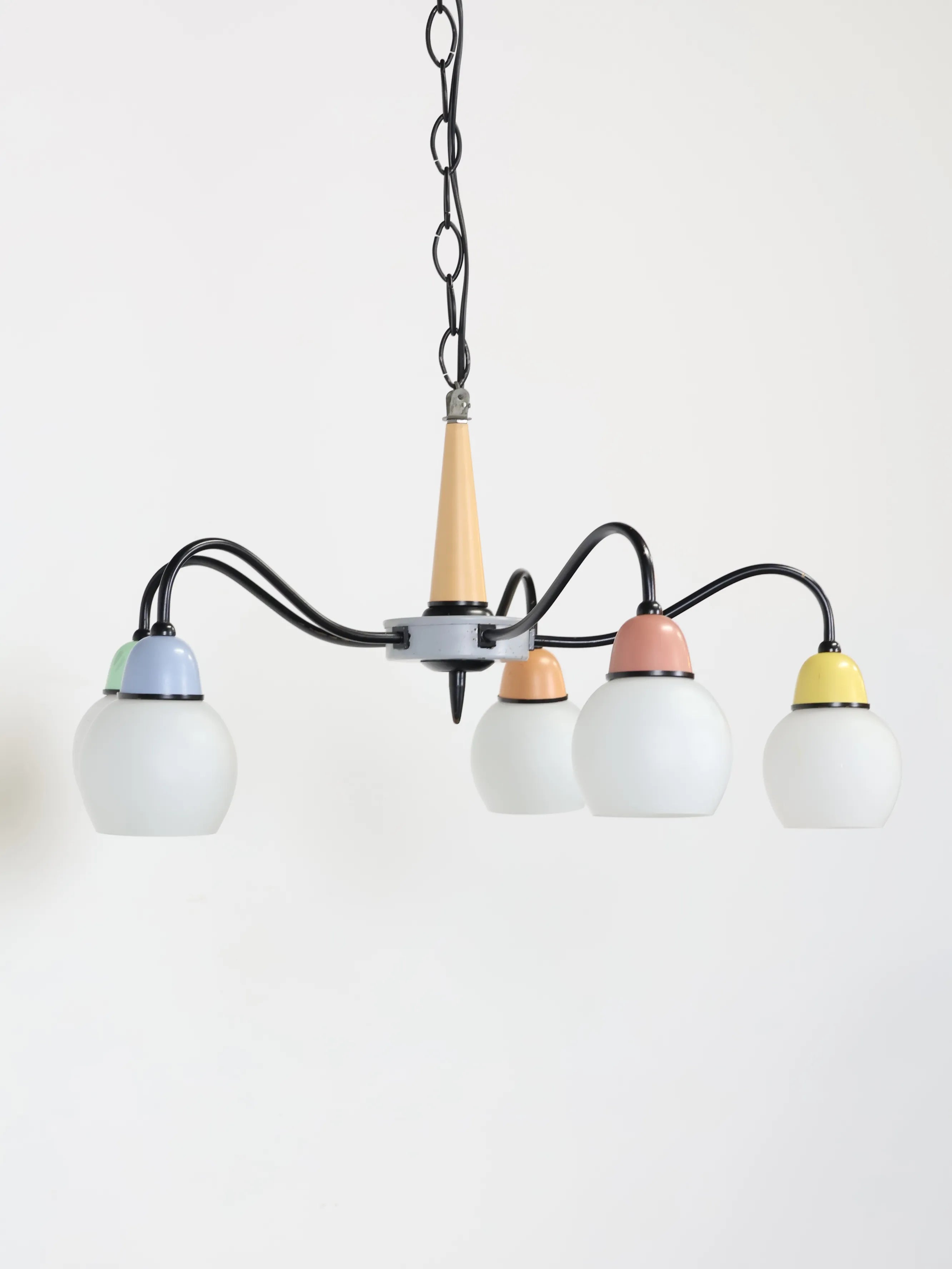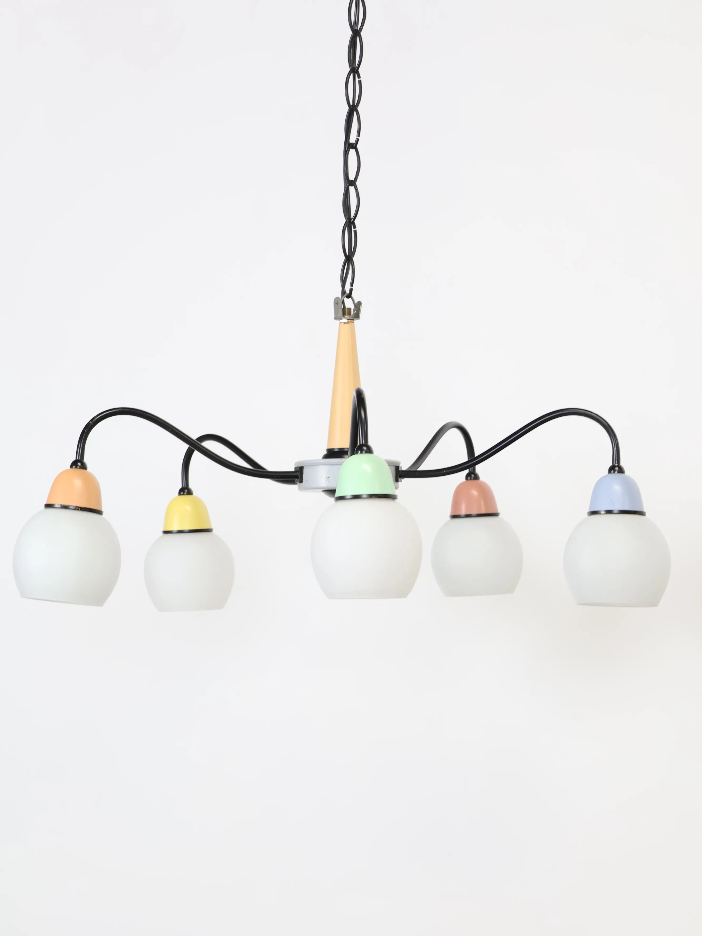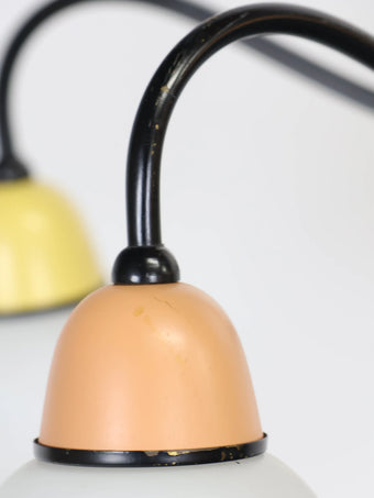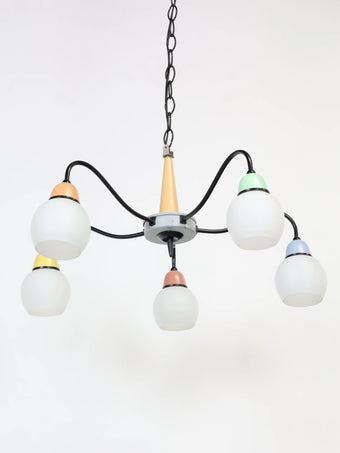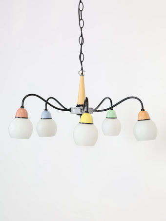 中央のベースから伸びる5本のワイヤーの先にホワイトのガラスシェードが付き、差し色になったマルチカラーの配色が可愛らしくレトロな雰囲気を醸し出しています。