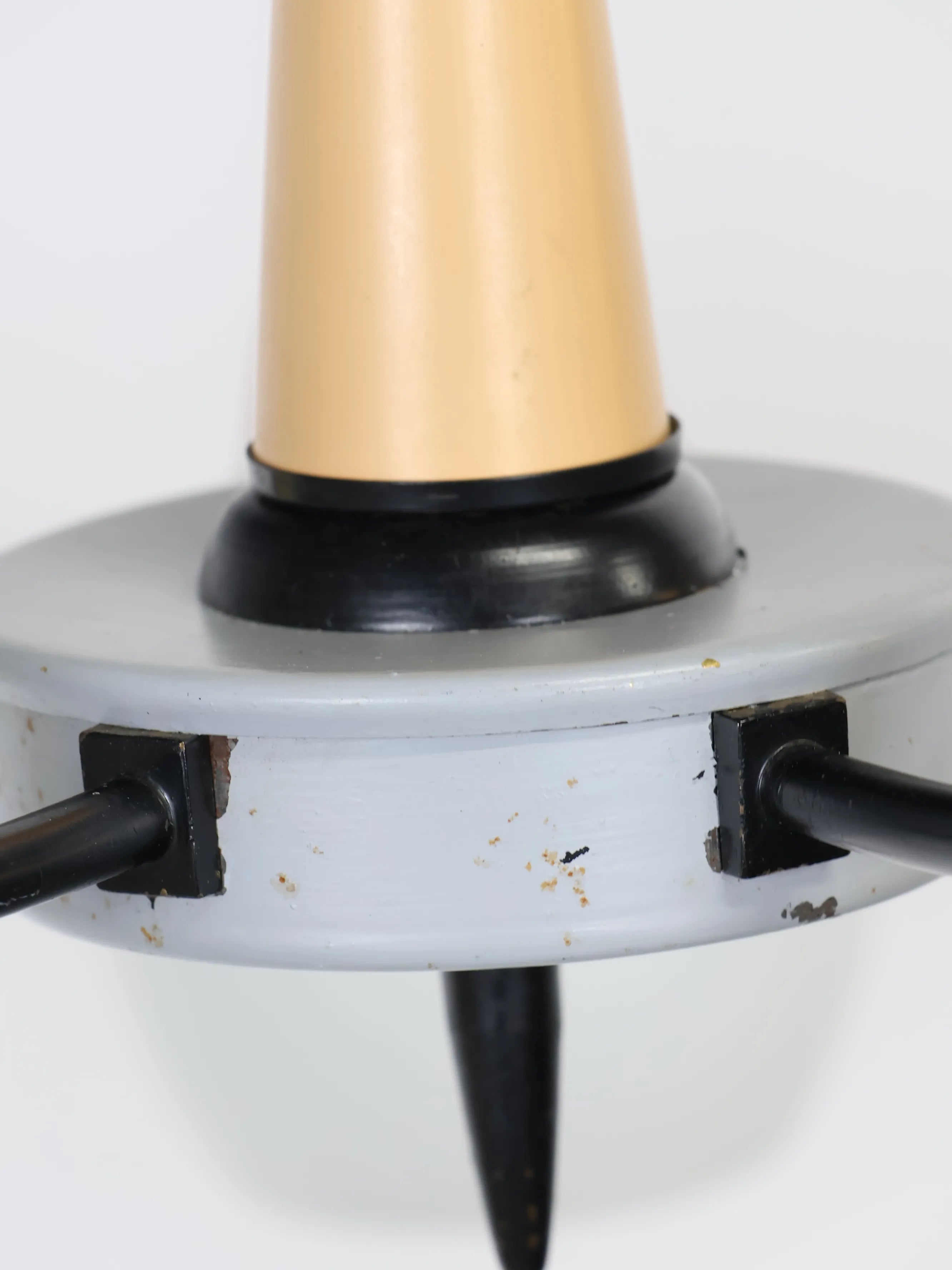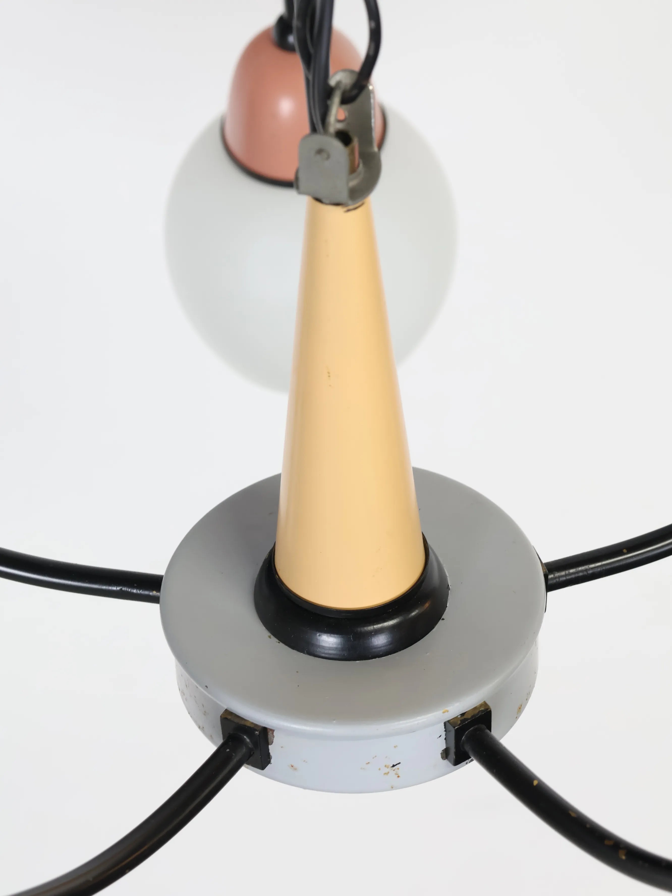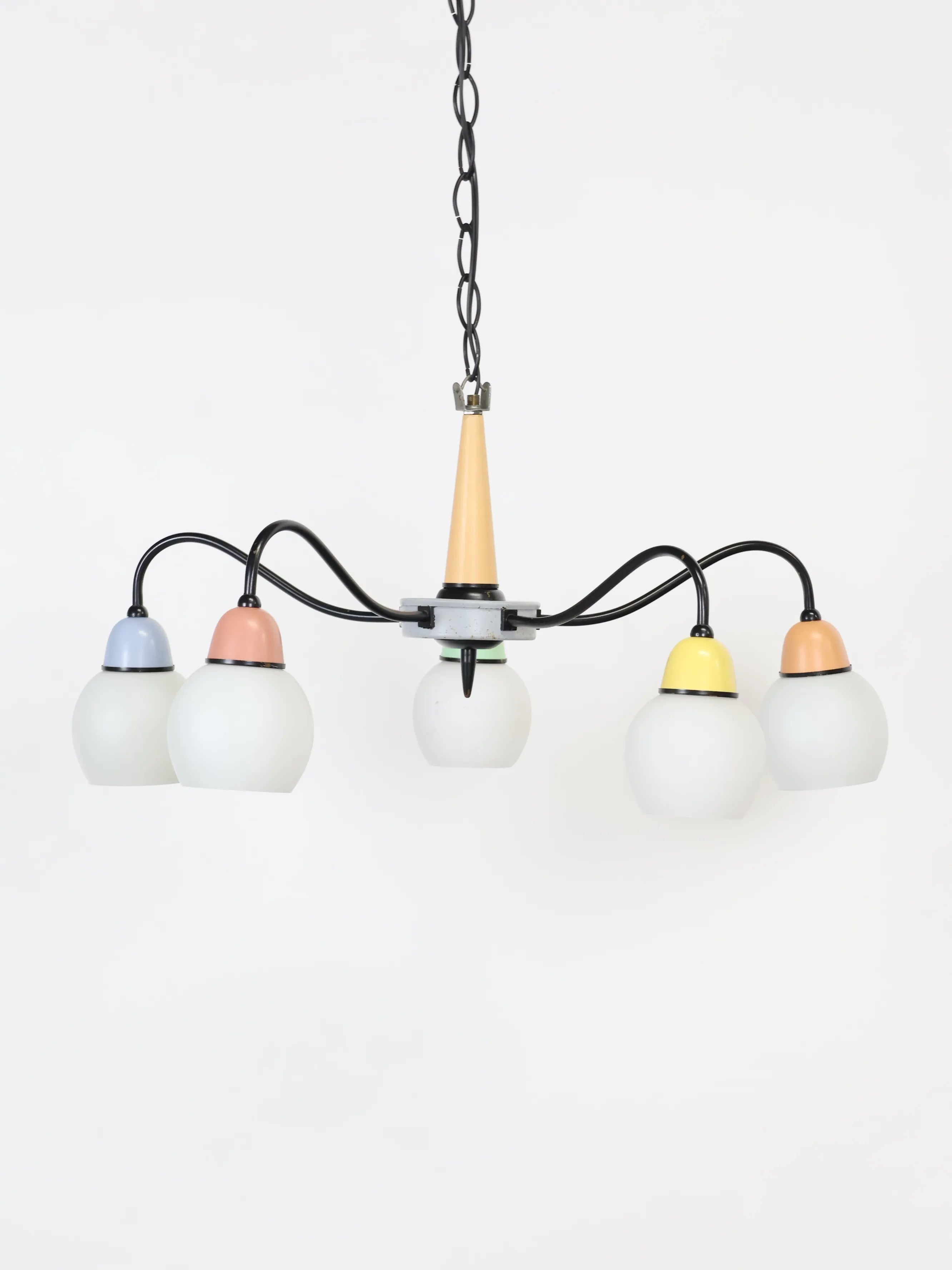 中央のベースから伸びる5本のワイヤーの先にホワイトのガラスシェードが付き、差し色になったマルチカラーの配色が可愛らしくレトロな雰囲気を醸し出しています。