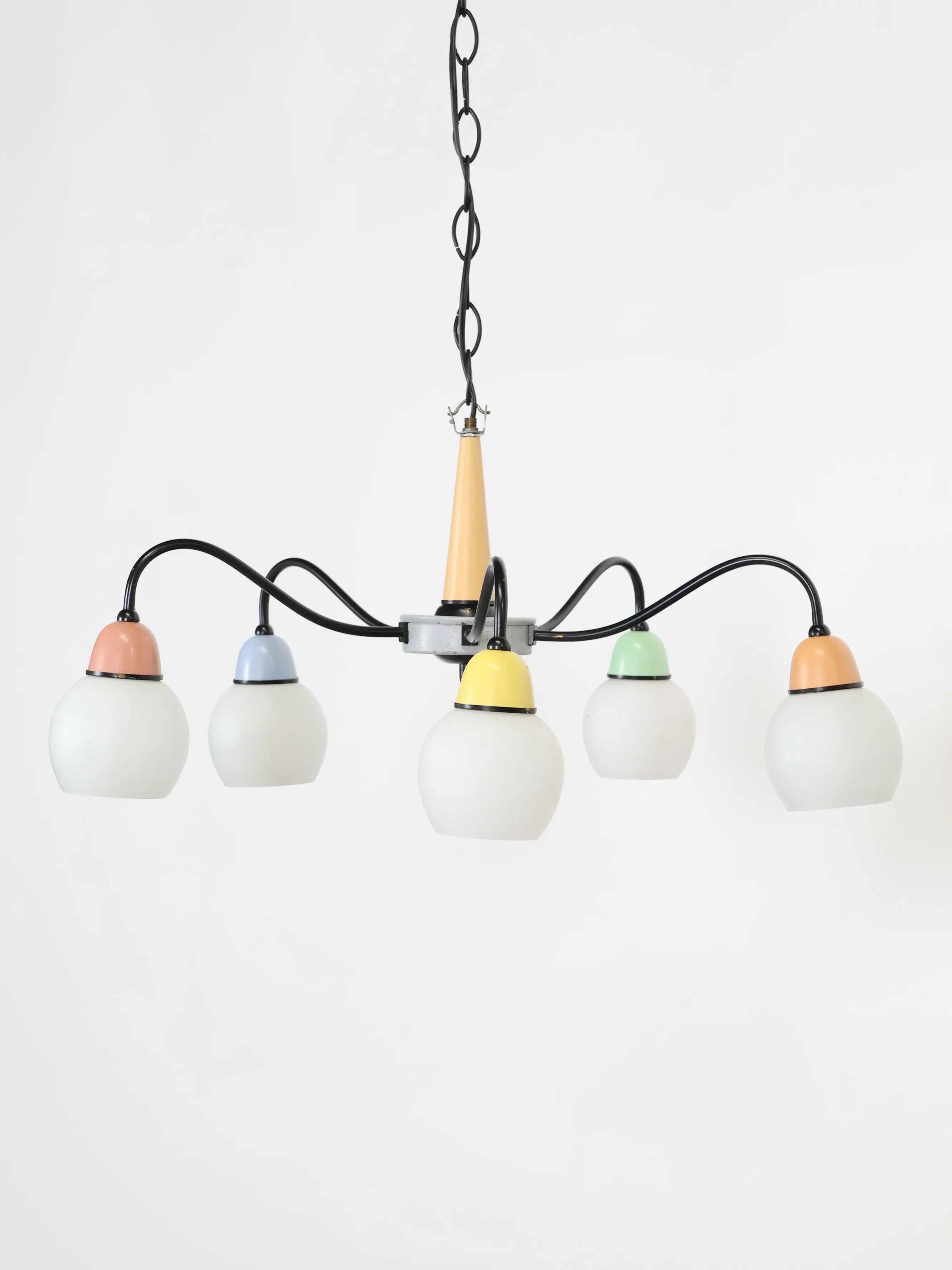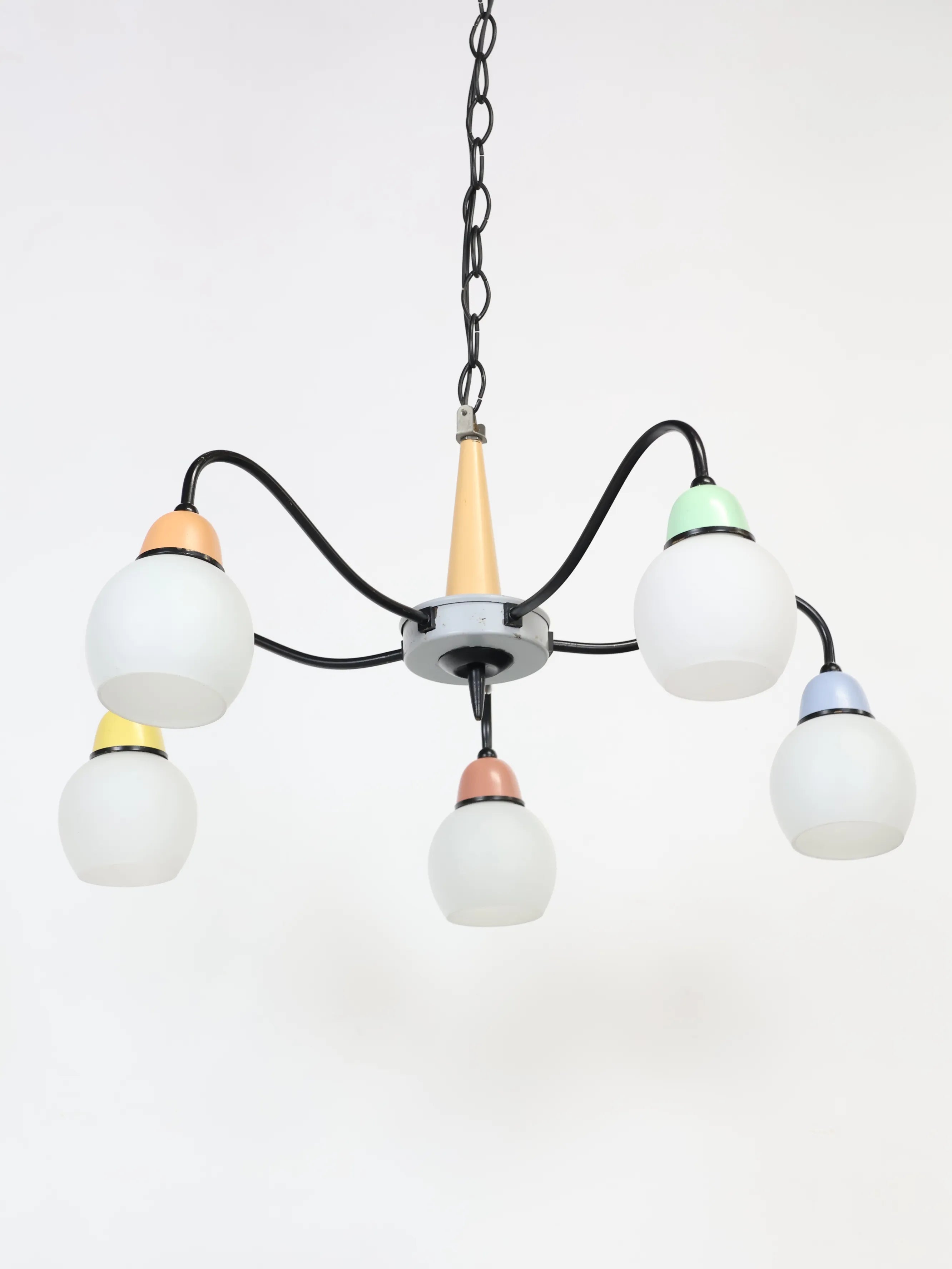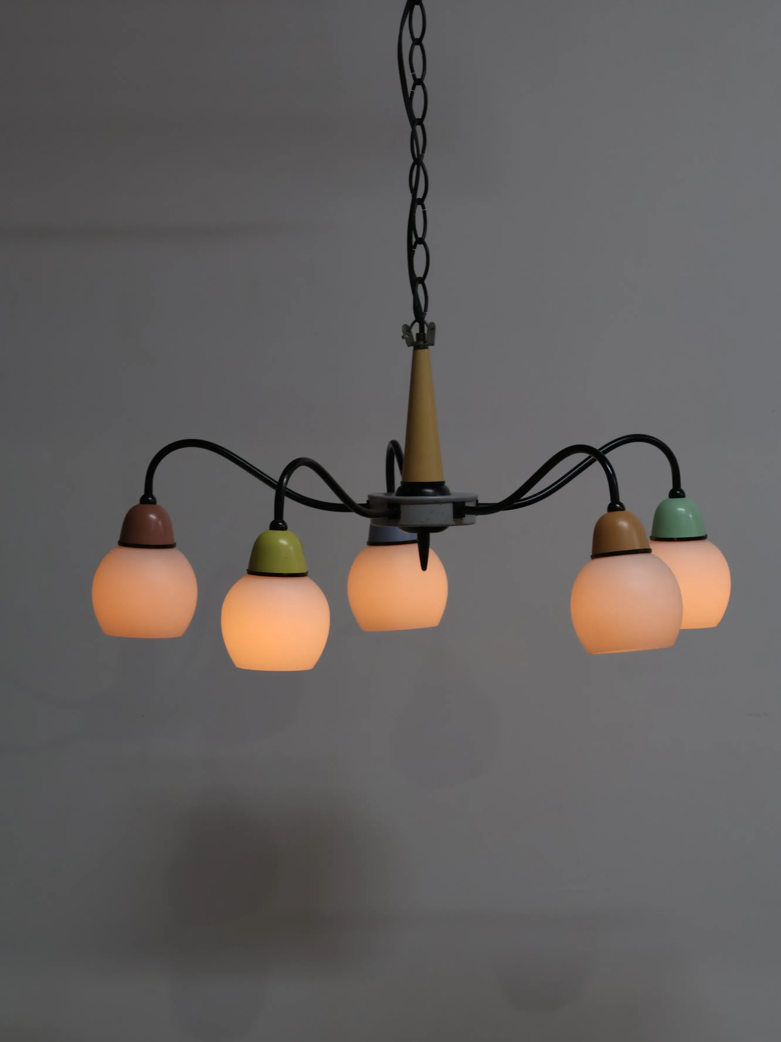 1970年代 ヴィンテージ アイアンワイヤーベース 5灯 ガラスシェード マルチカラー シャンデリア
