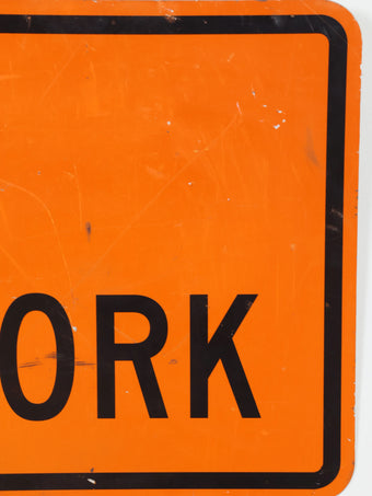 実際に道路工事現場で使用されていた案内用サインで、オレンジベースにブラックレタリングを配した、高い視認性を誇るロードサイン。