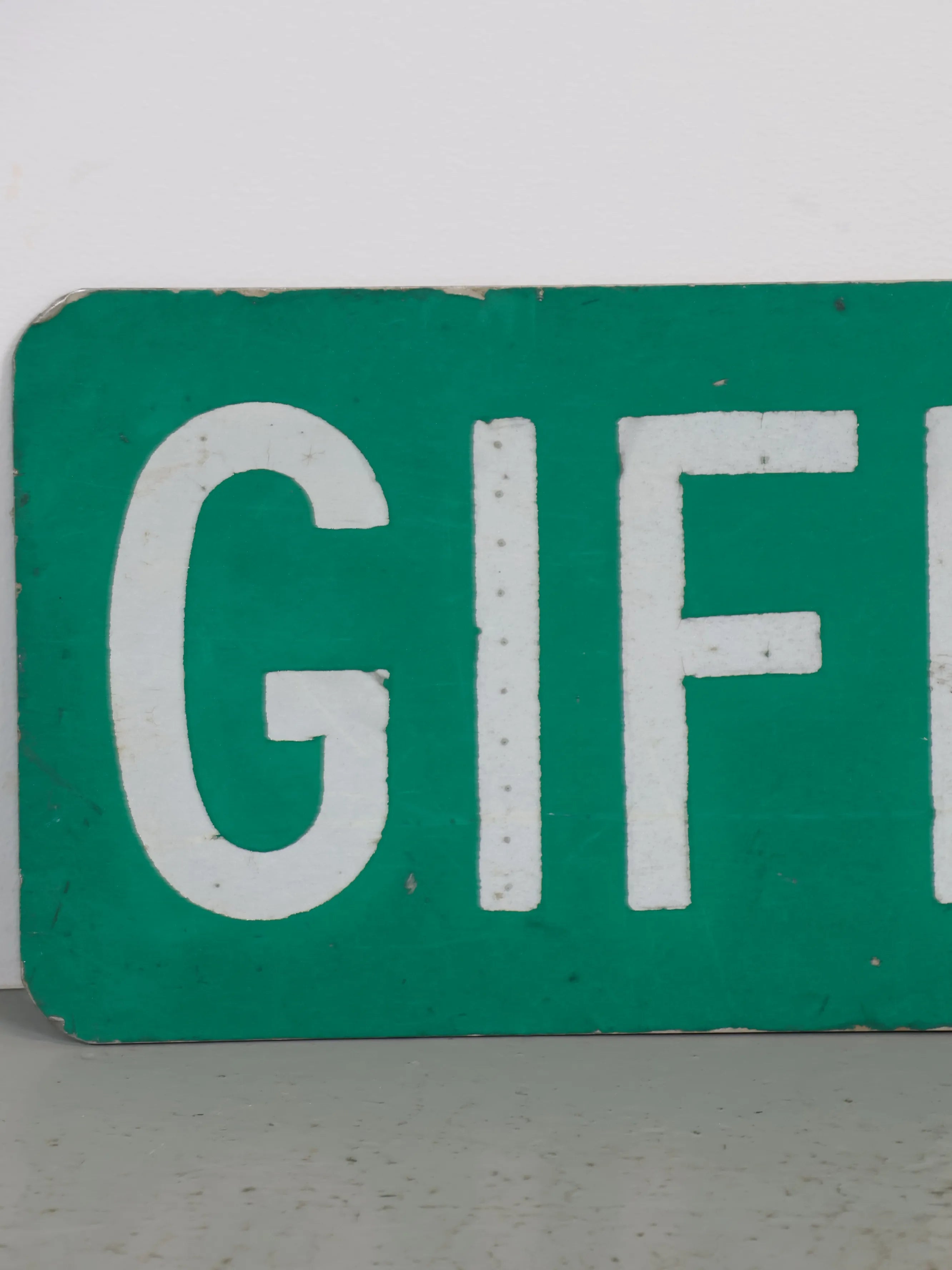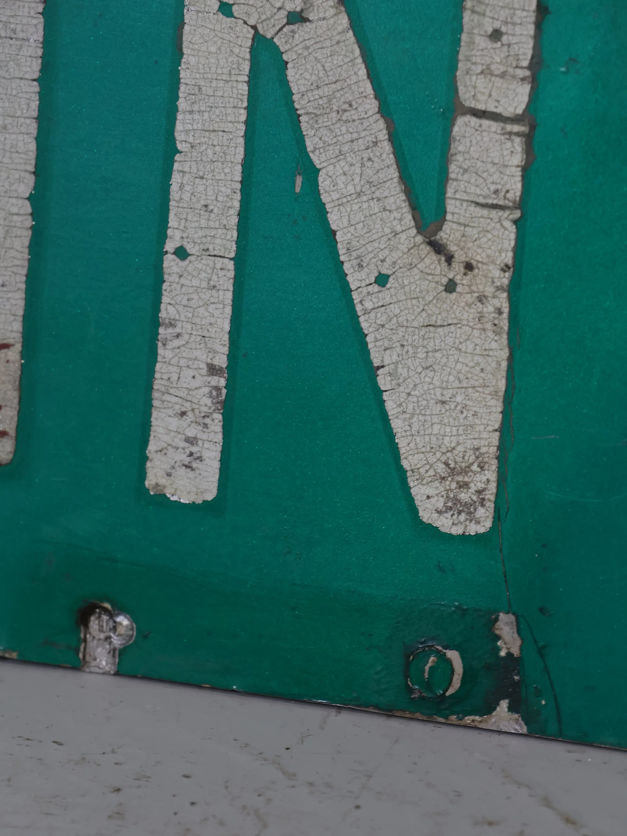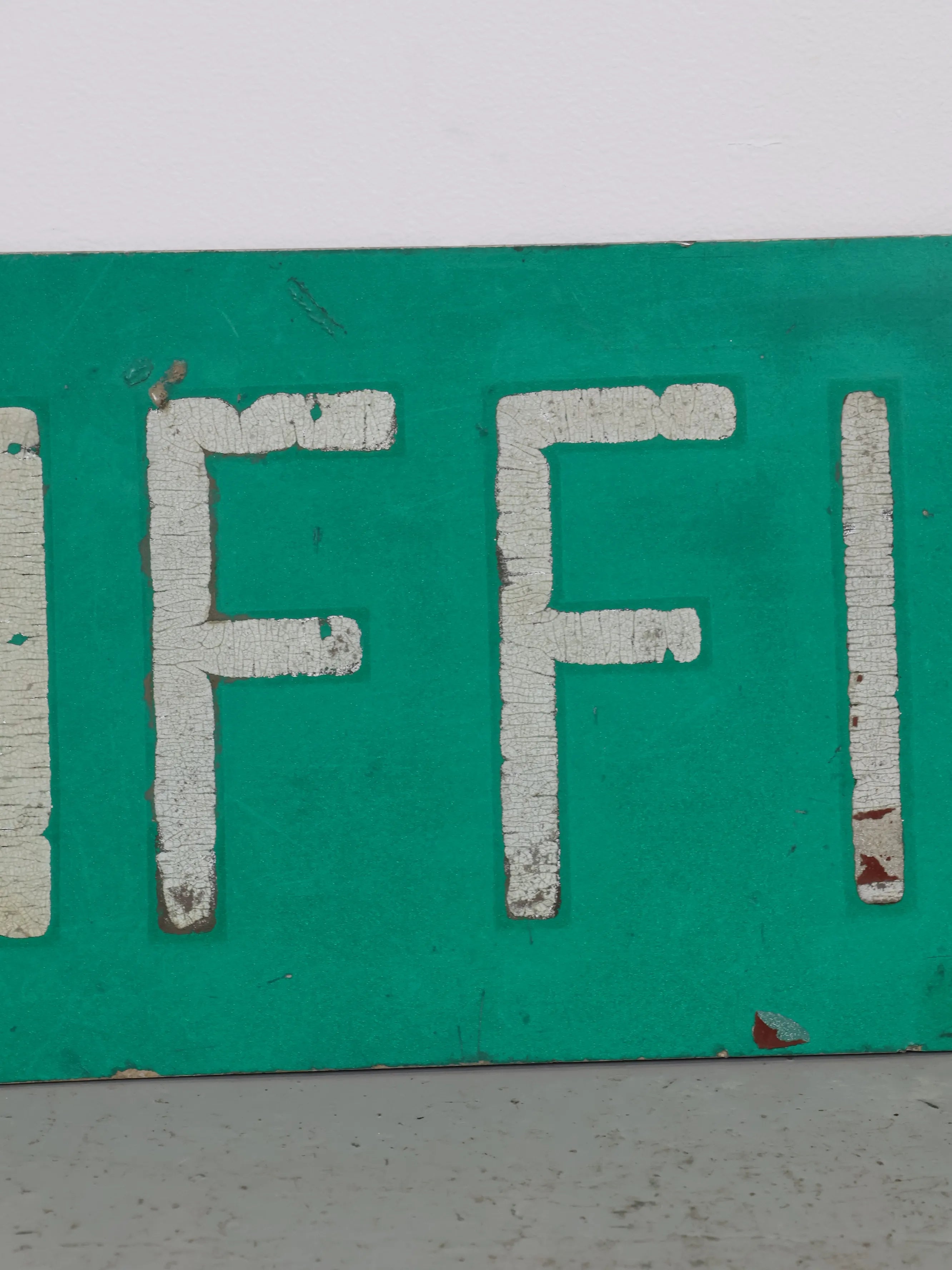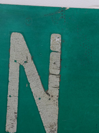 無駄のないシンプルなレイアウトながら、長年屋外で使われてきたことで生まれたペイントの剥がれや擦れが、このサインにしかないリアルな存在感を与えています。