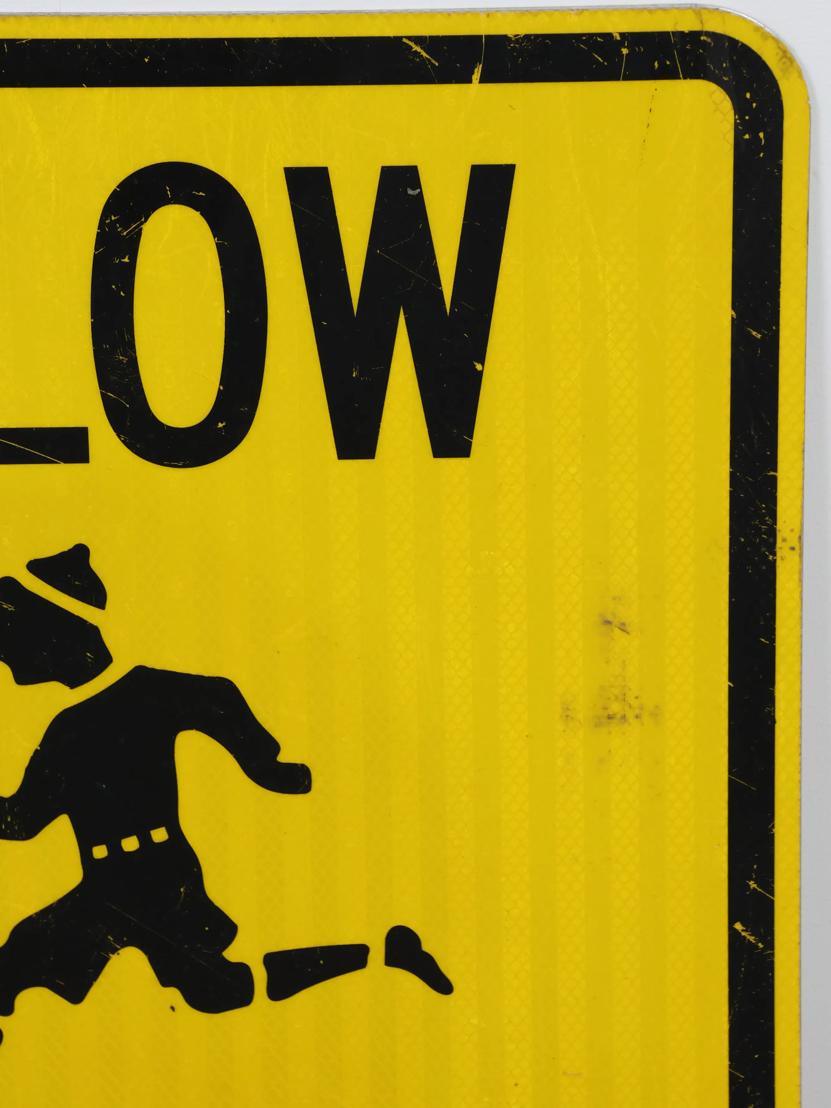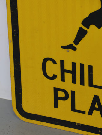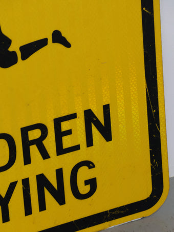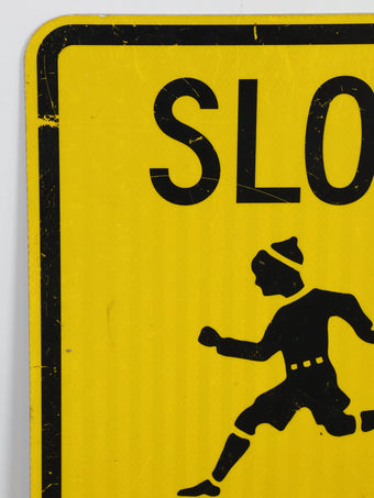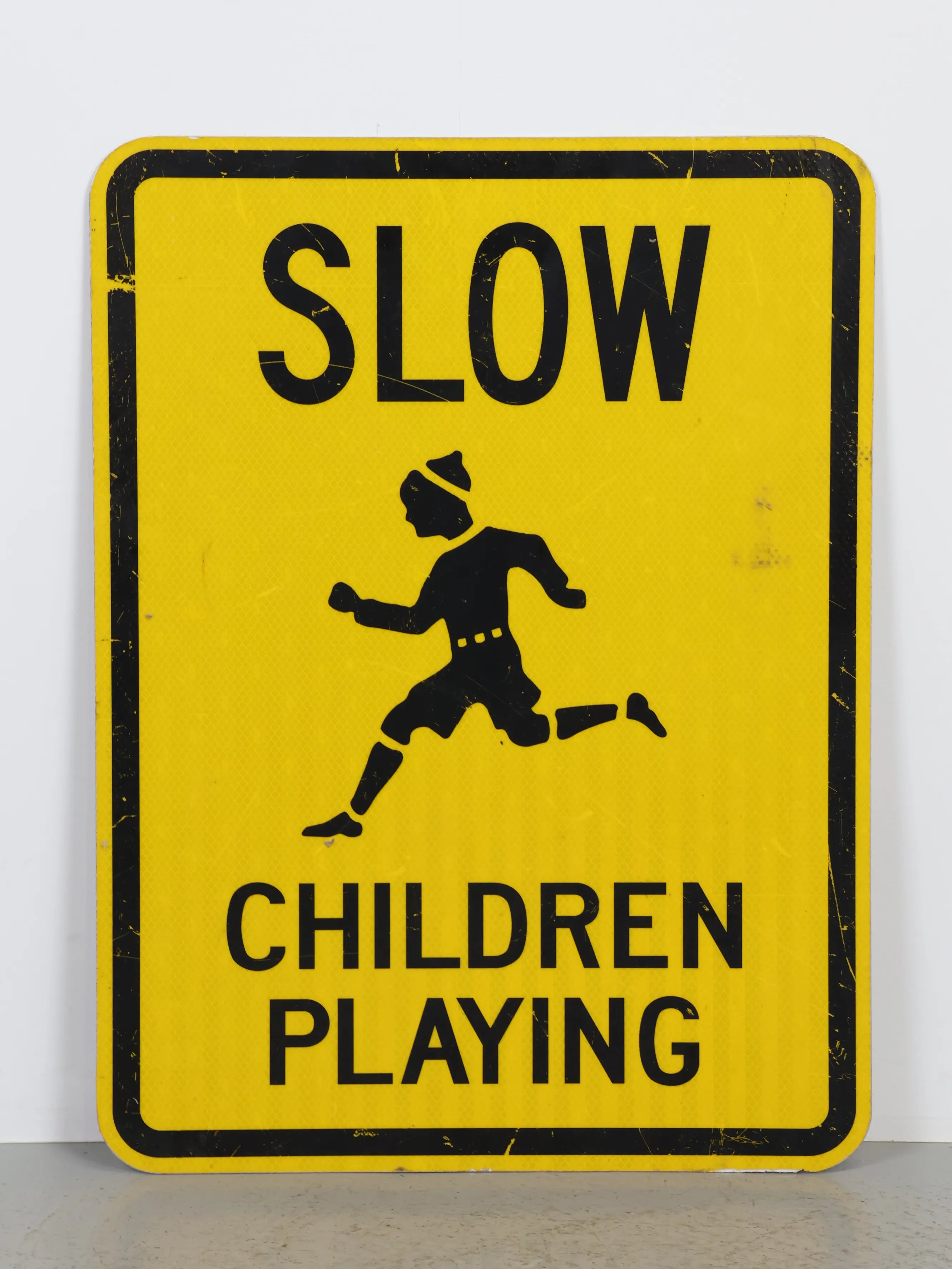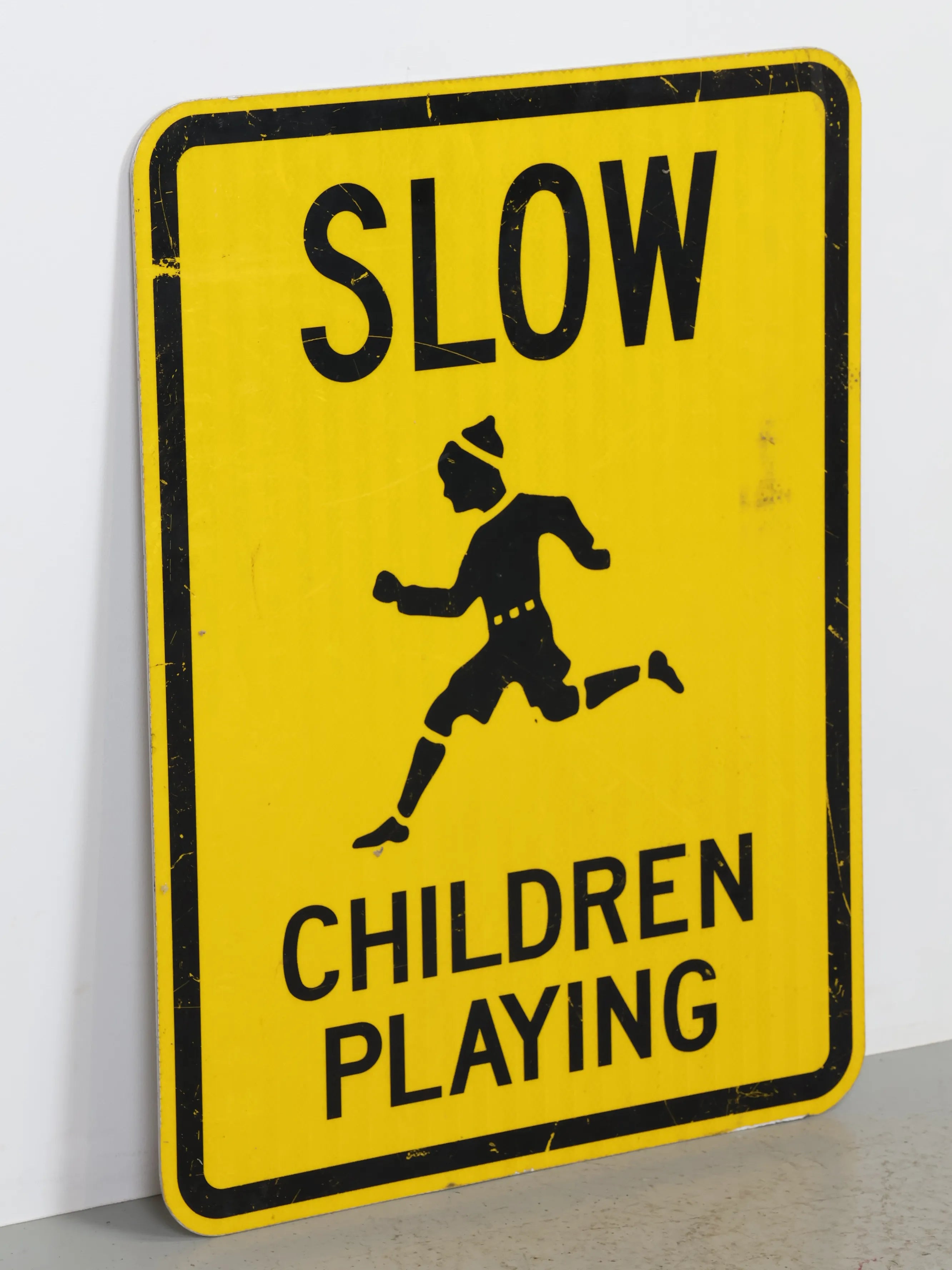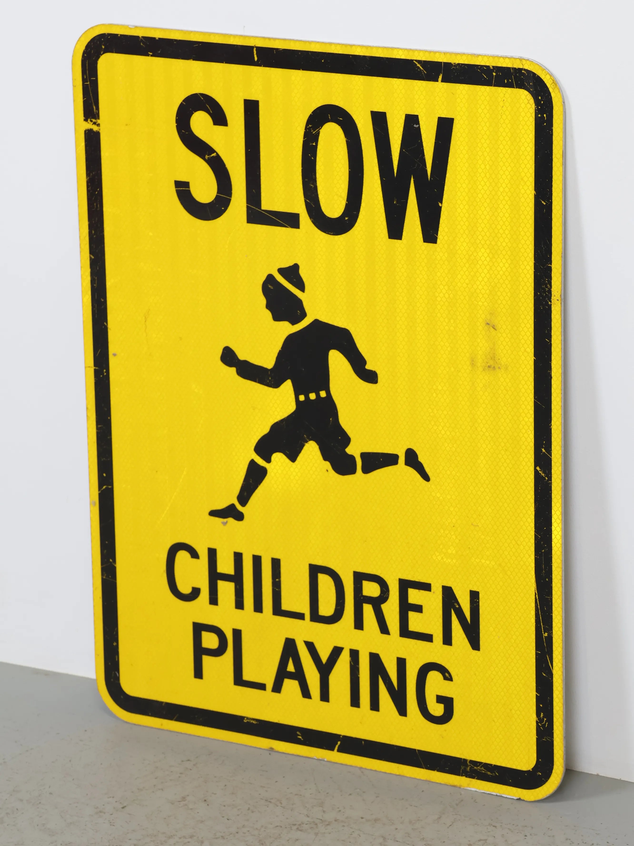「SLOW CHILDREN PLAYING(徐行、子どもが遊んでいます)」の文字と、走る子どものシルエットが描かれた、アメリカらしいユーモアと実用性を併せ持つ一枚です。