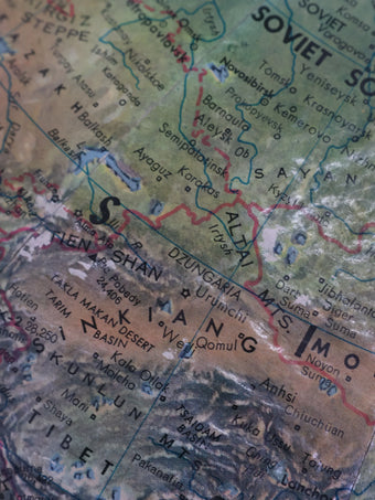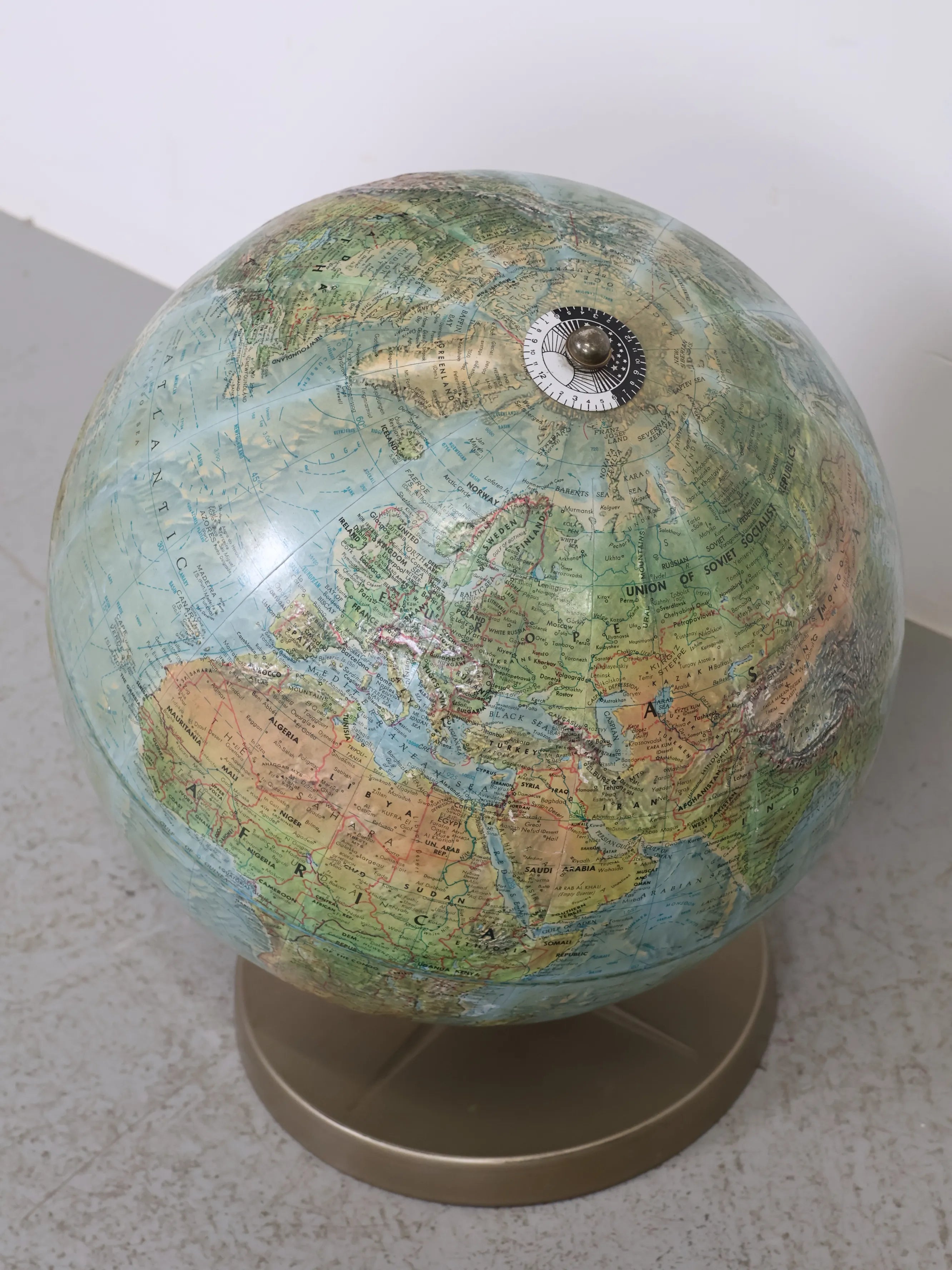 冷戦期真っただ中の時代に作られた地球儀で、当時の国境線や国名表記、政治的区分がそのまま反映されている点が大きな特徴です。