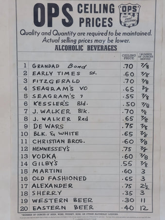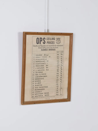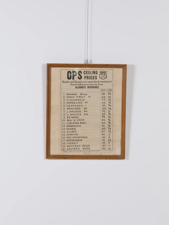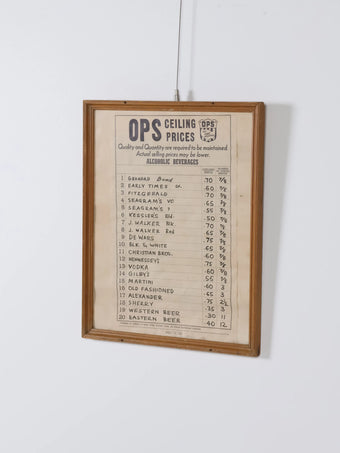 1950年代 ヴィンテージ OPS (office of price stabilization) アルコール飲料 フレーム 上限価格リスト