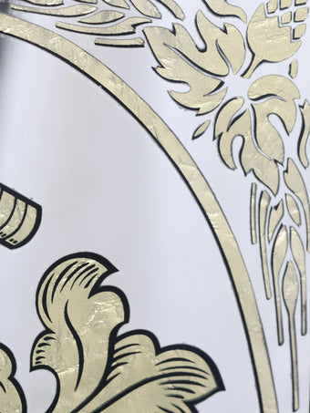 鏡面中央にはロゴが入り、周りのゴールドの模様がクラシックな雰囲気を引き立てます。