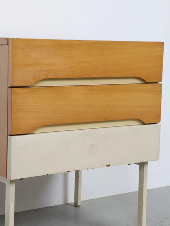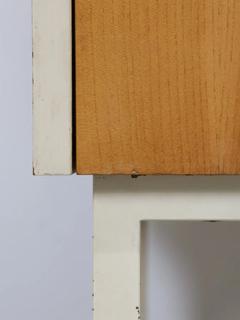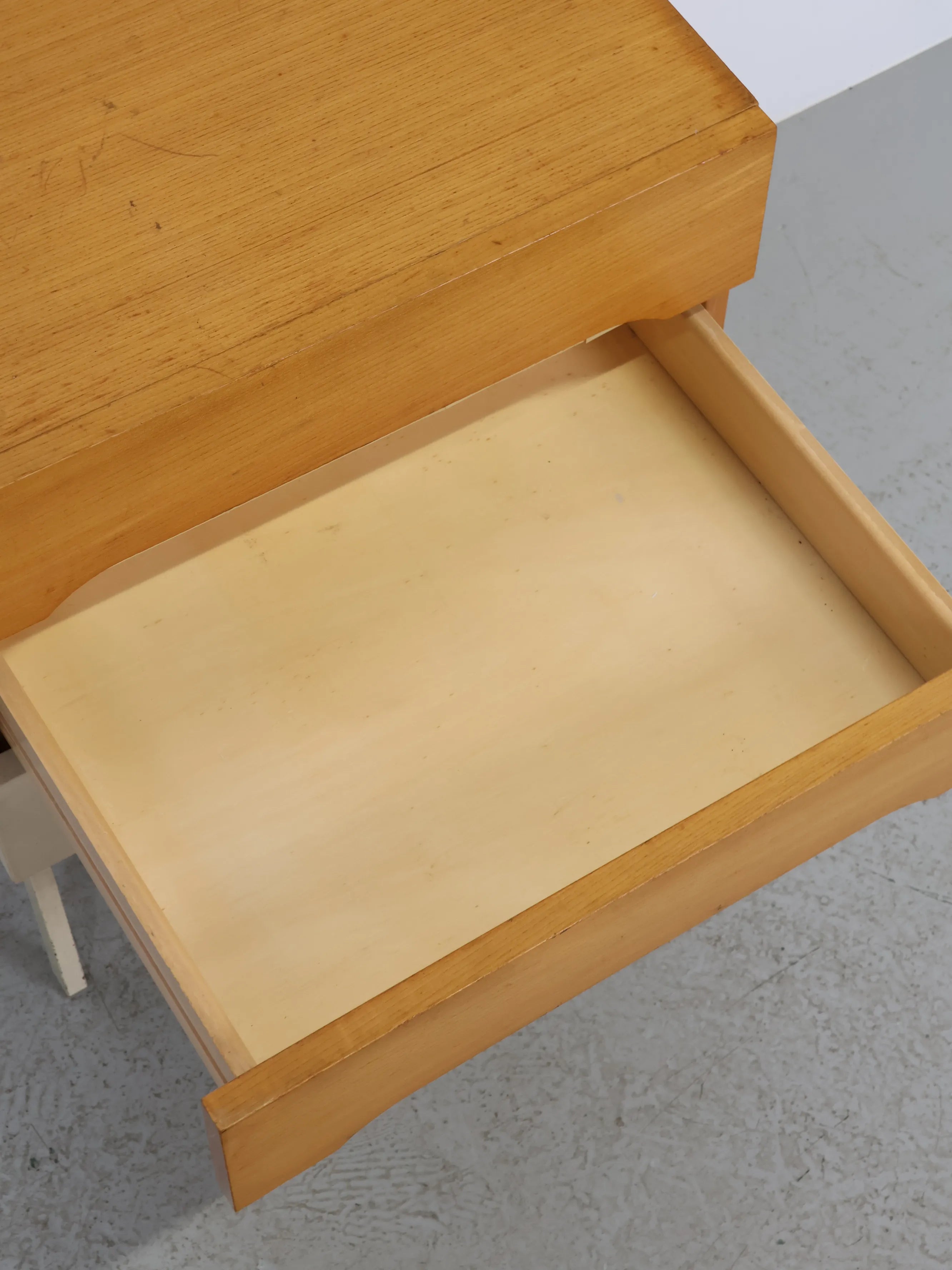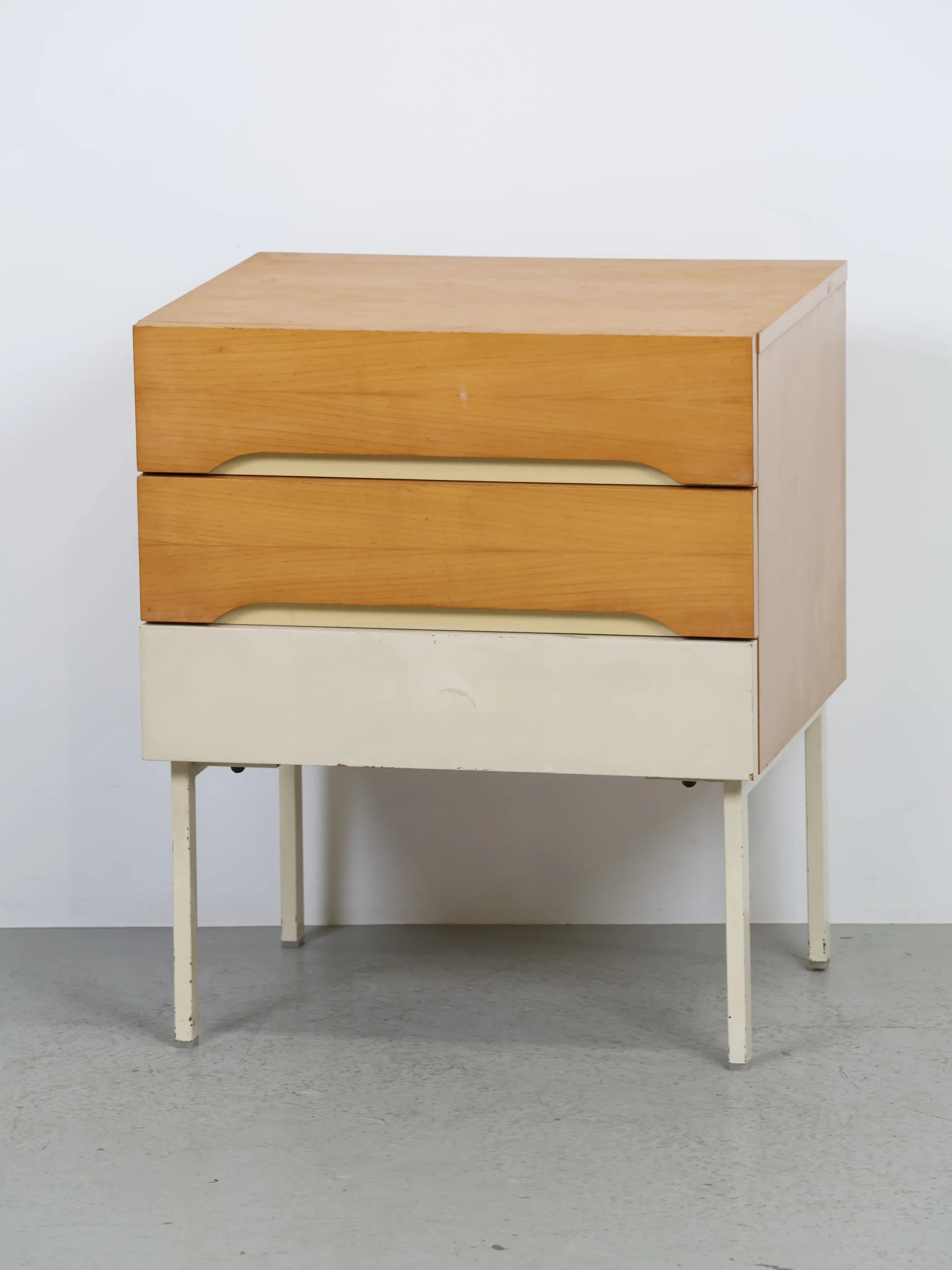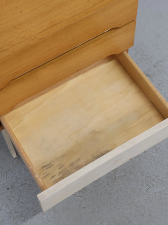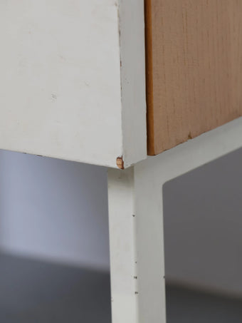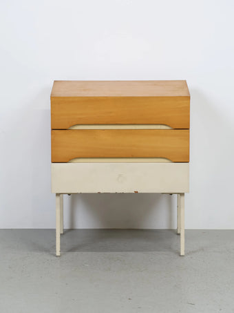 ナチュラルな木目の引き出しと、ホワイトペイントの2トーンカラーが印象的なミッドセンチュリーデザインのナイトテーブル。