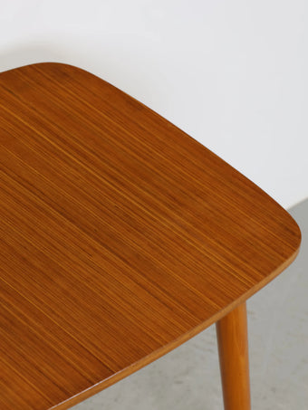 丸みを帯びた角の天板と、すっきりとしたテーパードレッグ(先細りの脚)が特徴的で、シンプルながらも当時のデザインらしい軽やかな印象を与える一台です。