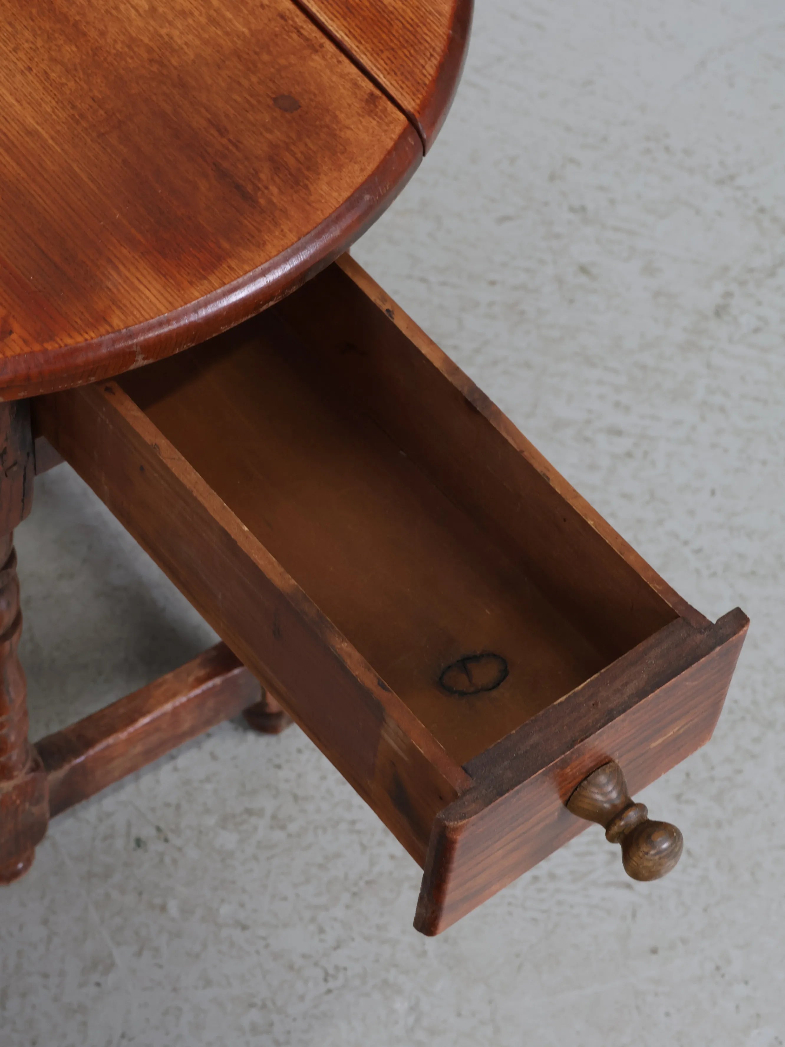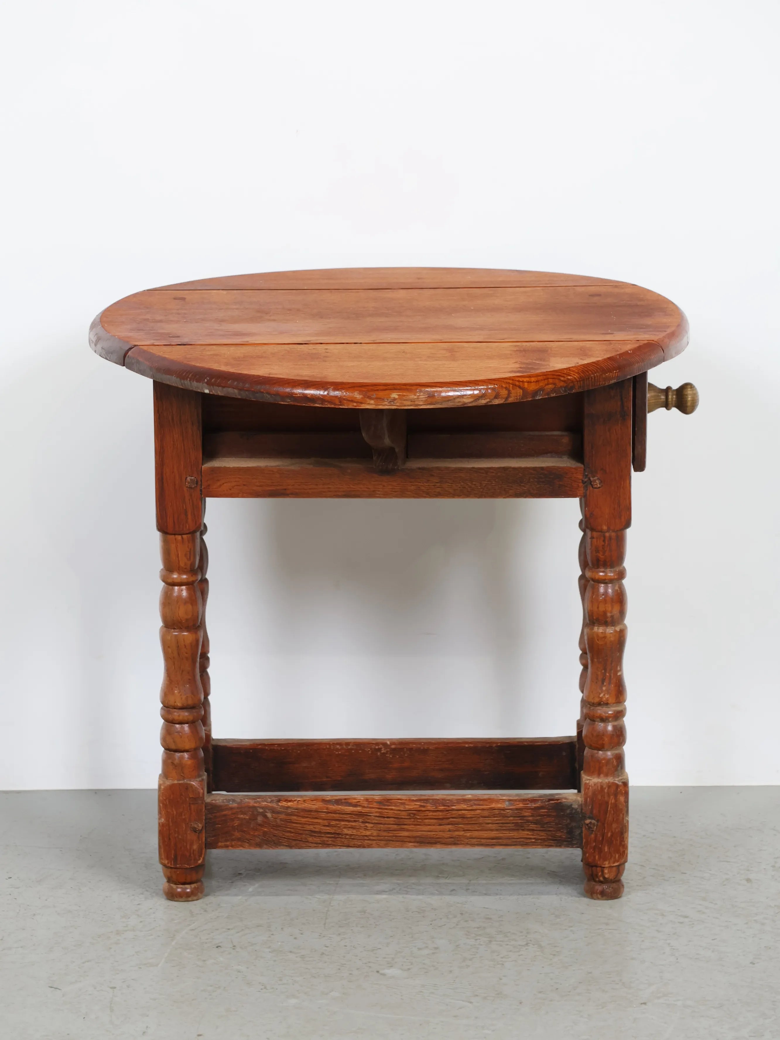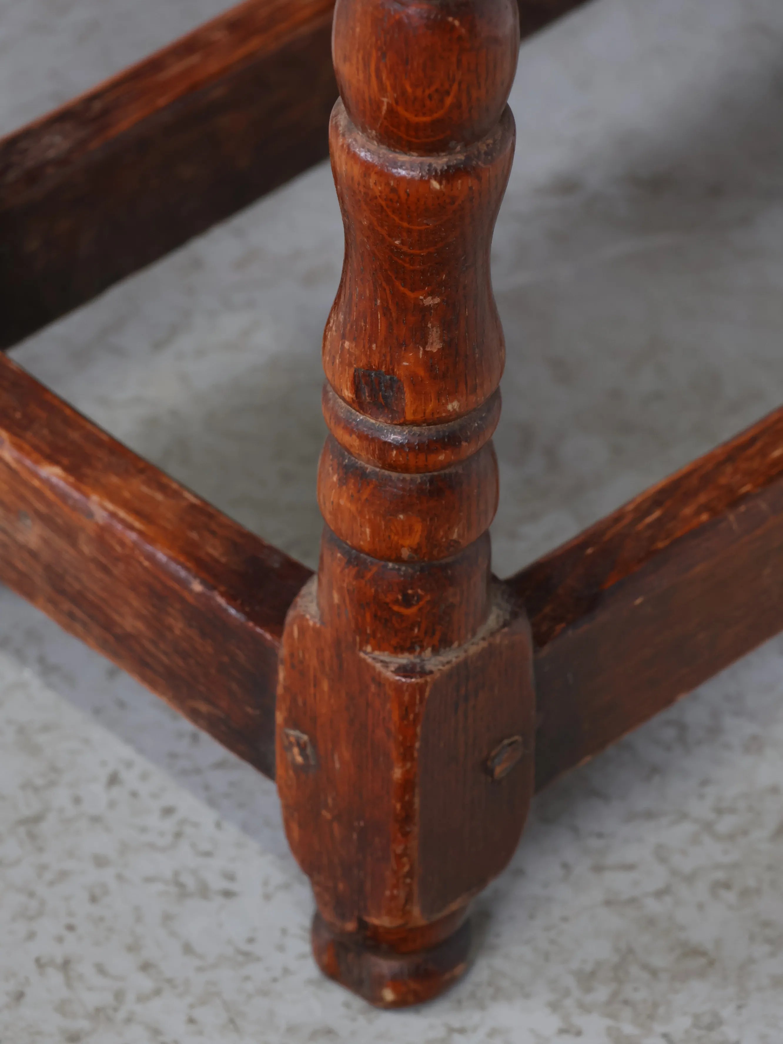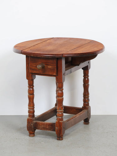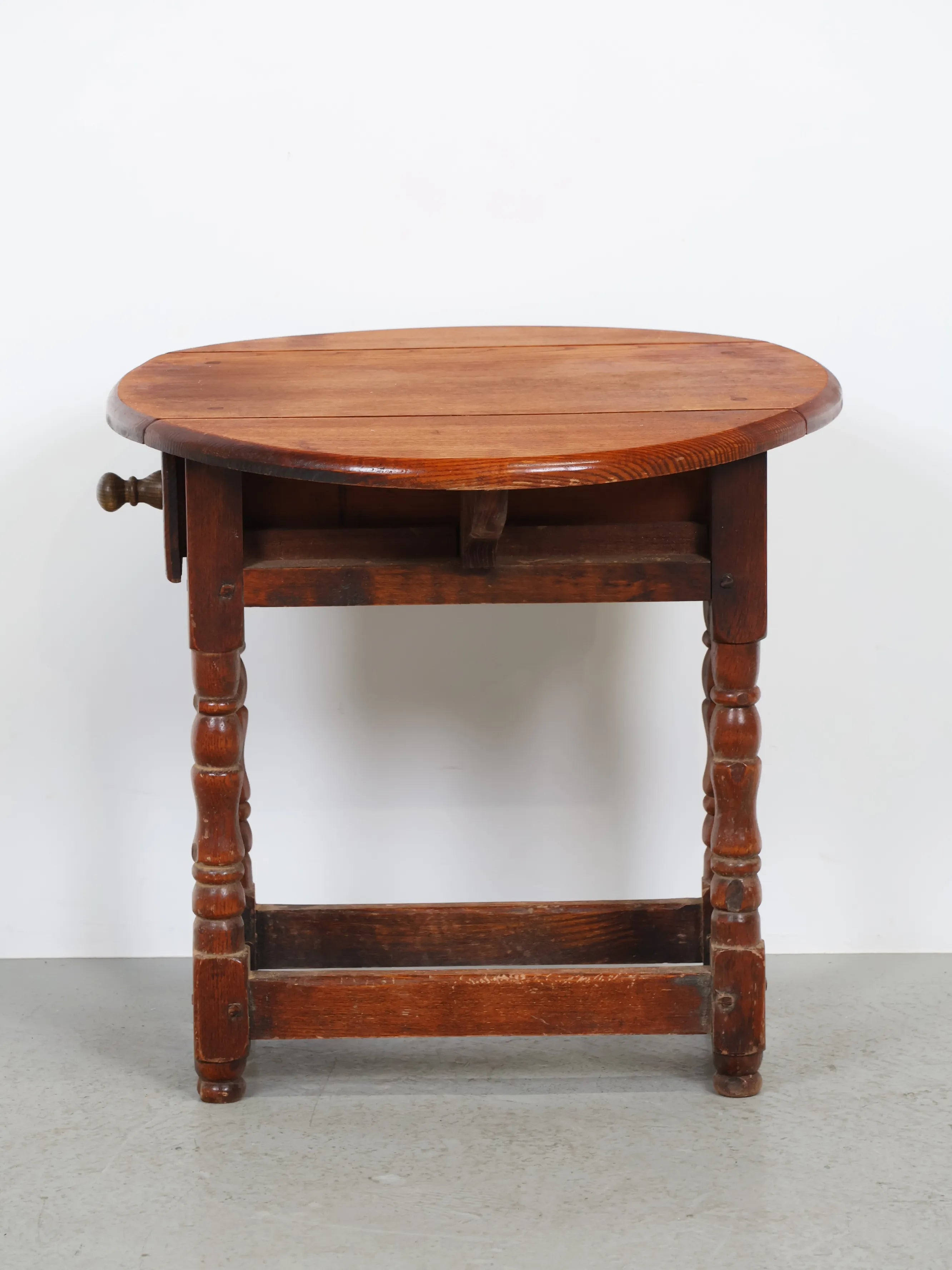 クラシカルな挽物(ひきもの)加工の脚部が特徴的で、アンティーク家具らしい温もりと存在感を放つ逸品。