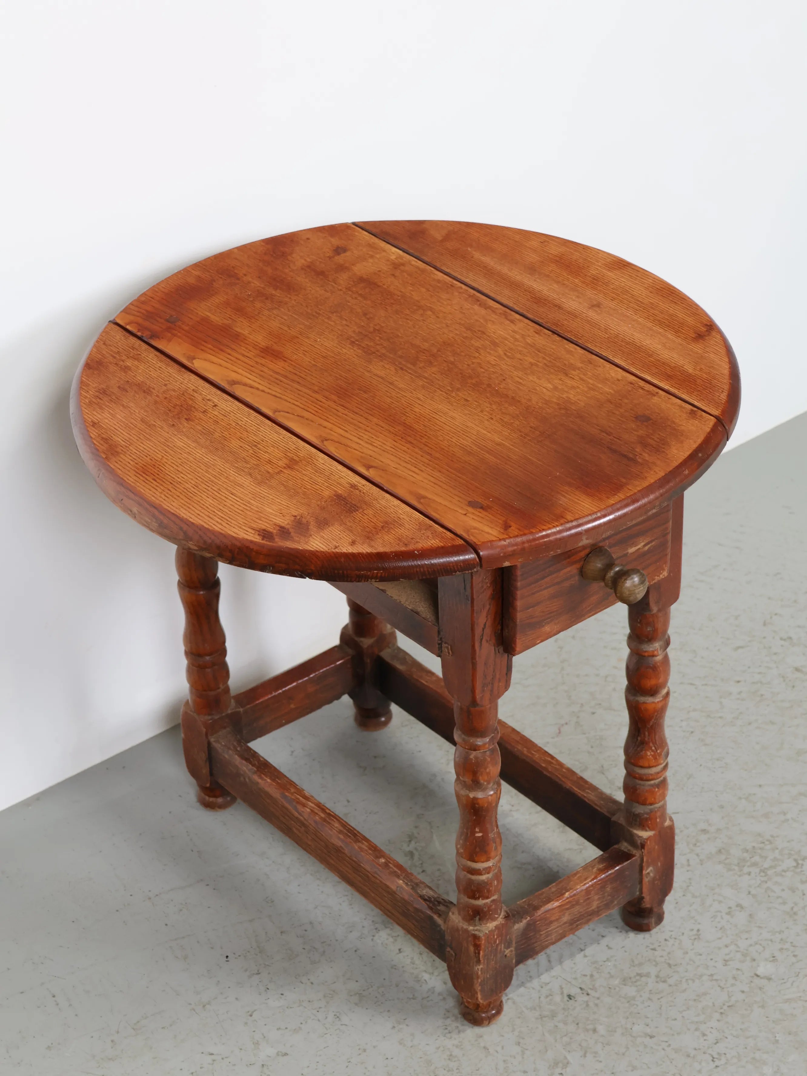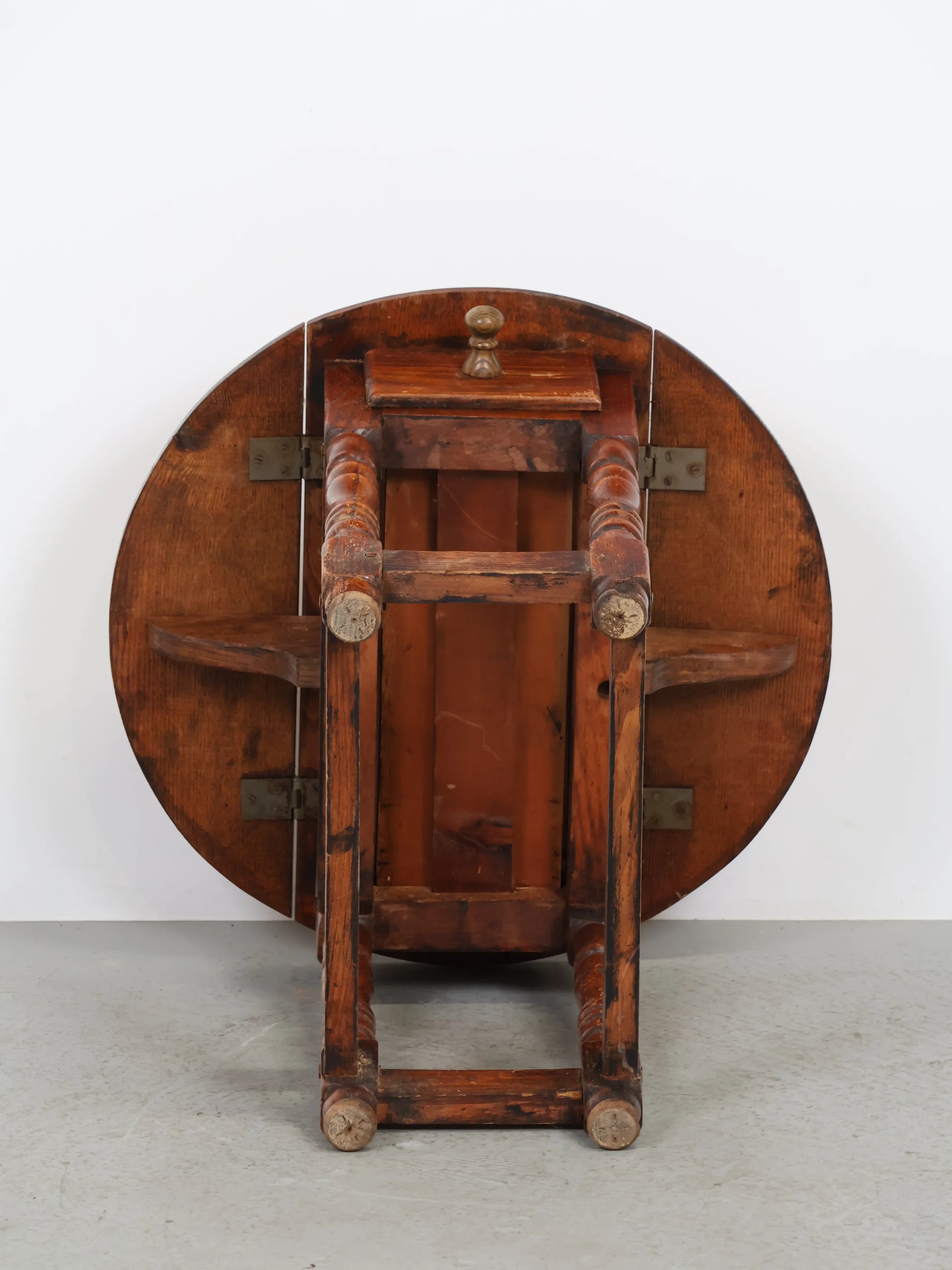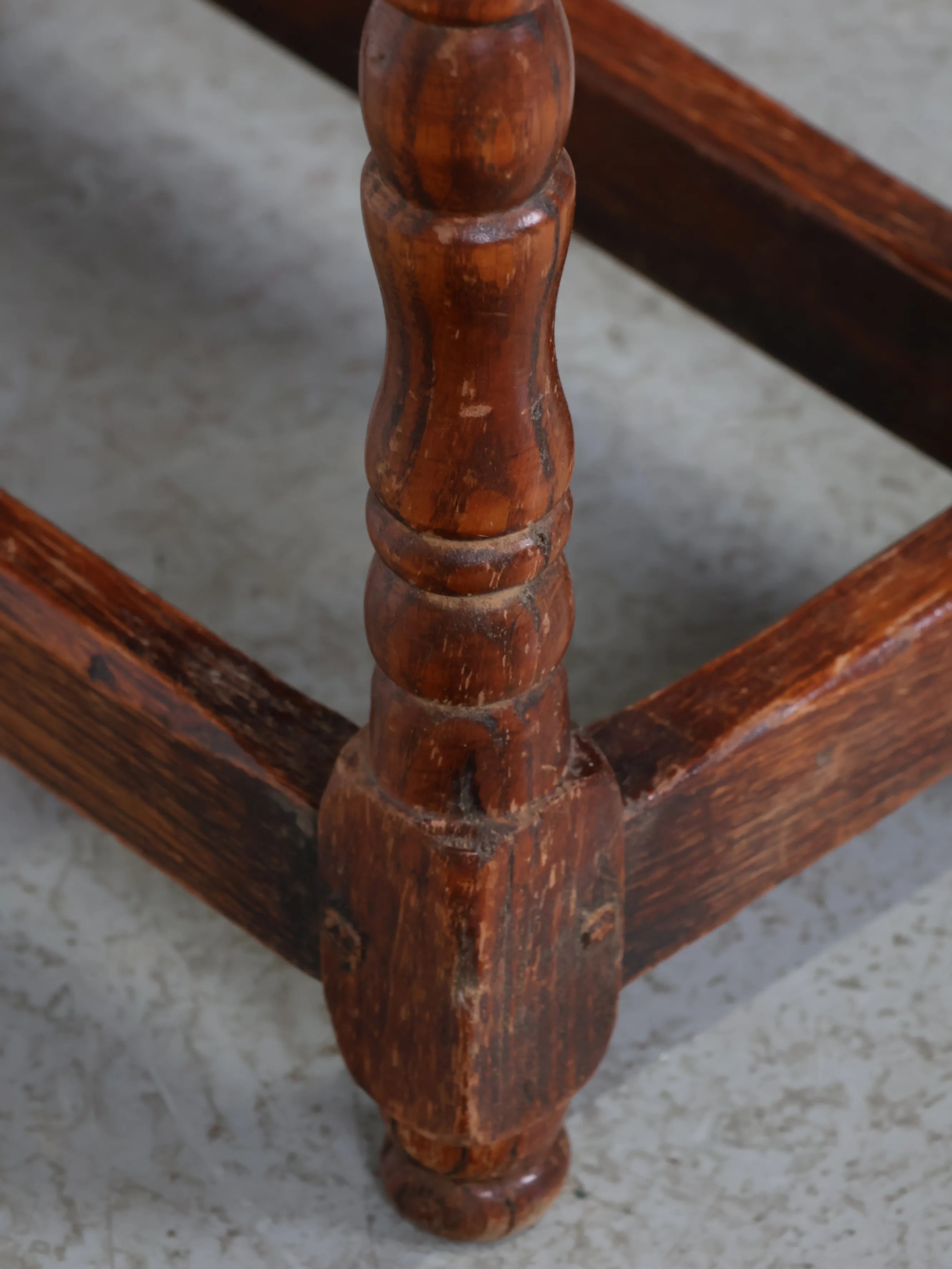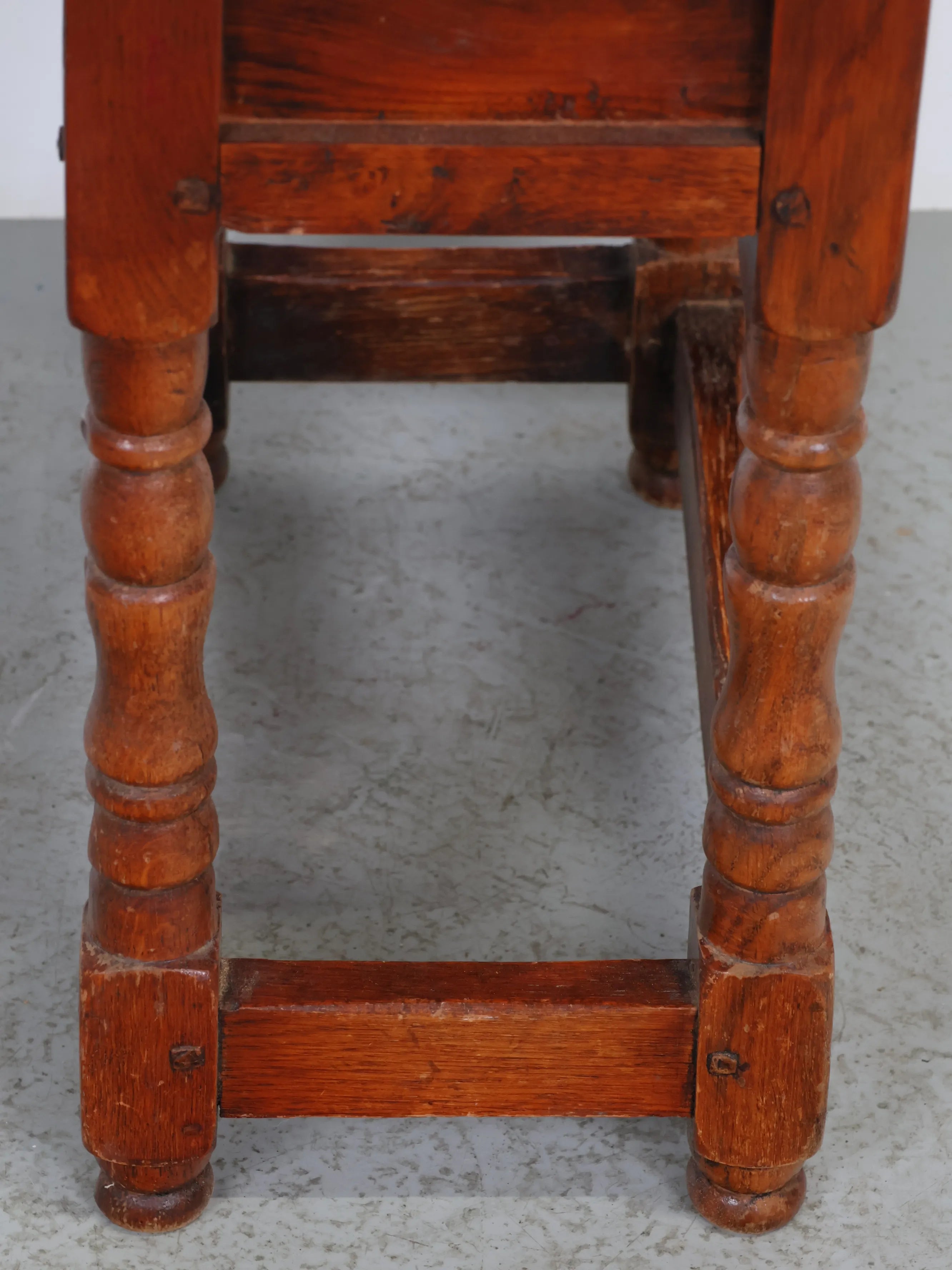 クラシカルな挽物(ひきもの)加工の脚部が特徴的で、アンティーク家具らしい温もりと存在感を放つ逸品。