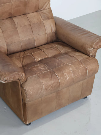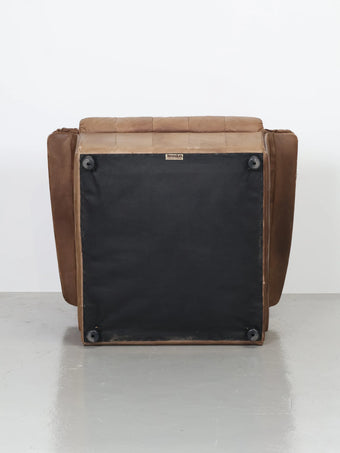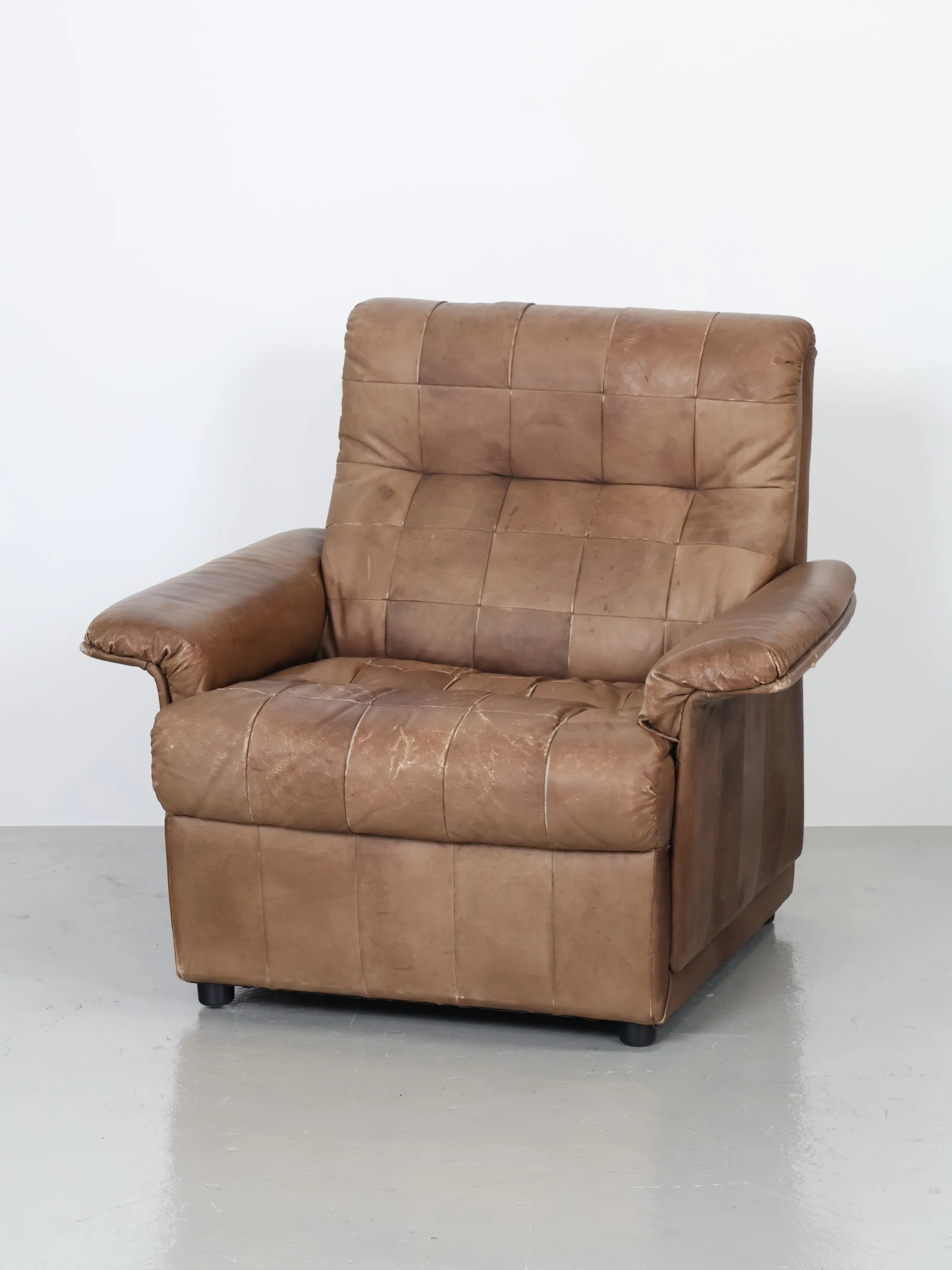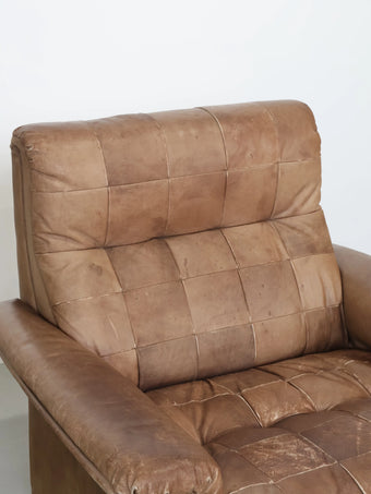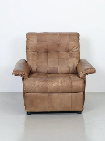 上質なブラウンのレザーを使用し、座面と背面の格子状になったパッチワークのようなチェッカー柄が良いアクセントになっている一人がけソファ。
