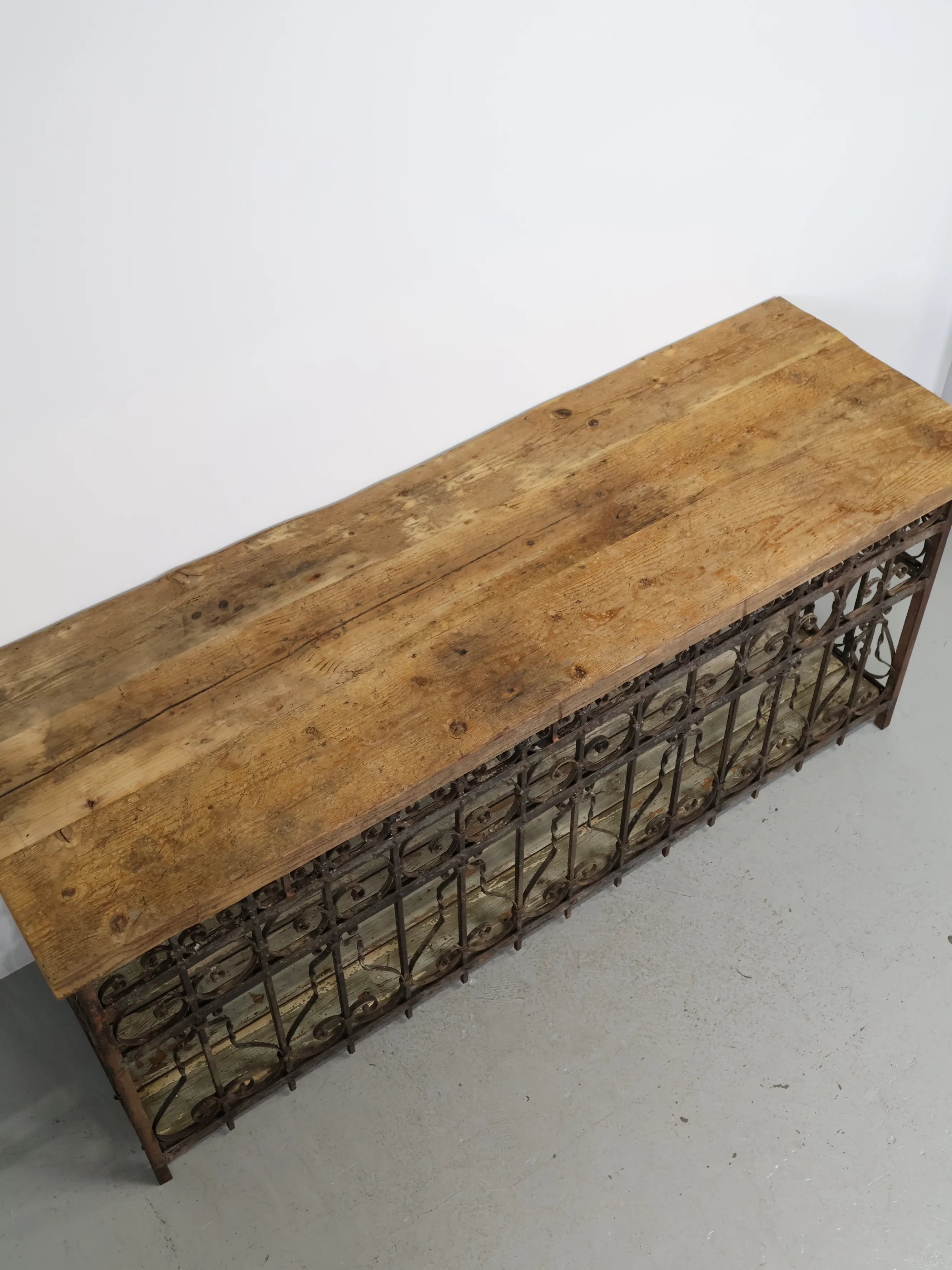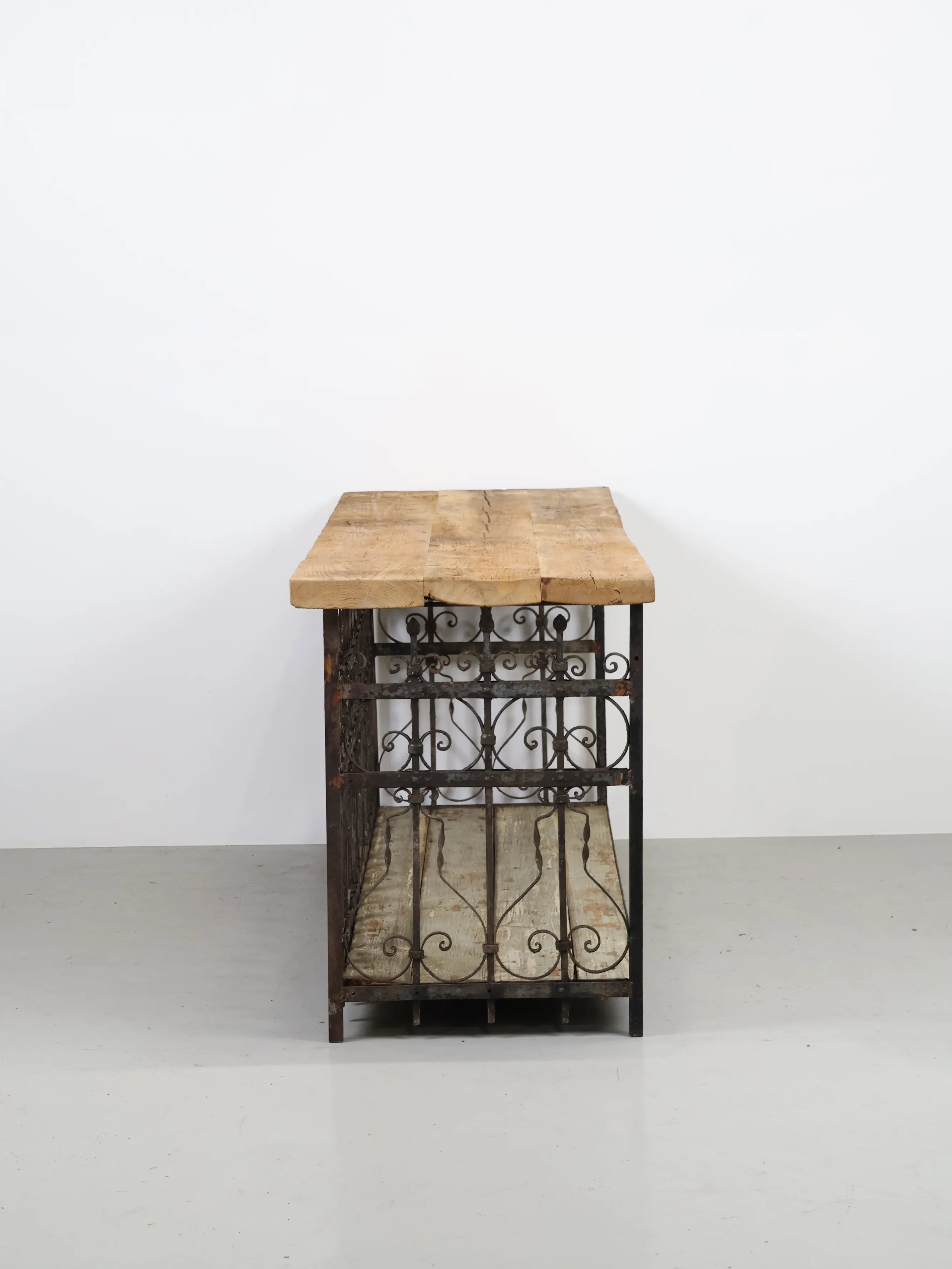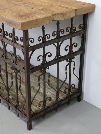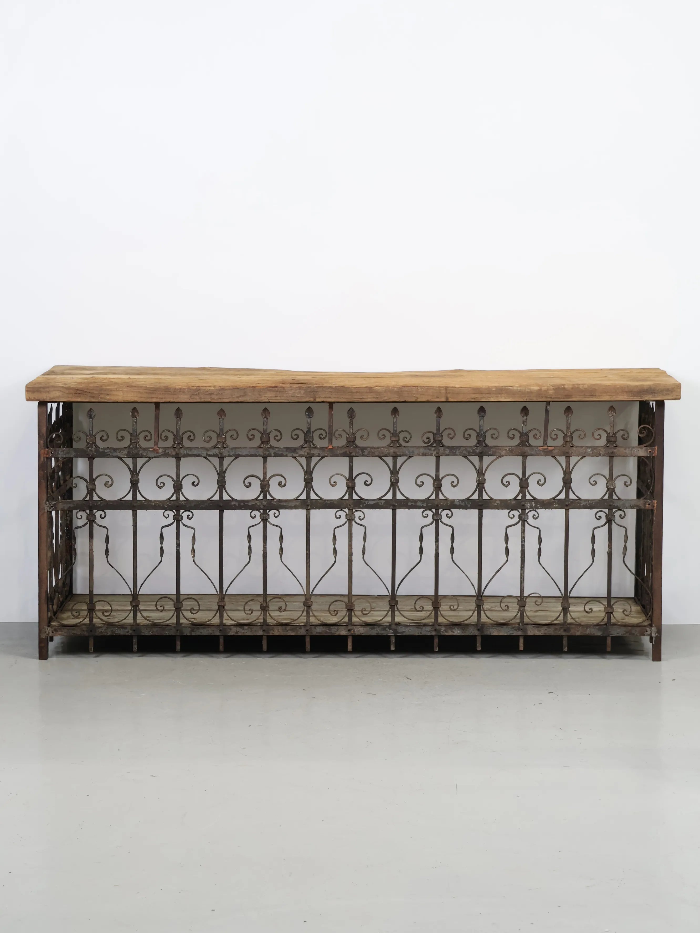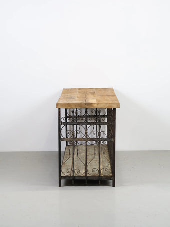 重厚なアイアンフレームに、風合い豊かな無垢材天板を組み合わせたロングカウンター。