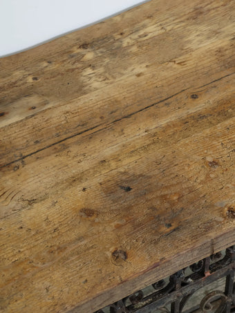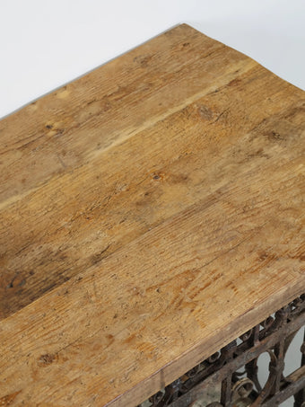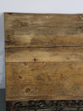 トップには長年使い込まれてきた古材が使用されており、節や木目のムラ、擦れ跡や染みなど、時間の積み重なりを感じさせる表情が随所に見られます。