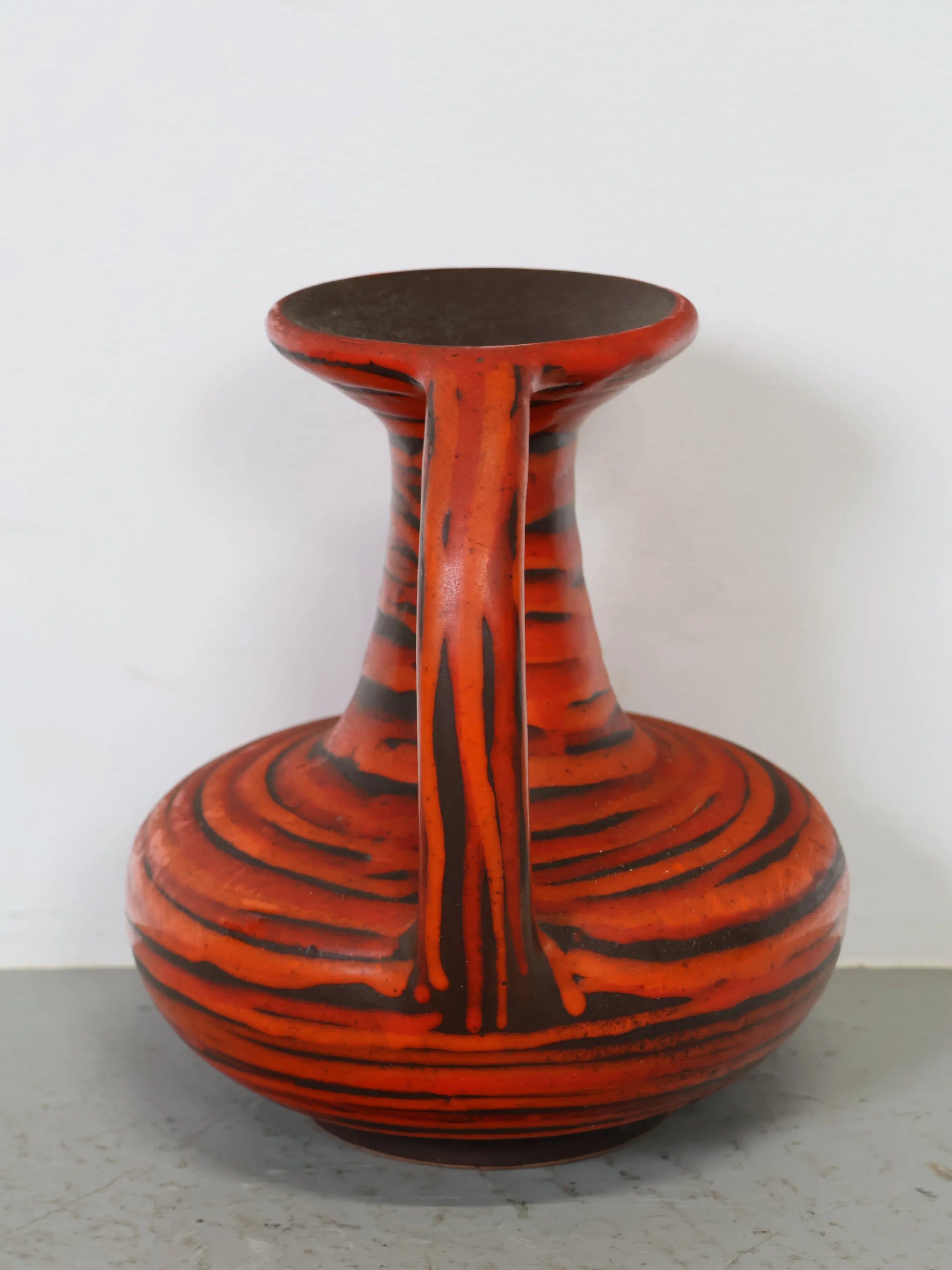 このような大胆な色使いや流動的な釉薬表現は、当時のヨーロッパ陶器に多く見られ、インテリアのアクセントとして高く評価されています。