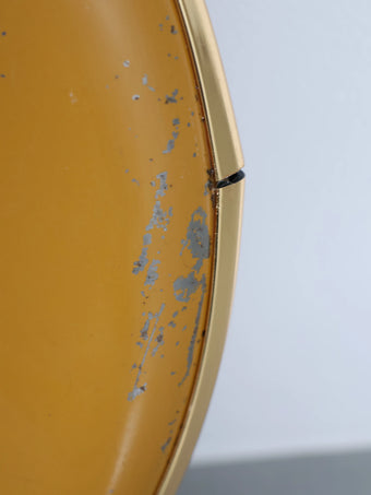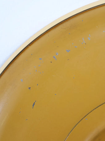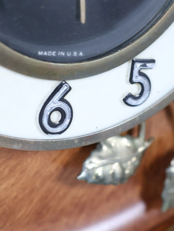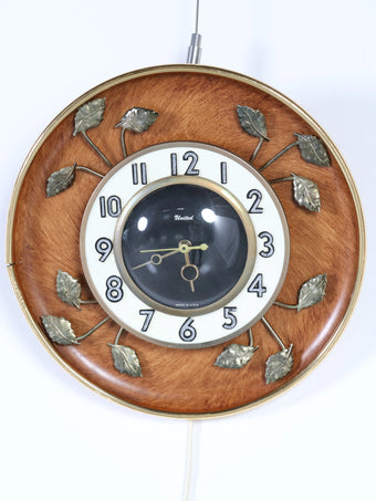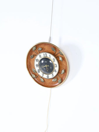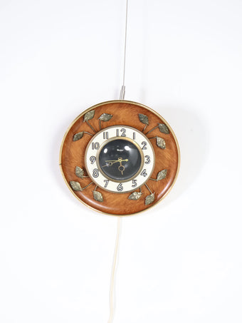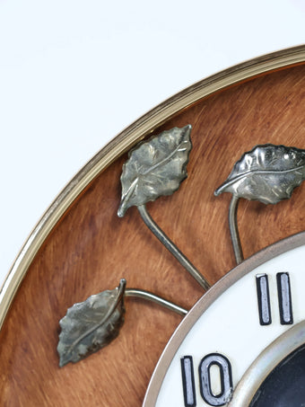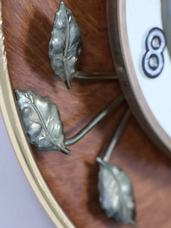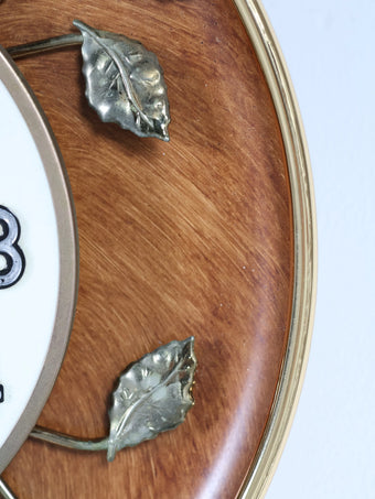 小ぶりな円形がとても可愛らしく、木目調の背景に彩られた立体的なブラス素材のリーフが自然を感じられる当時ならではの手の込んだデザイン。