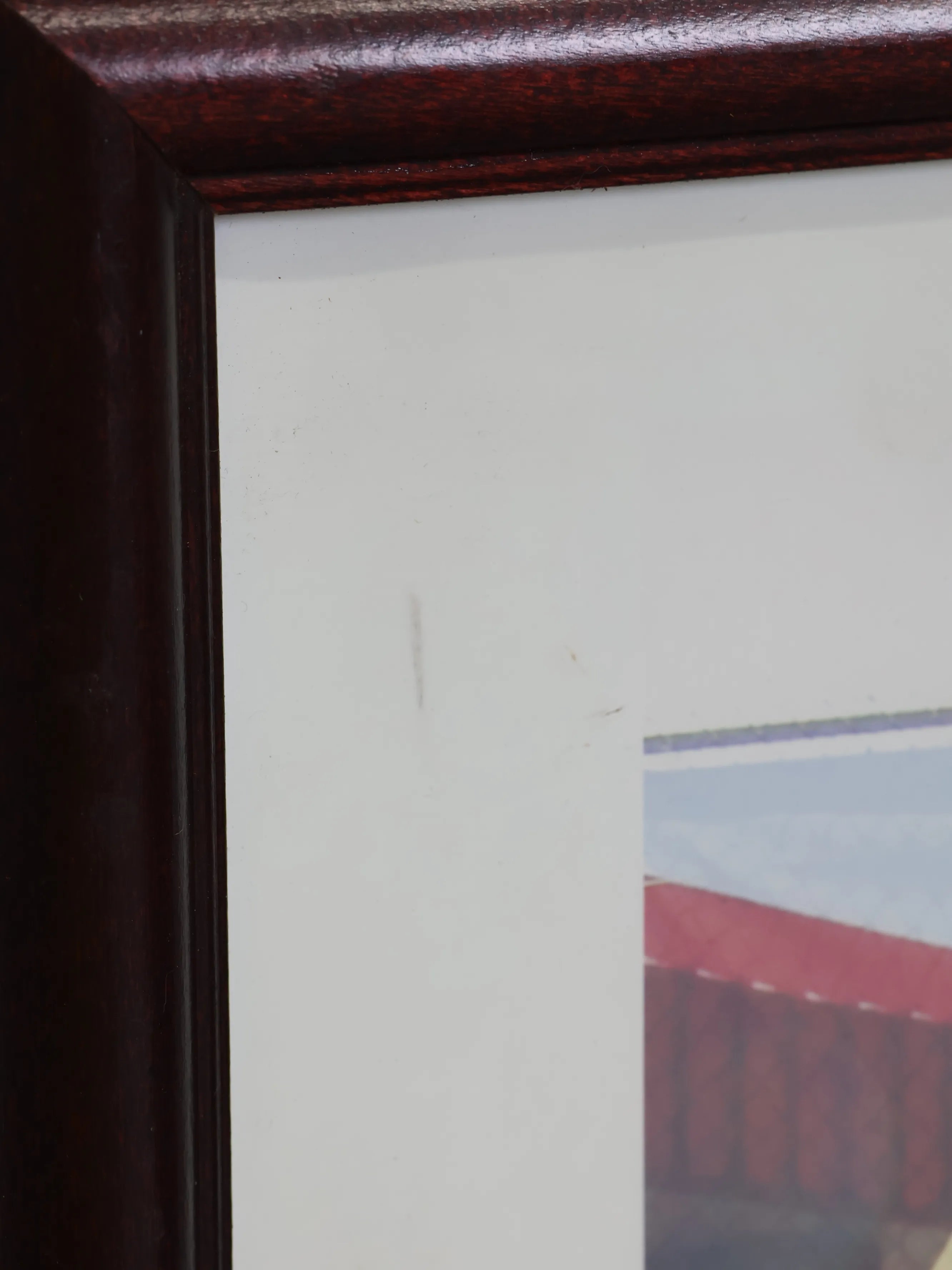中央に配置された赤いクラシックカーは存在感があり、ガレージテイストやアメリカンヴィンテージインテリアとの相性も抜群。横長フォーマットのため、壁面にリズムを持たせるアクセントとしても取り入れやすい一枚です。