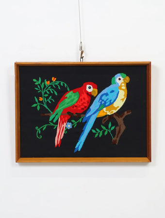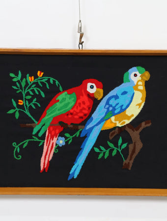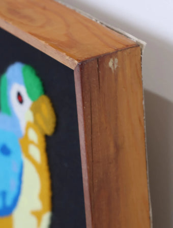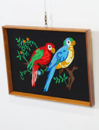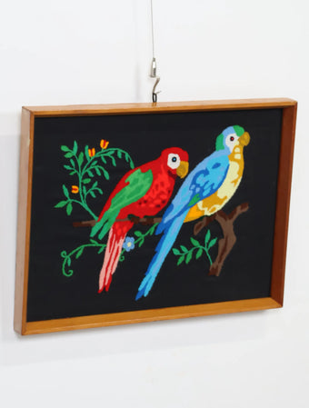 ヴィンテージ ウッドフレーム オウムデザイン ファブリックアート ウォールデコ
