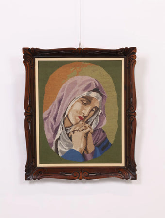ファブリックで編み込まれて作られたマリアの肖像画。