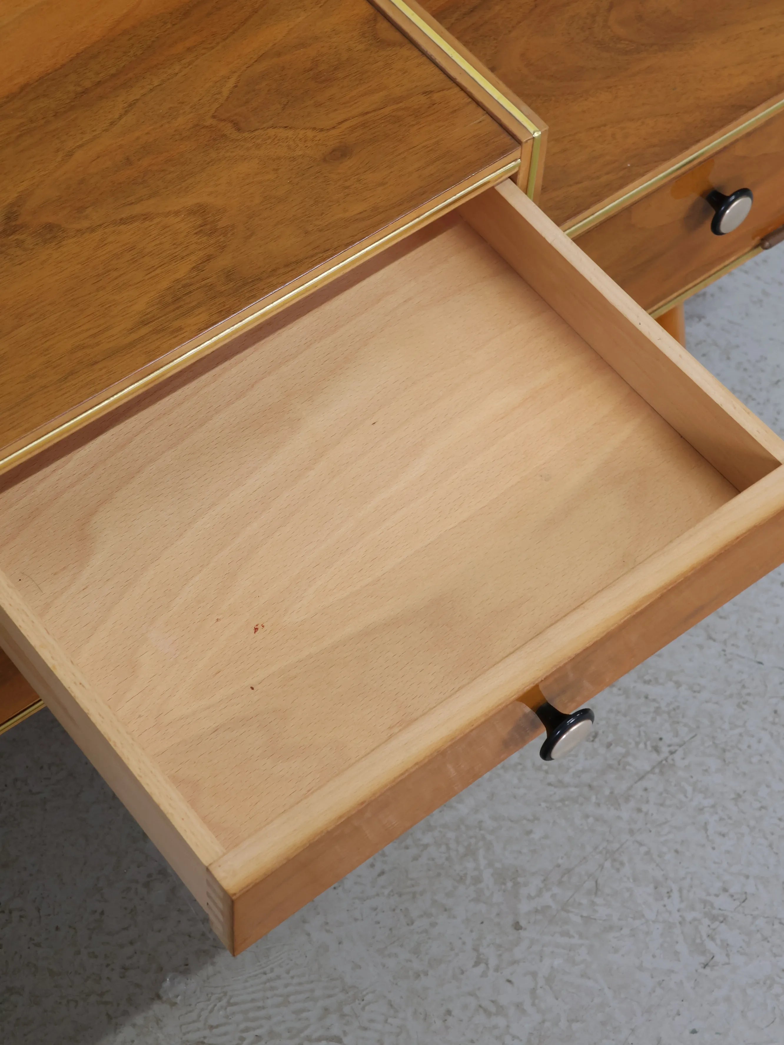 - サイズ (mm):横幅:1205 高さ:500 奥行:400 / 左天板 横幅:880 高さ:475 奥行:355 / 右天板 横幅:320 高さ:385 奥行:375 / 左収納 横幅:440 高さ:225 奥行:370 / 中央引出し 横幅:355 高さ:50 奥行:315 / 右収納 横幅:300 高さ:130 奥行:370