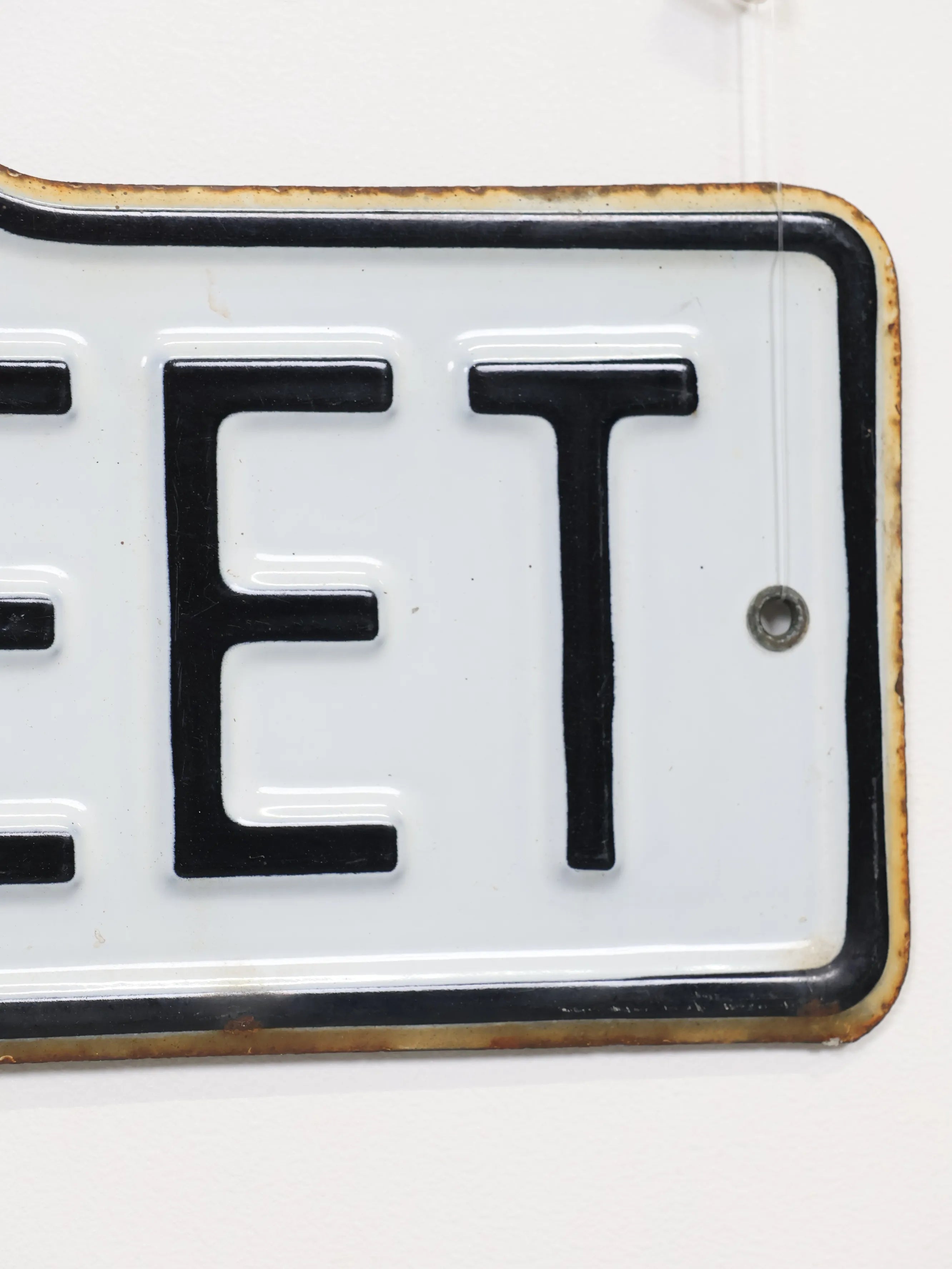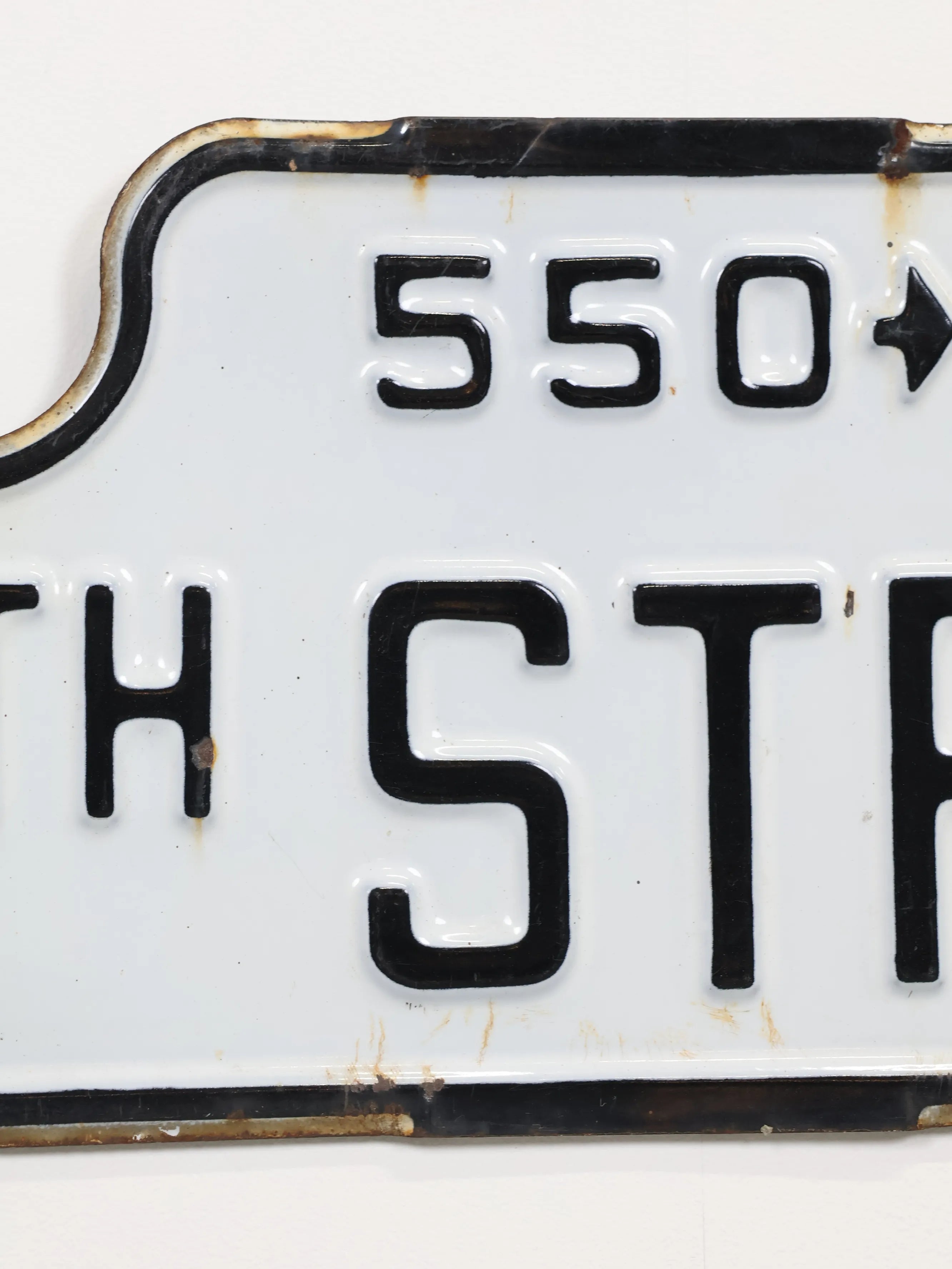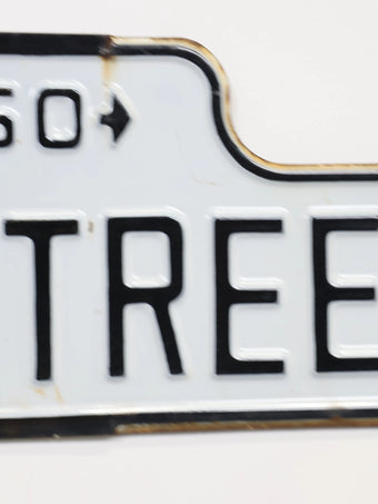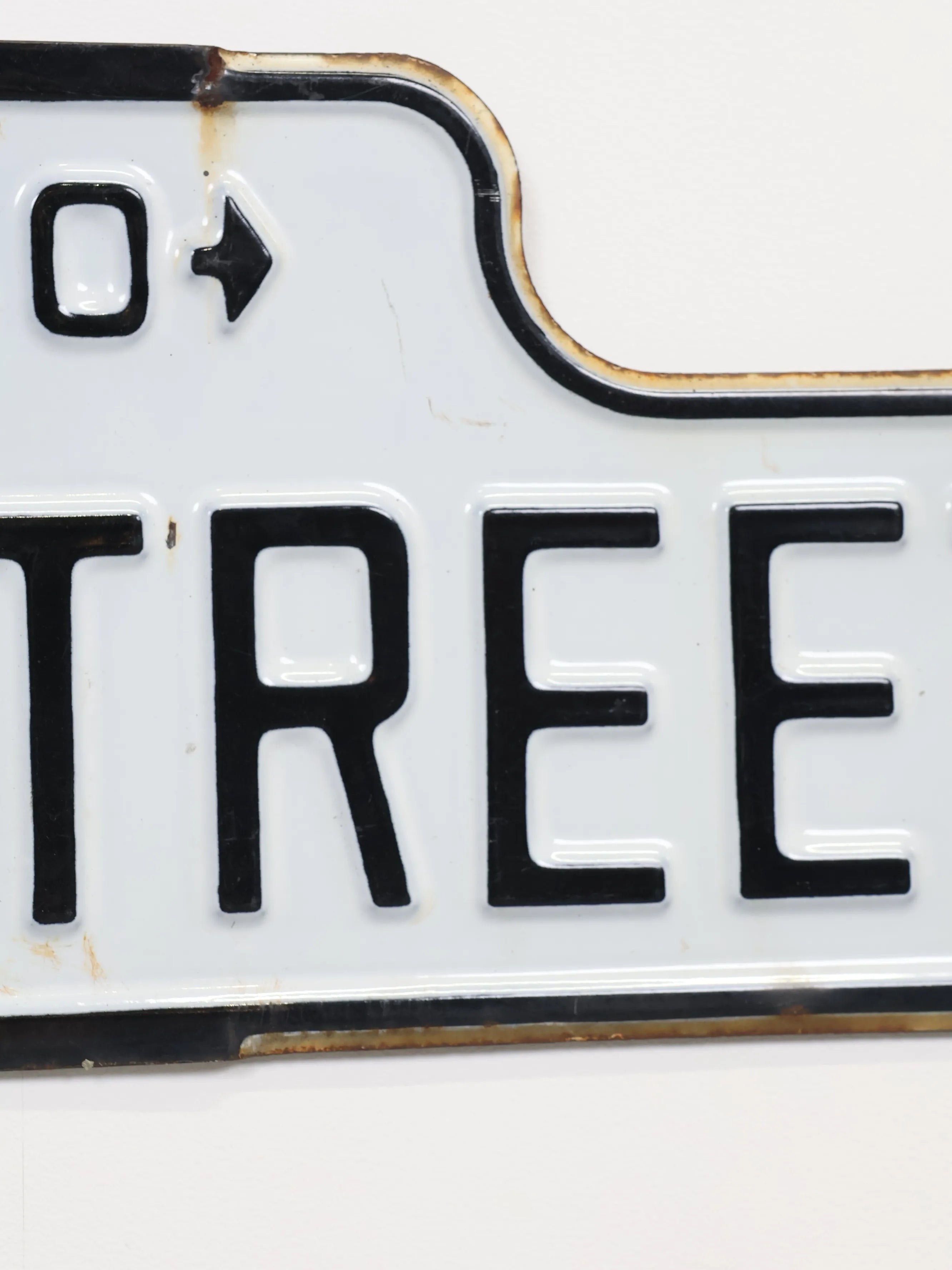 実際に道路標識として使用されていたストリートサインで、シンプルかつ機能美を感じさせるデザインが魅力の一枚。