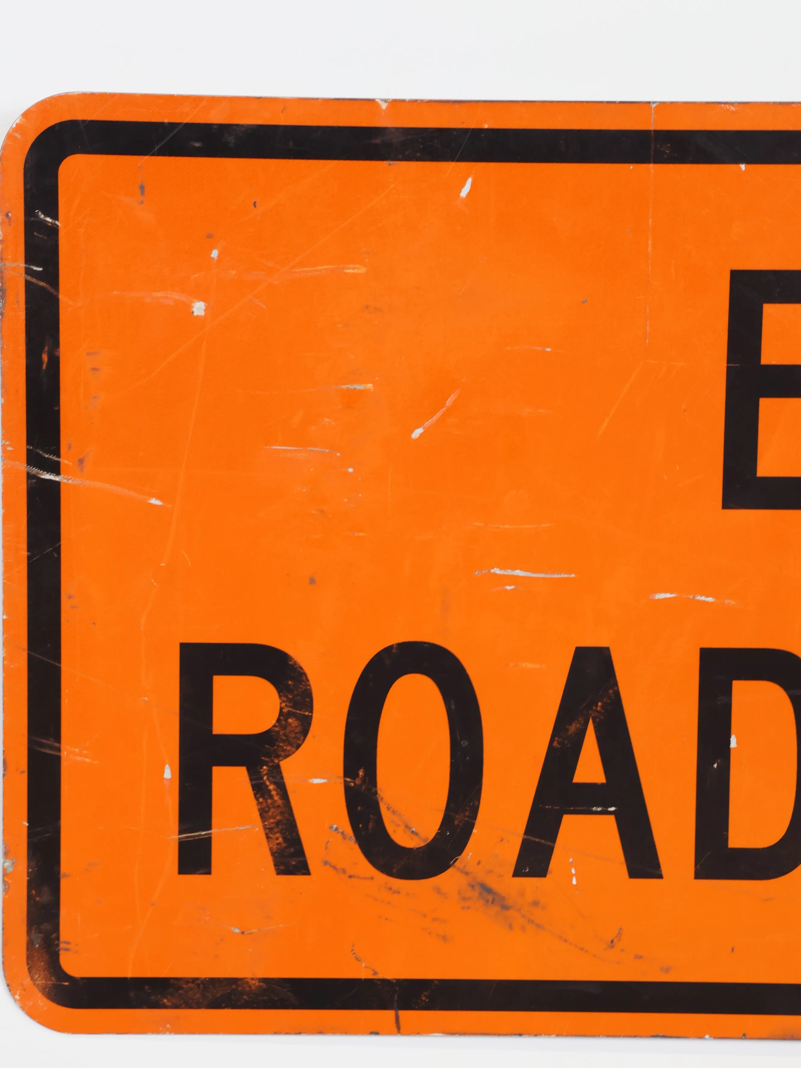 実際に道路工事現場で使用されていた案内用サインで、オレンジベースにブラックレタリングを配した、高い視認性を誇るロードサイン。