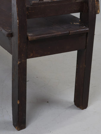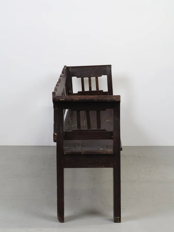 オランダより買い付けました1930年代-1940年代のダークブラウンペイントウッドチャーチ4シーターベンチです。