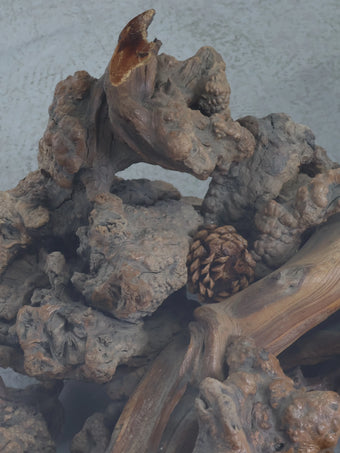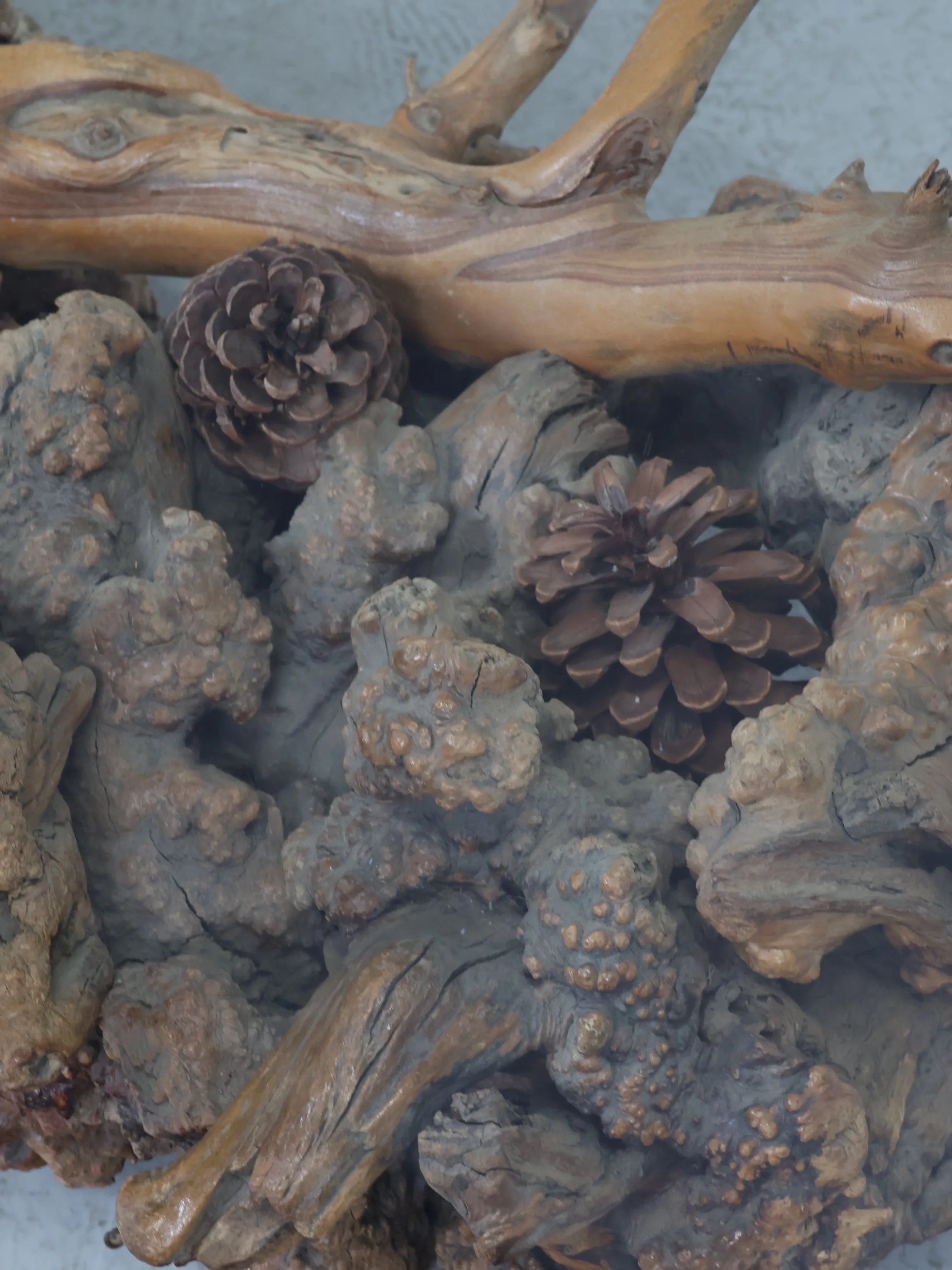 自然の力強さを感じる流木にはアクセントとして松ぼっくりも組み合わさっています。