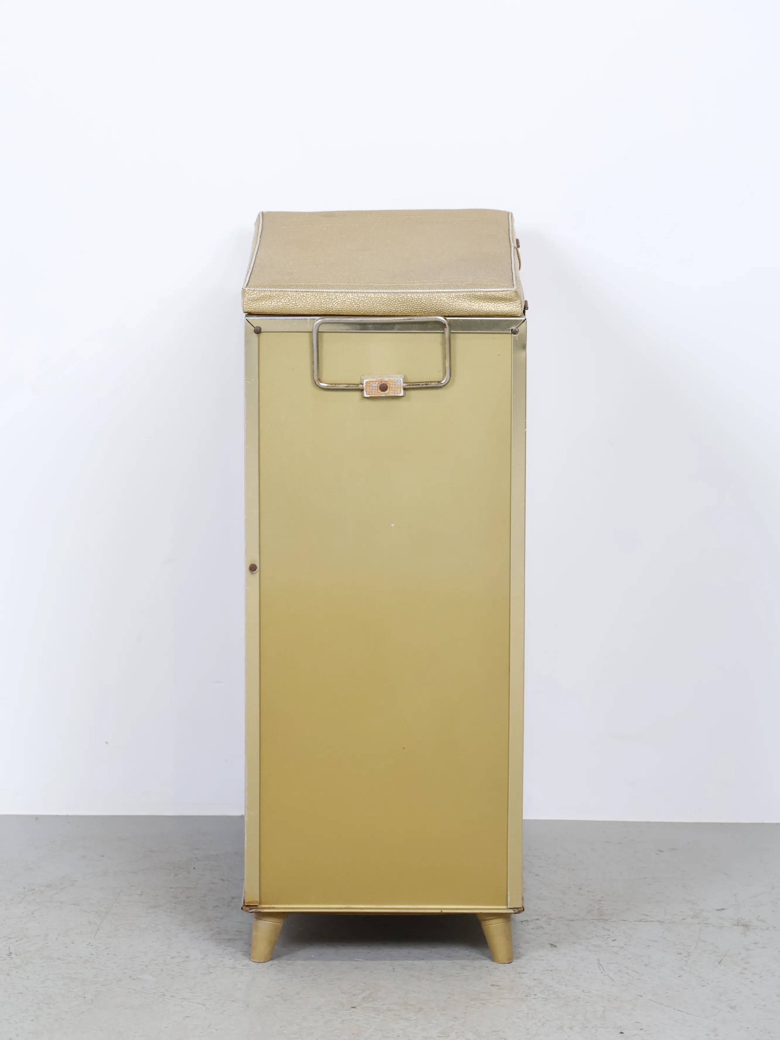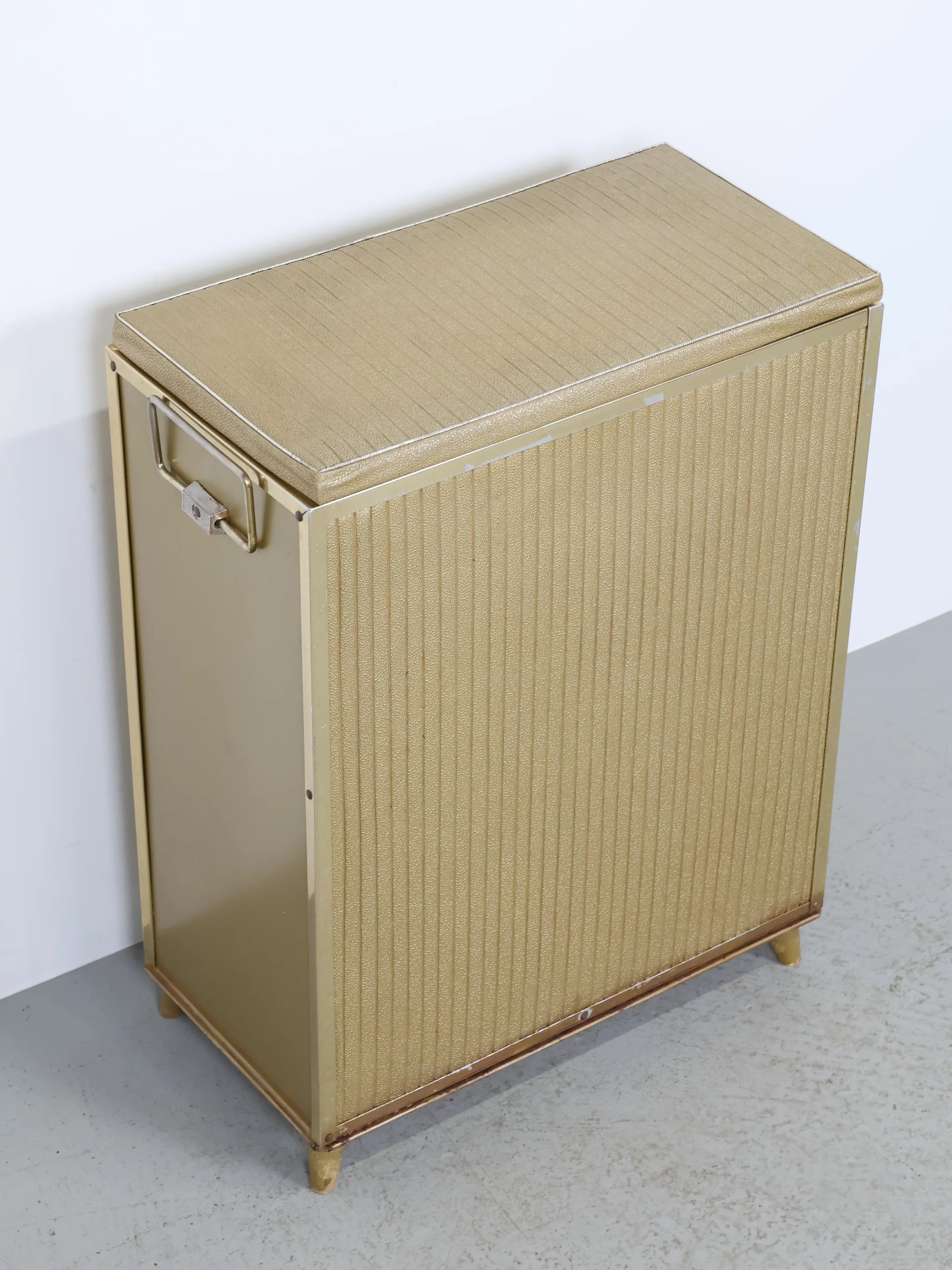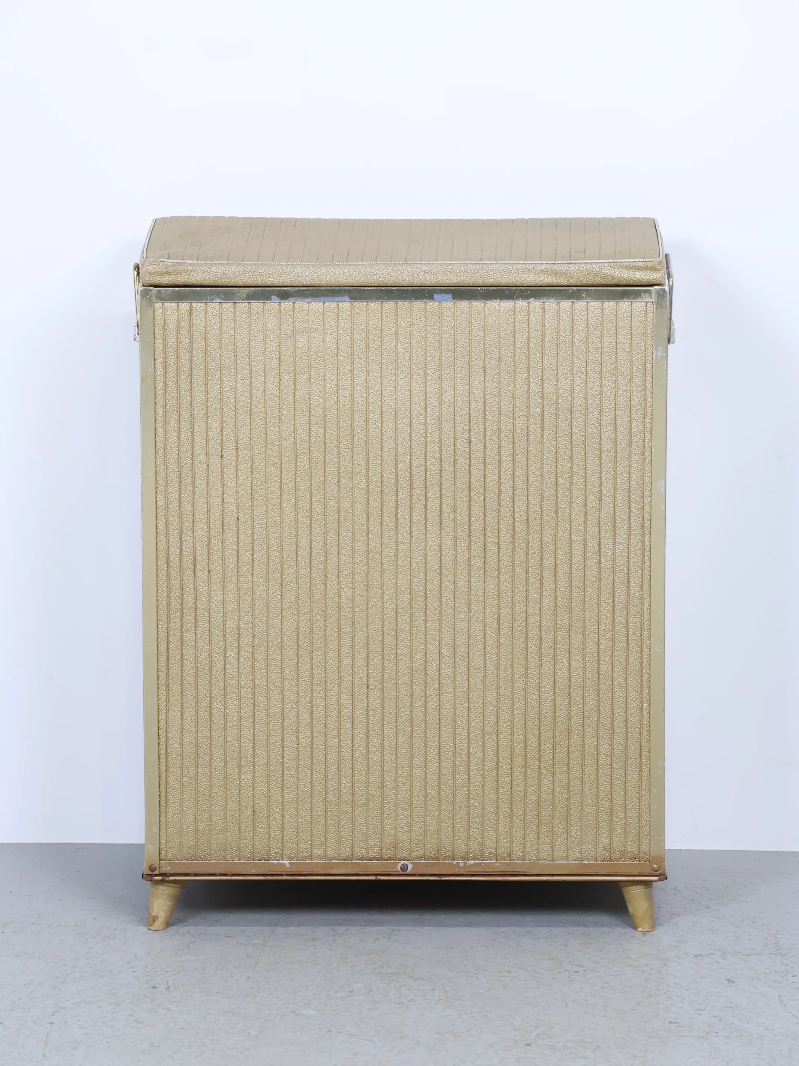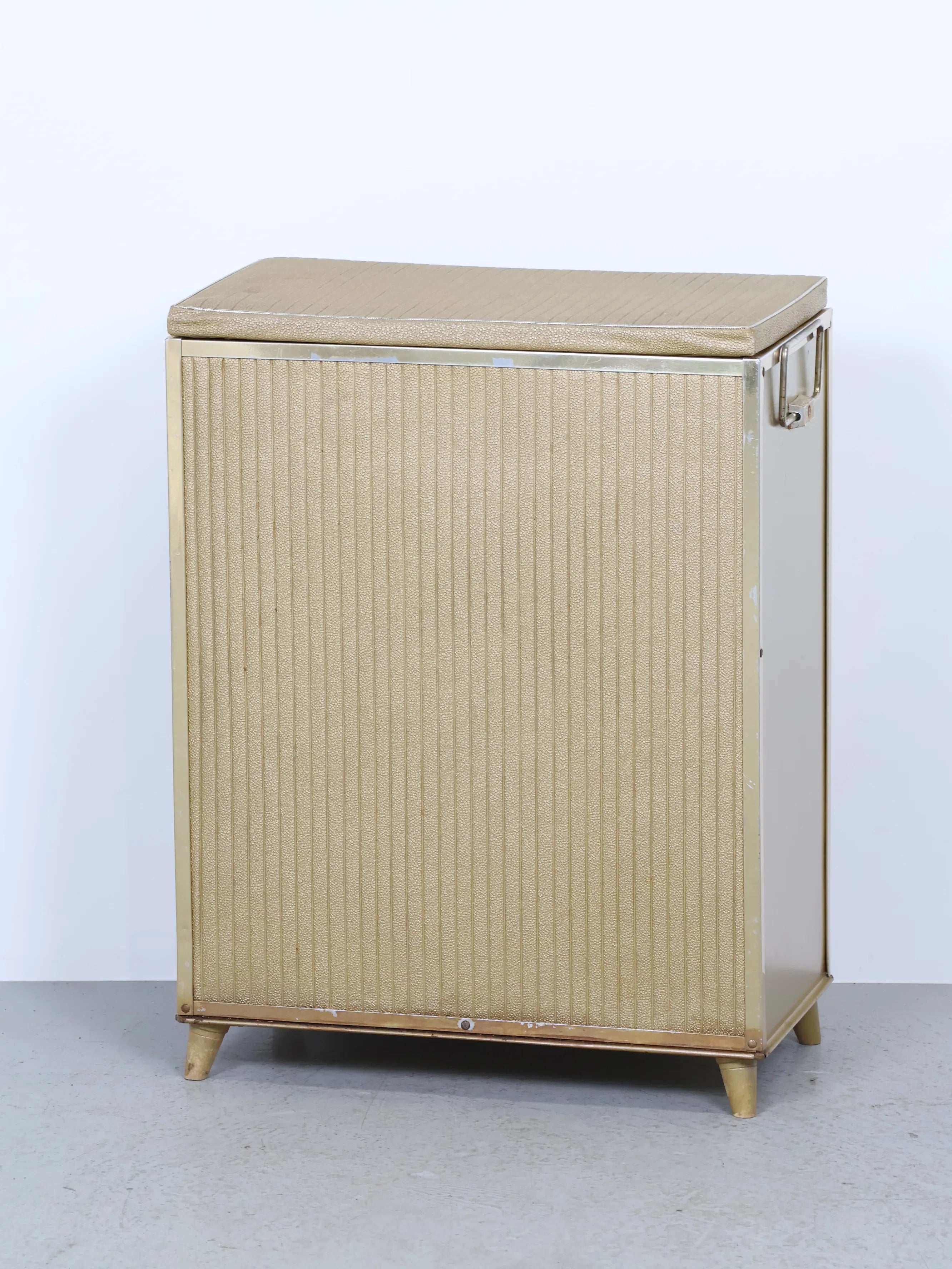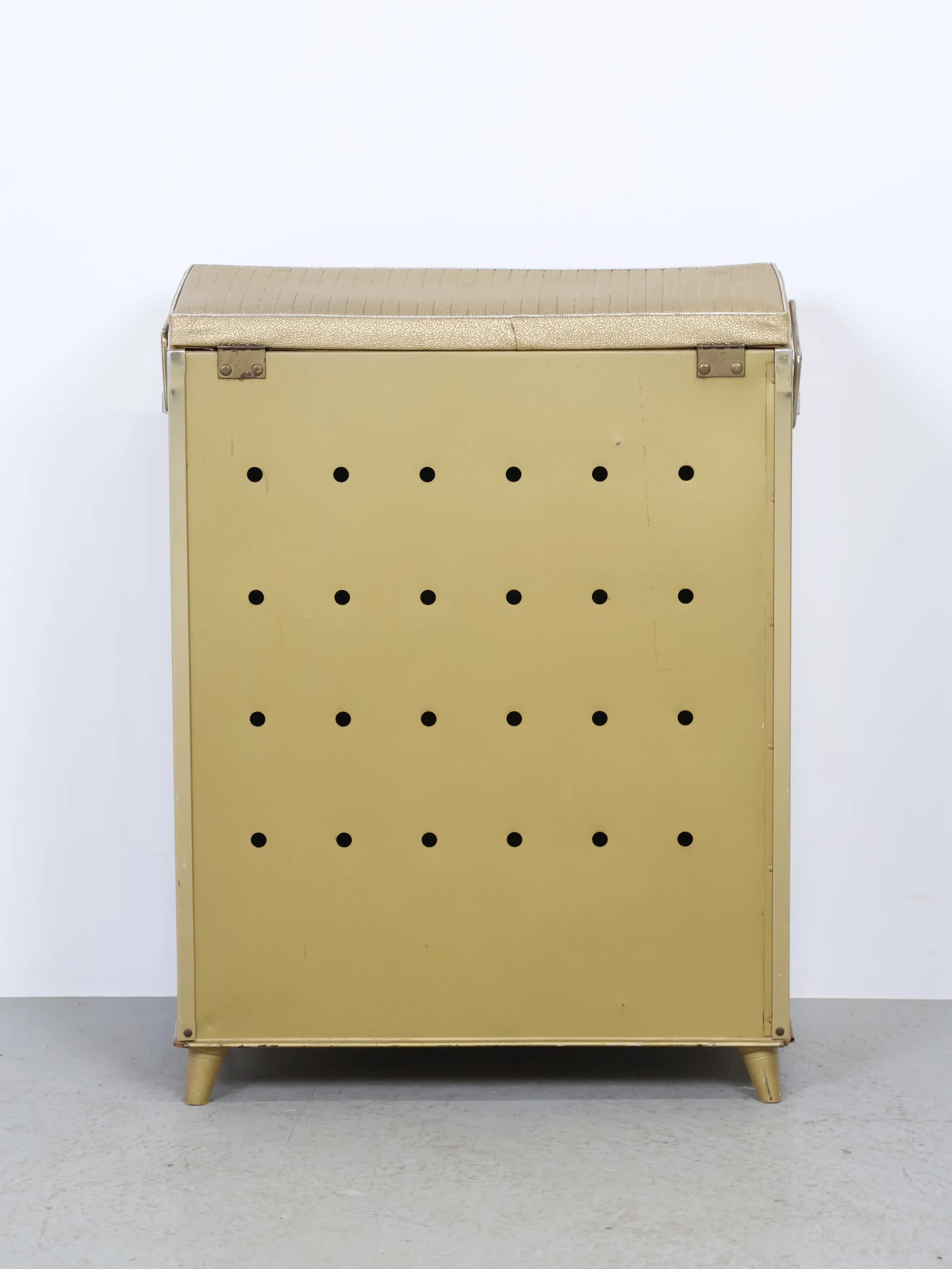 正面と側面にゴールドのビニールレザーが貼られたエレガント且つレトロなデザイン。