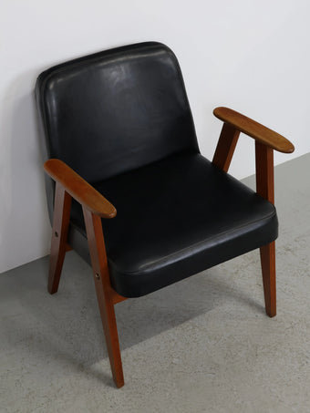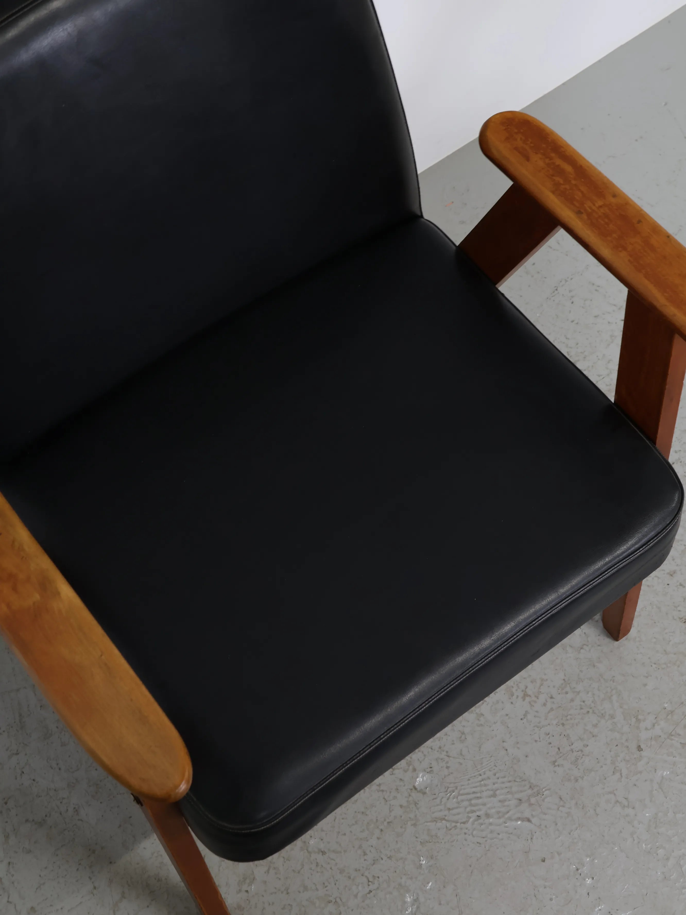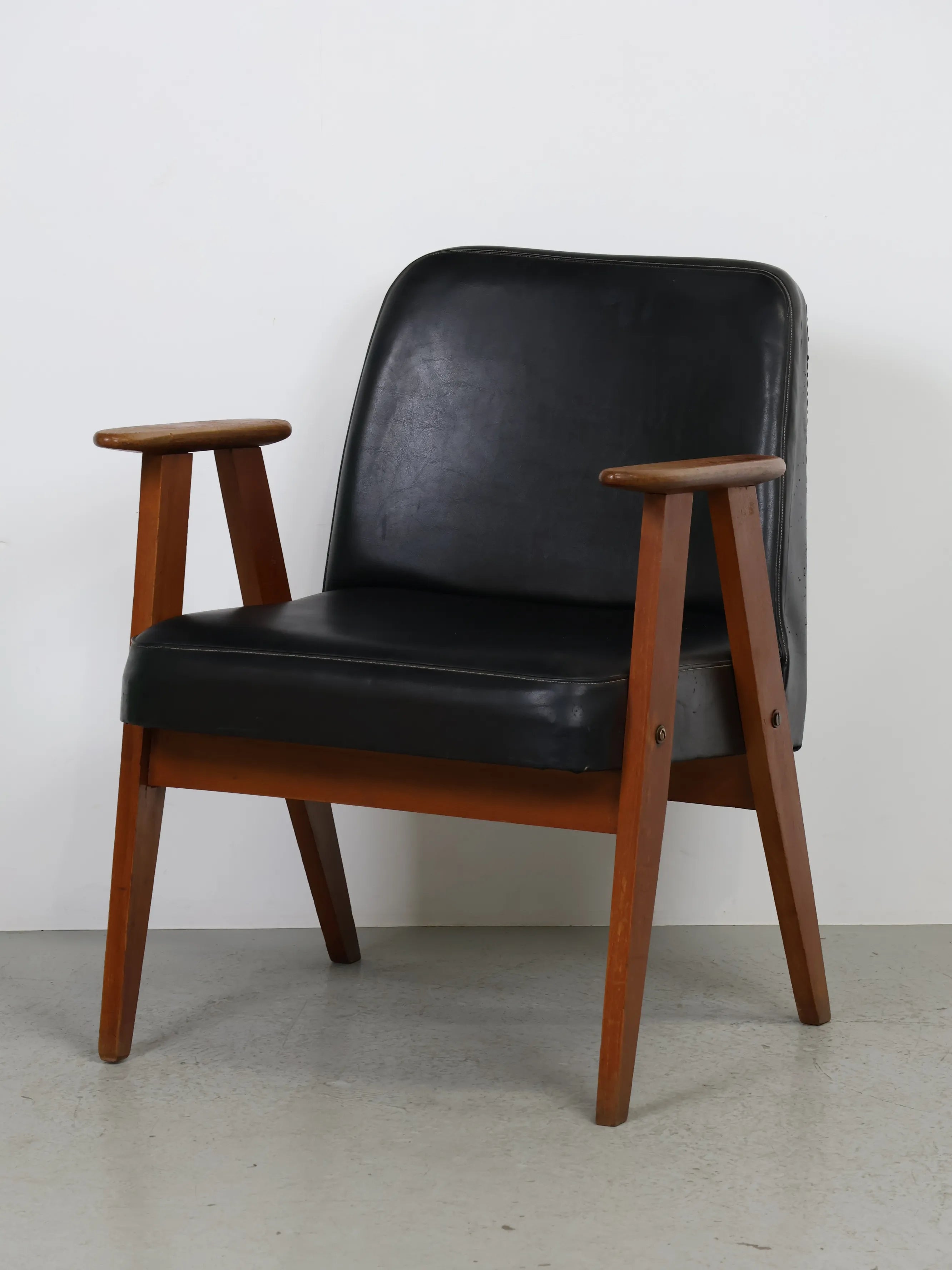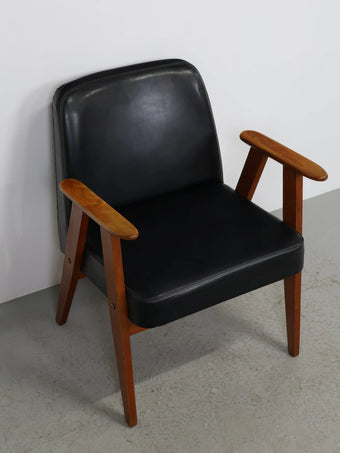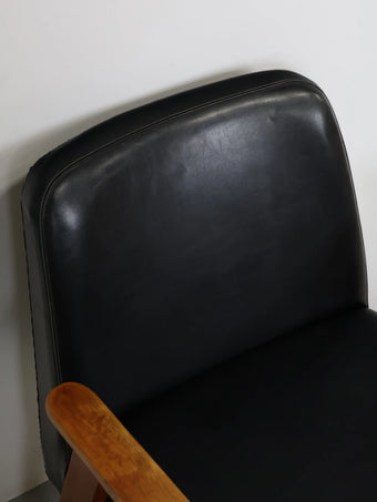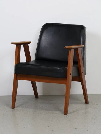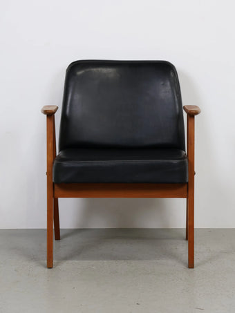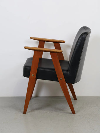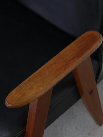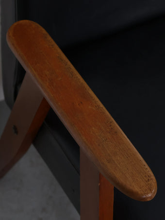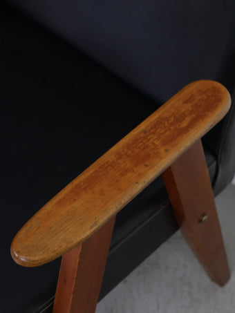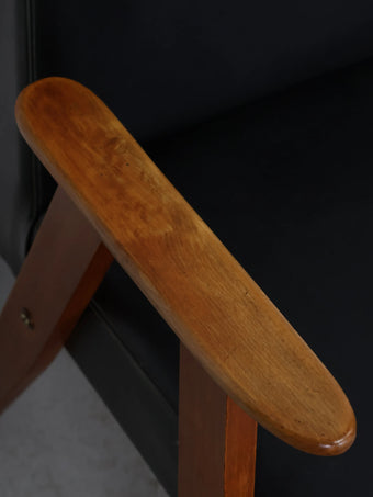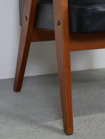 直線的な木製フレームに、ブラックのビニールレザーシートを組み合わせたミッドセンチュリーモダンスタイルのアームチェア。