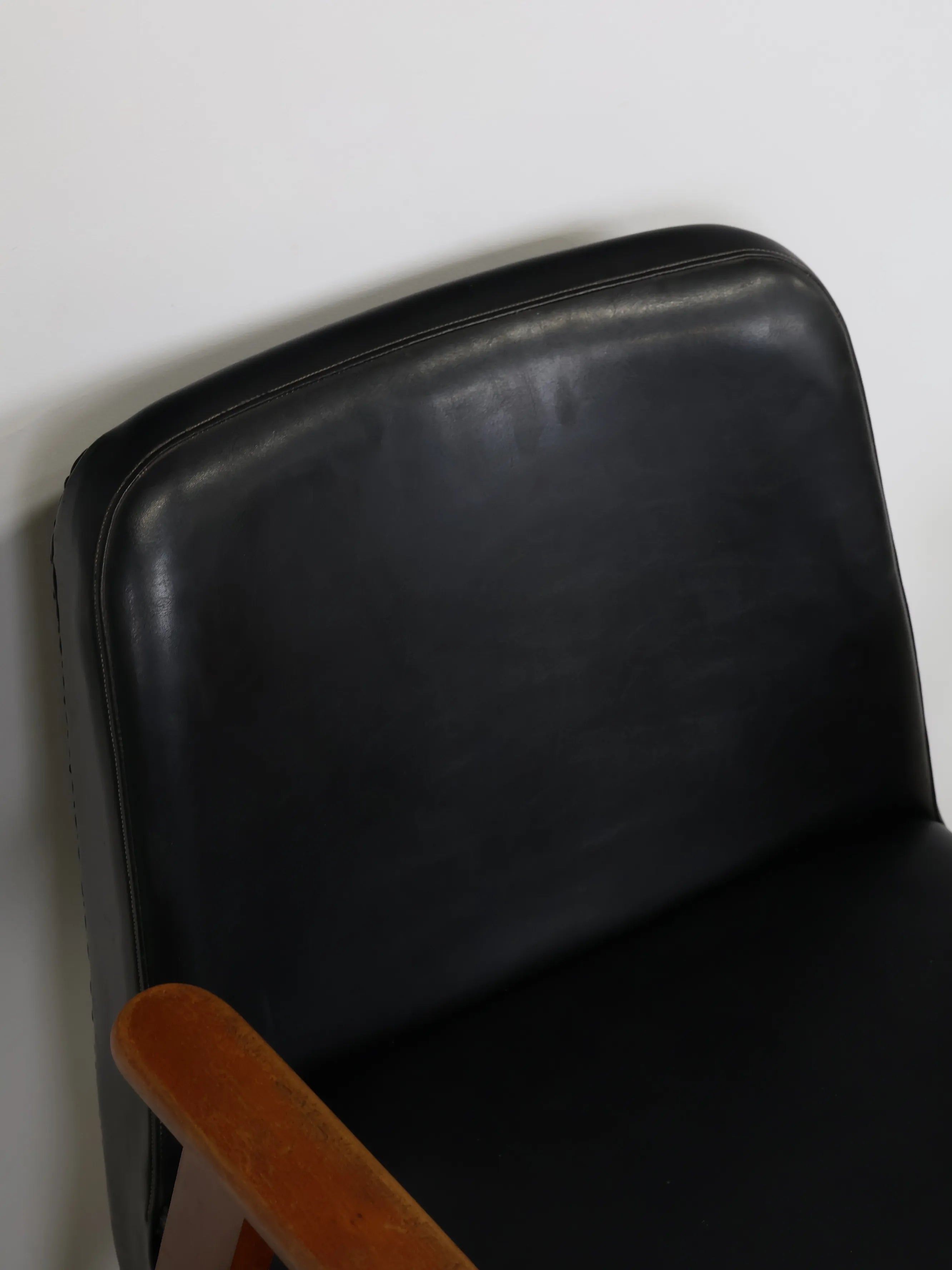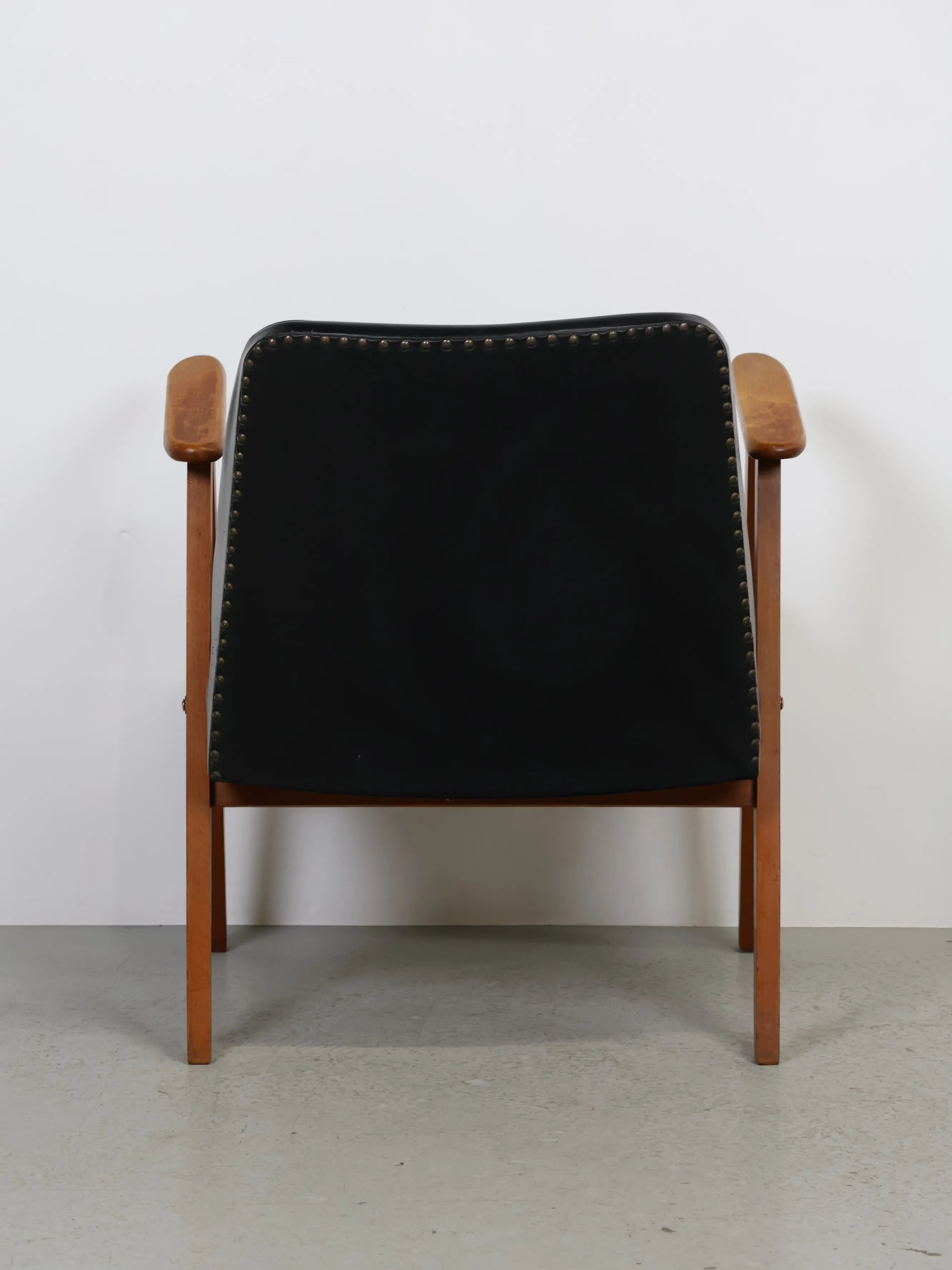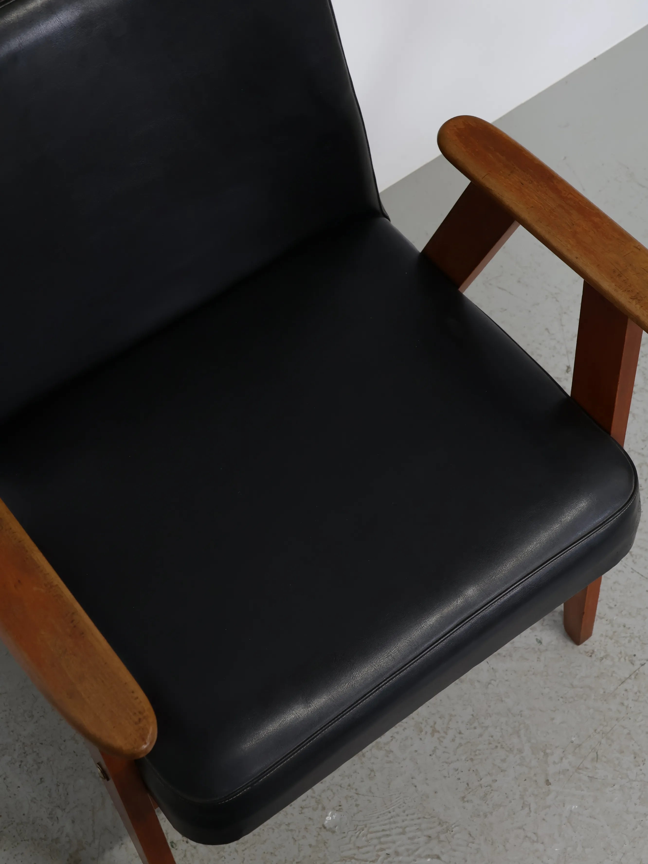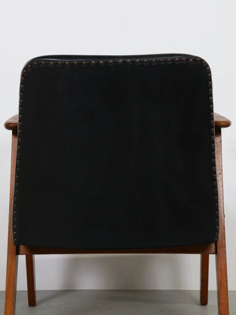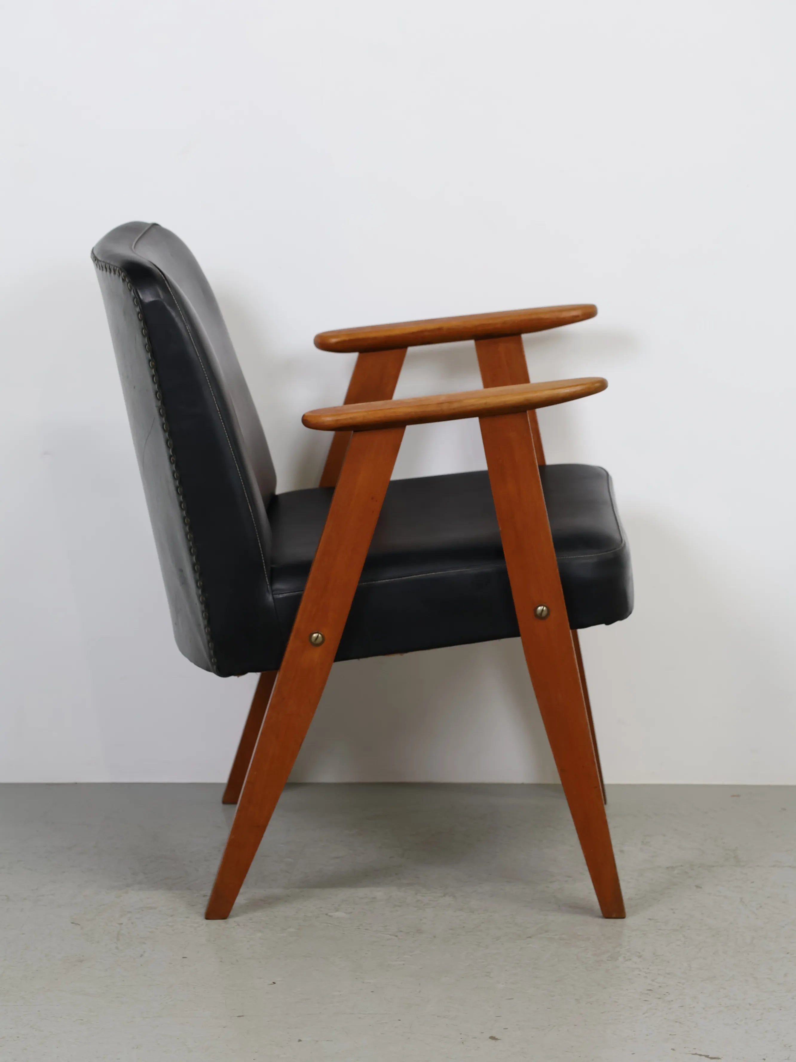 直線的な木製フレームに、ブラックのビニールレザーシートを組み合わせたミッドセンチュリーモダンスタイルのアームチェア。