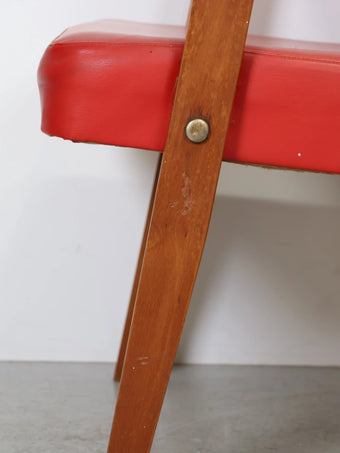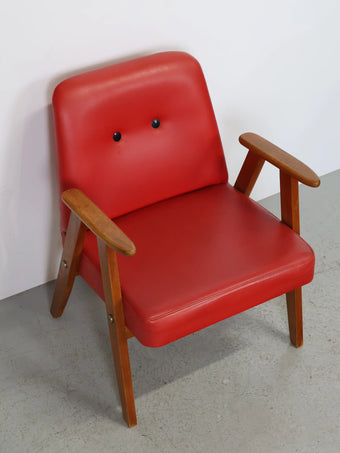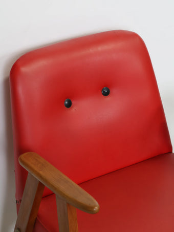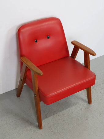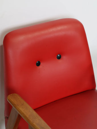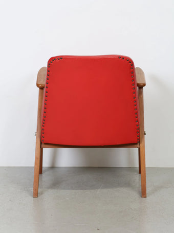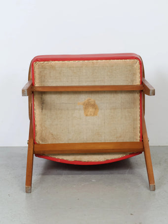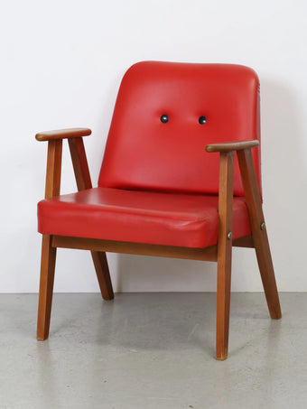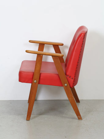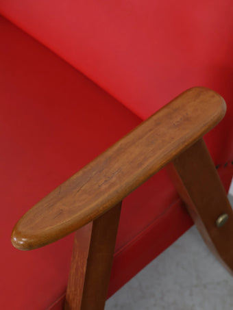 ハンガリーより買い付けました1960年代のヴィンテージウッドフレームレッドビニールレザーアームチェアです。