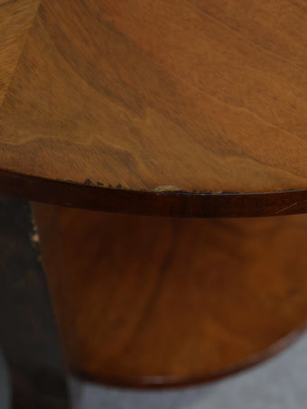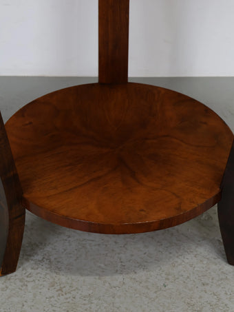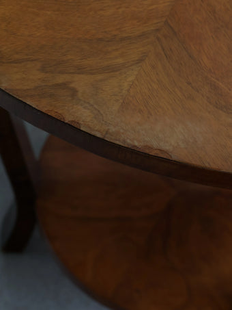 中央支柱から下部のラウンド棚へと繋がる構造も特徴的で、ディスプレイ台としてはもちろん、ソファ横のサイドテーブルや花台、ランプテーブルとしてもおすすめ。